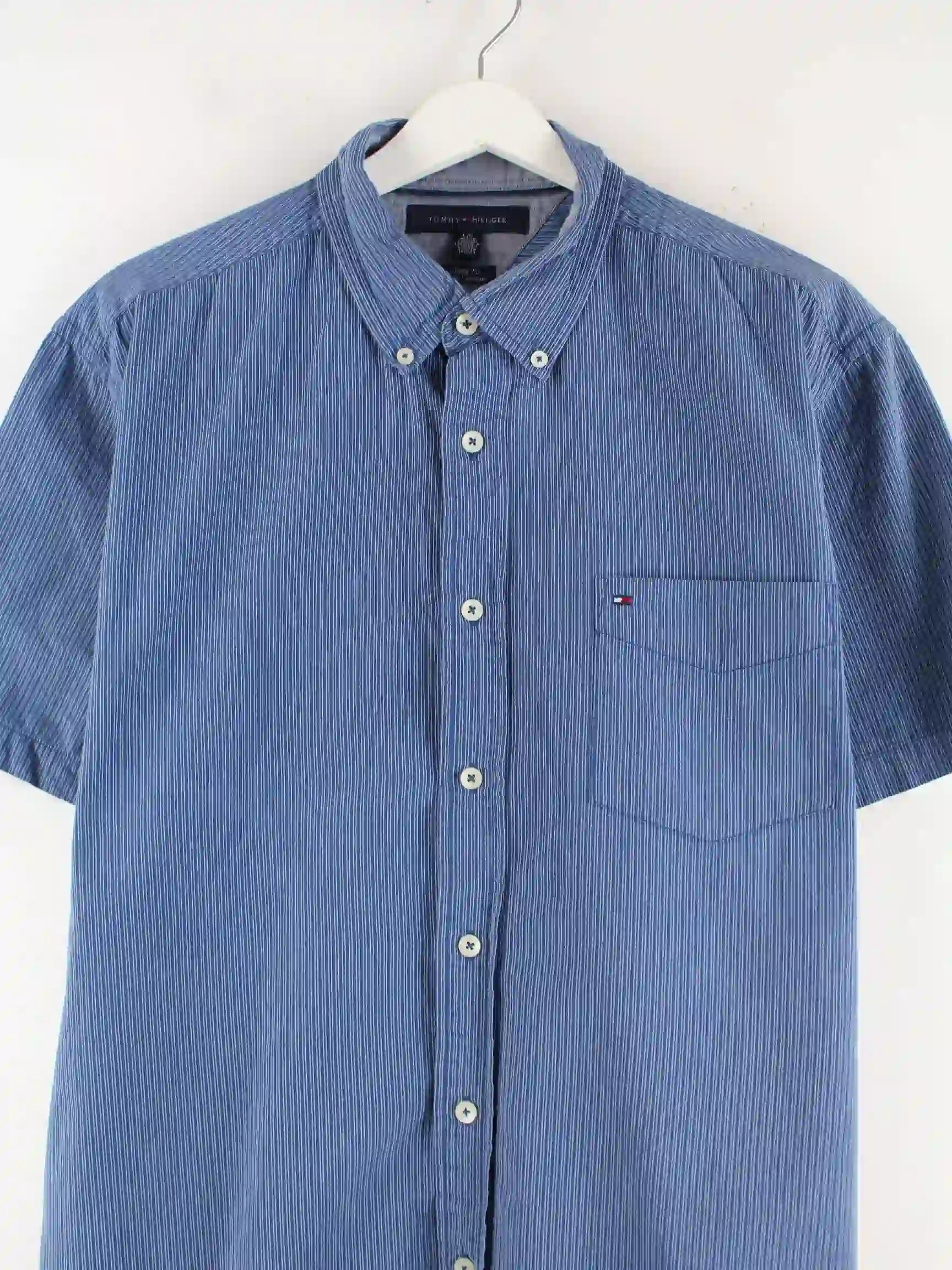 Hemd der Marke Tommy Hilfiger in Größe L. Es ist aus Baumwolle angefertigt und in Blau bei uns vorrätig.