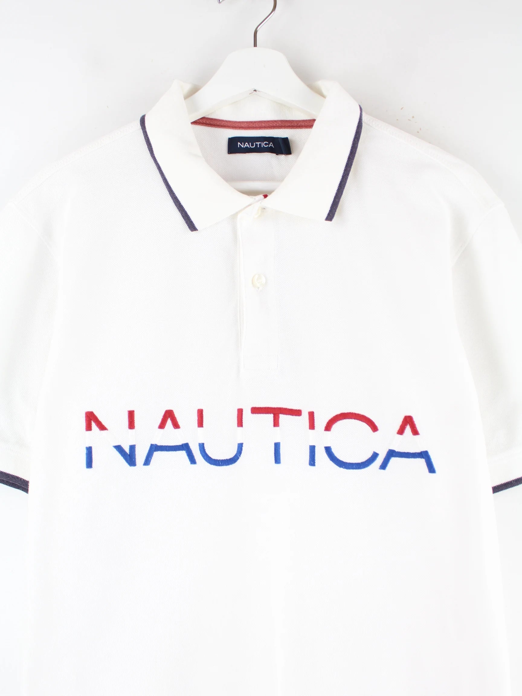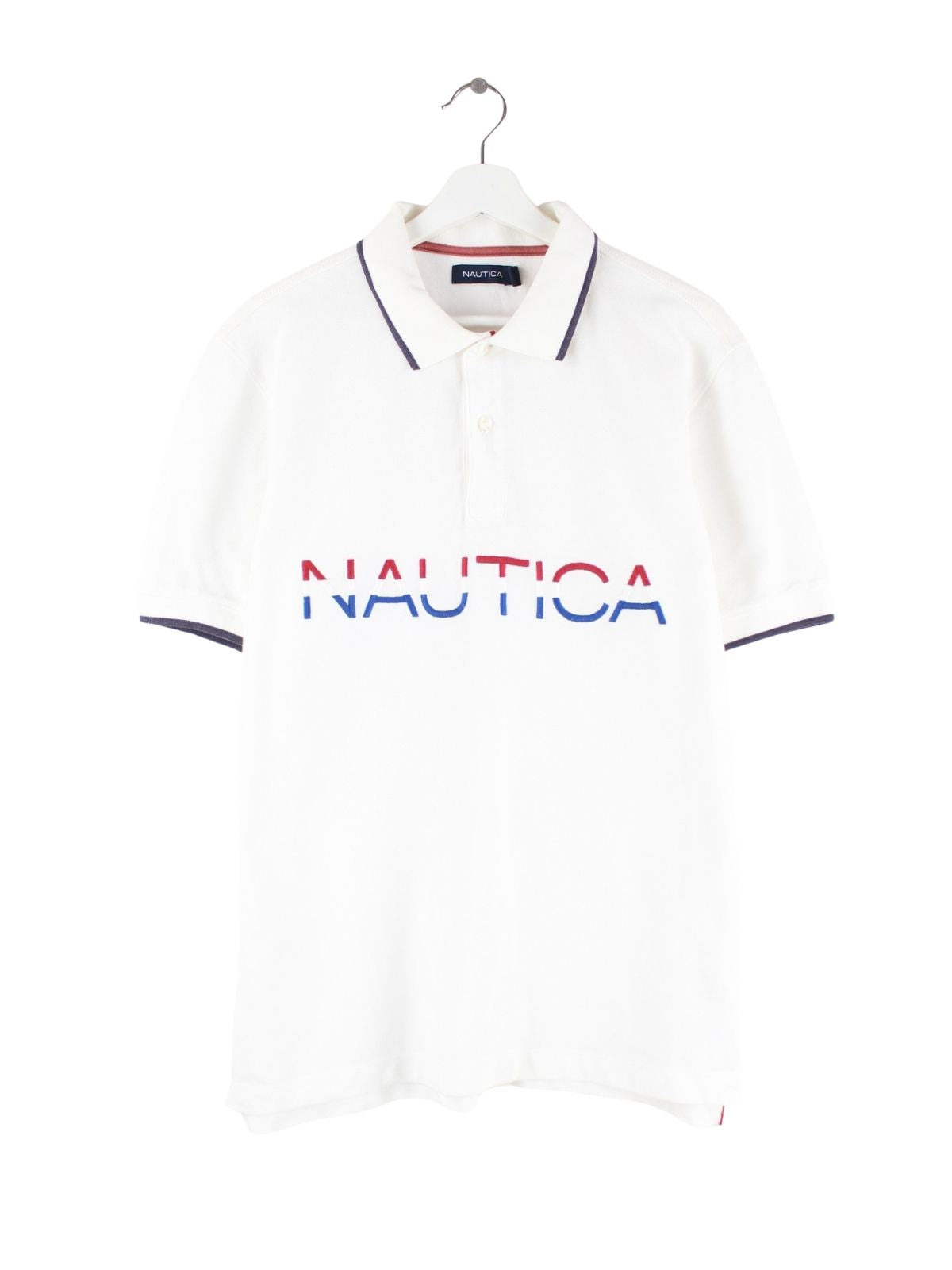 Poloshirt vom Label Nautica mit Stickereien in Größe L. Es ist aus Baumwolle gemacht und in Weiß lieferbar.