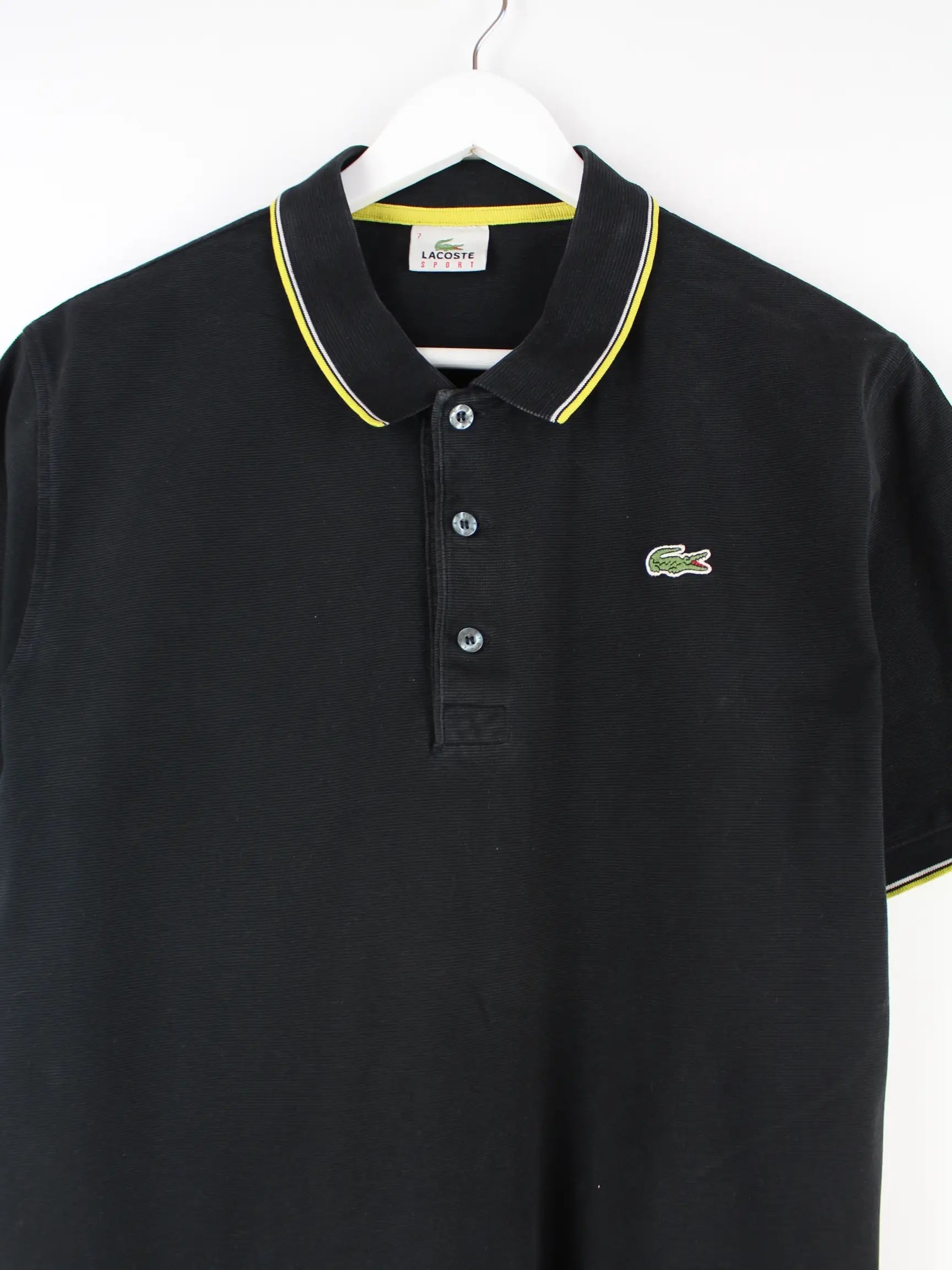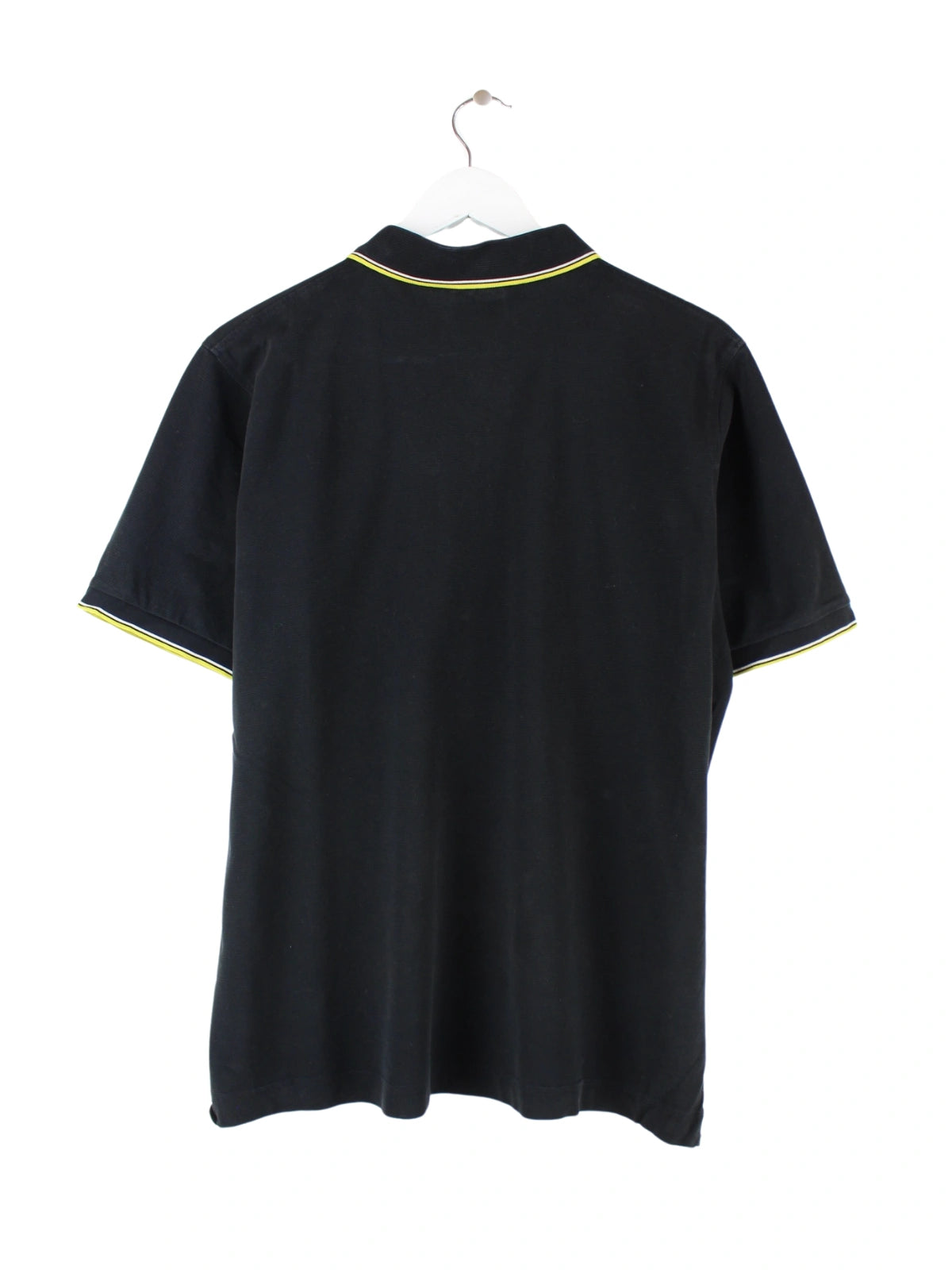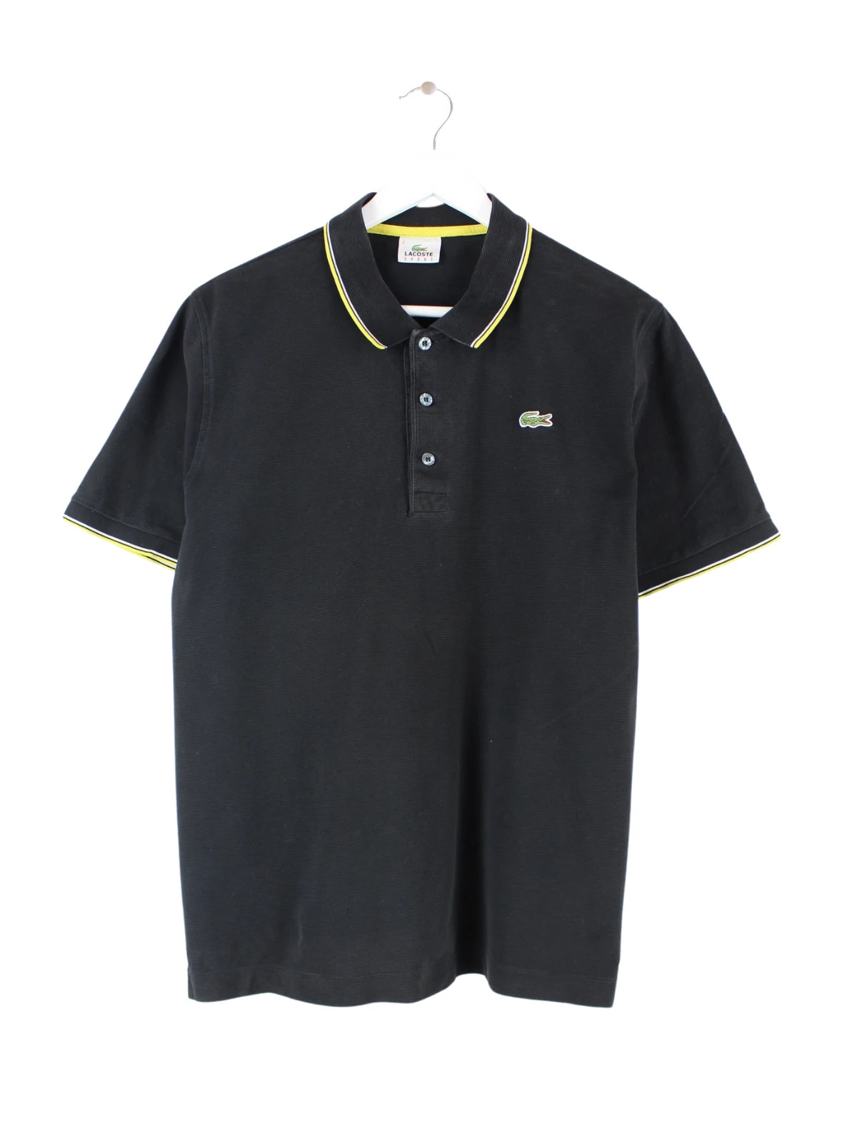 Schwarzes Poloshirt der Marke Lacoste in Größe L. Es ist aus Baumwolle gefertigt und in gutem Zustand zu haben.