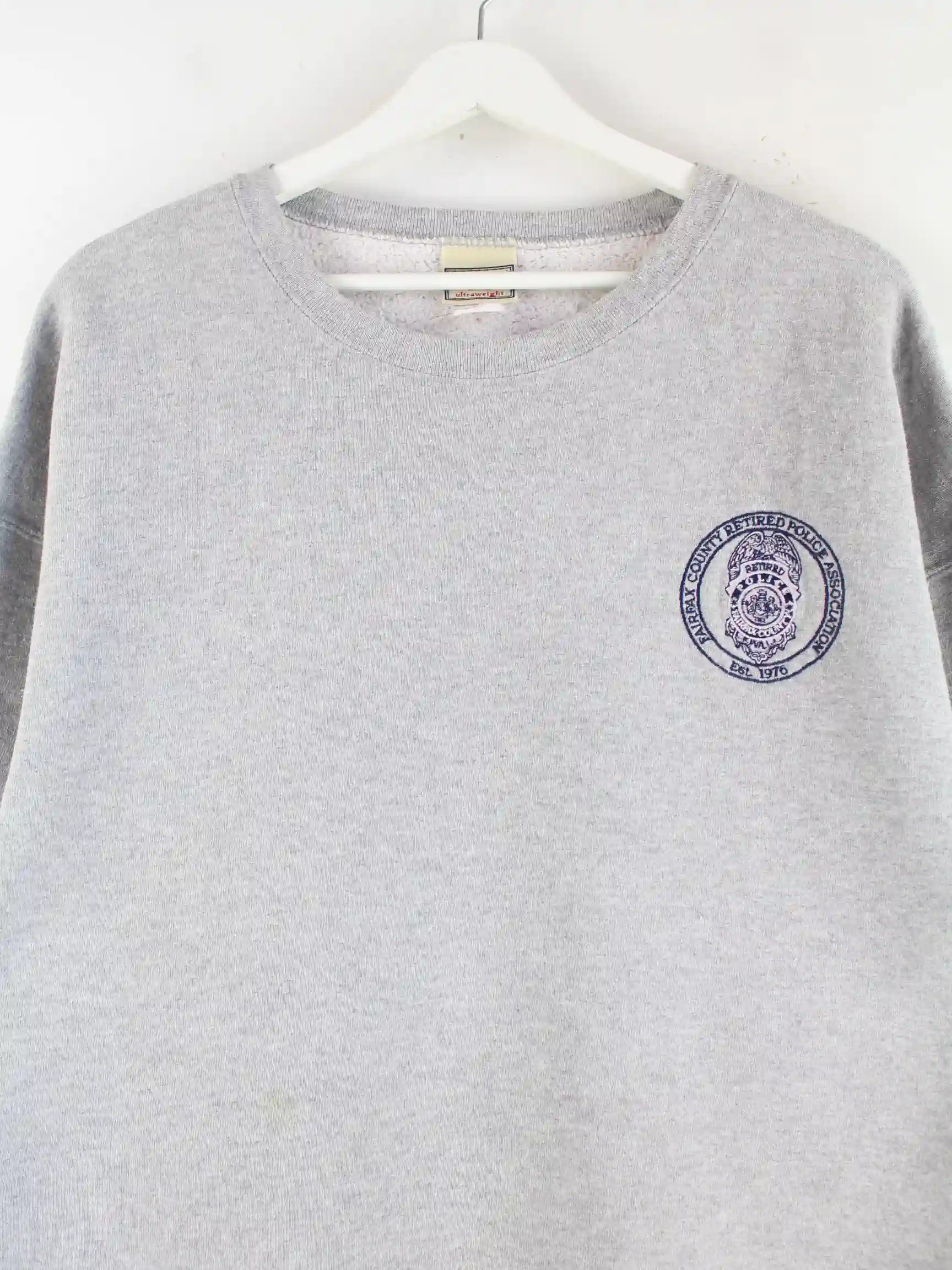 Grauer Sweater mit gestickten Motiven des Labels Lee in Größe XXL. Er ist aus einer Baumwollmischung produziert und in gutem Zustand in Stock.