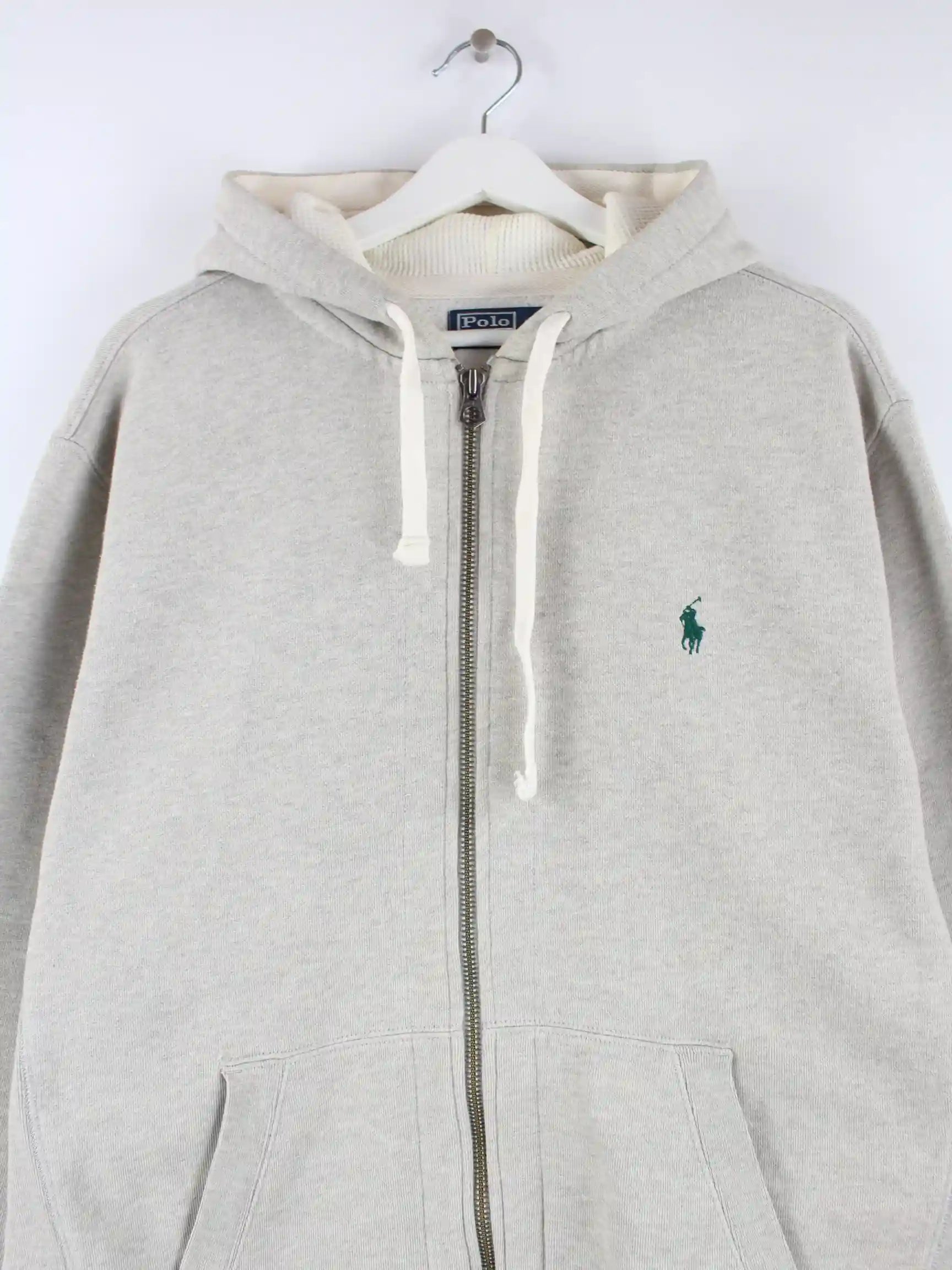 Grauer Hoodie mit durchgehendem Reißverschluß von Ralph Lauren in Größe L. Er ist aus einer Baumwollmischung produziert und in gutem Zustand vorrätig.