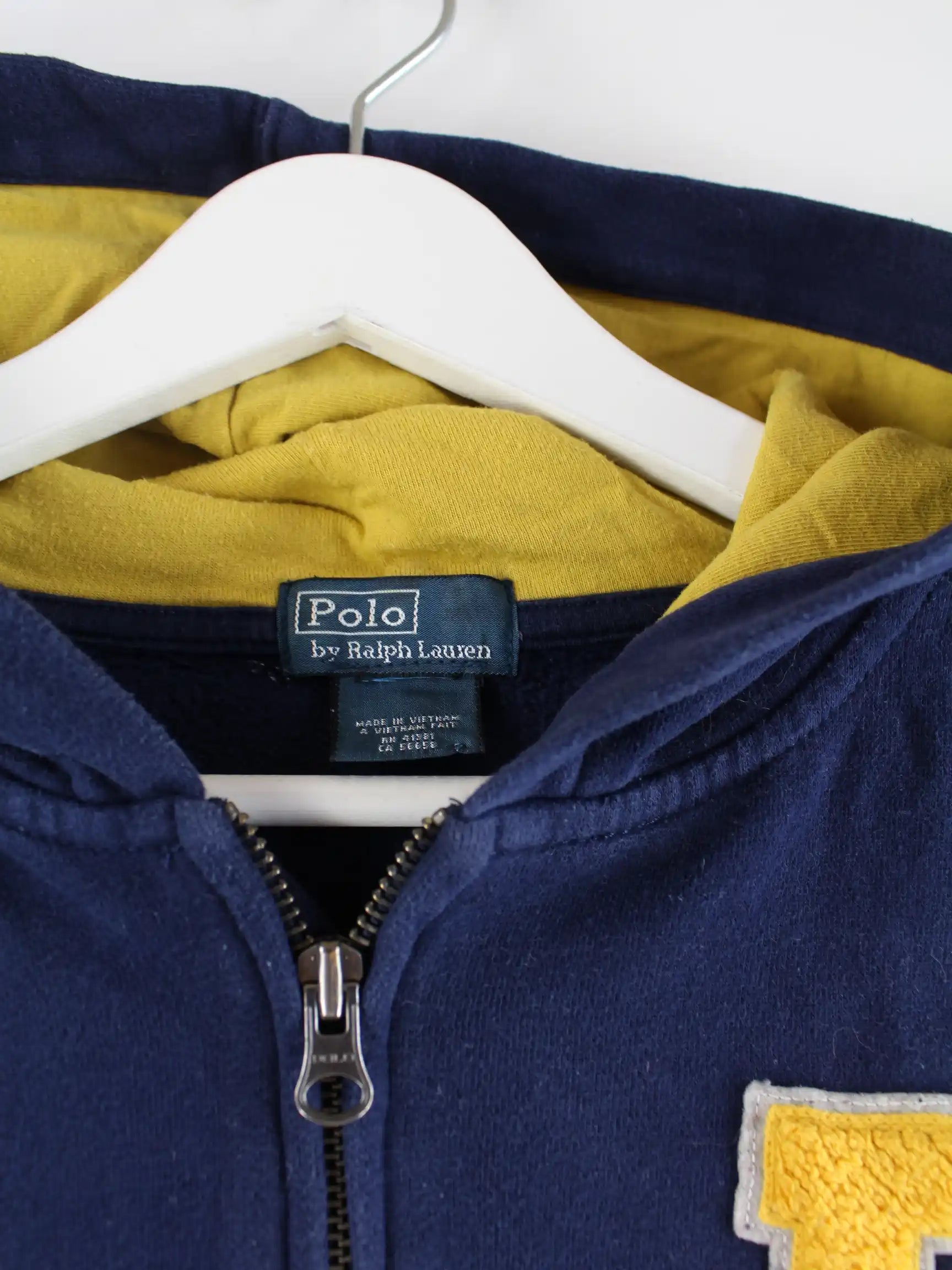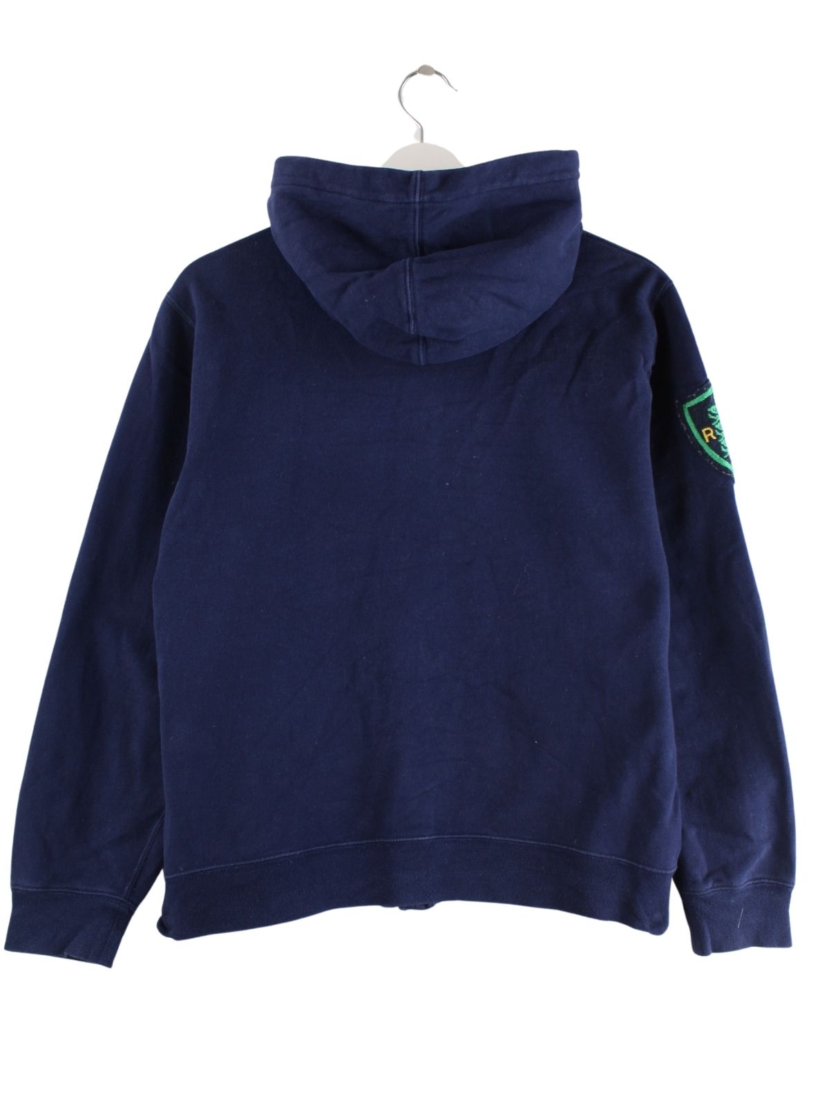 Blauer Hoodie mit Stick und durchgehendem Reißverschluß der Marke Ralph Lauren in Größe S. Er ist aus einer Baumwollmischung produziert und in gutem Zustand bei uns zu bekommen.