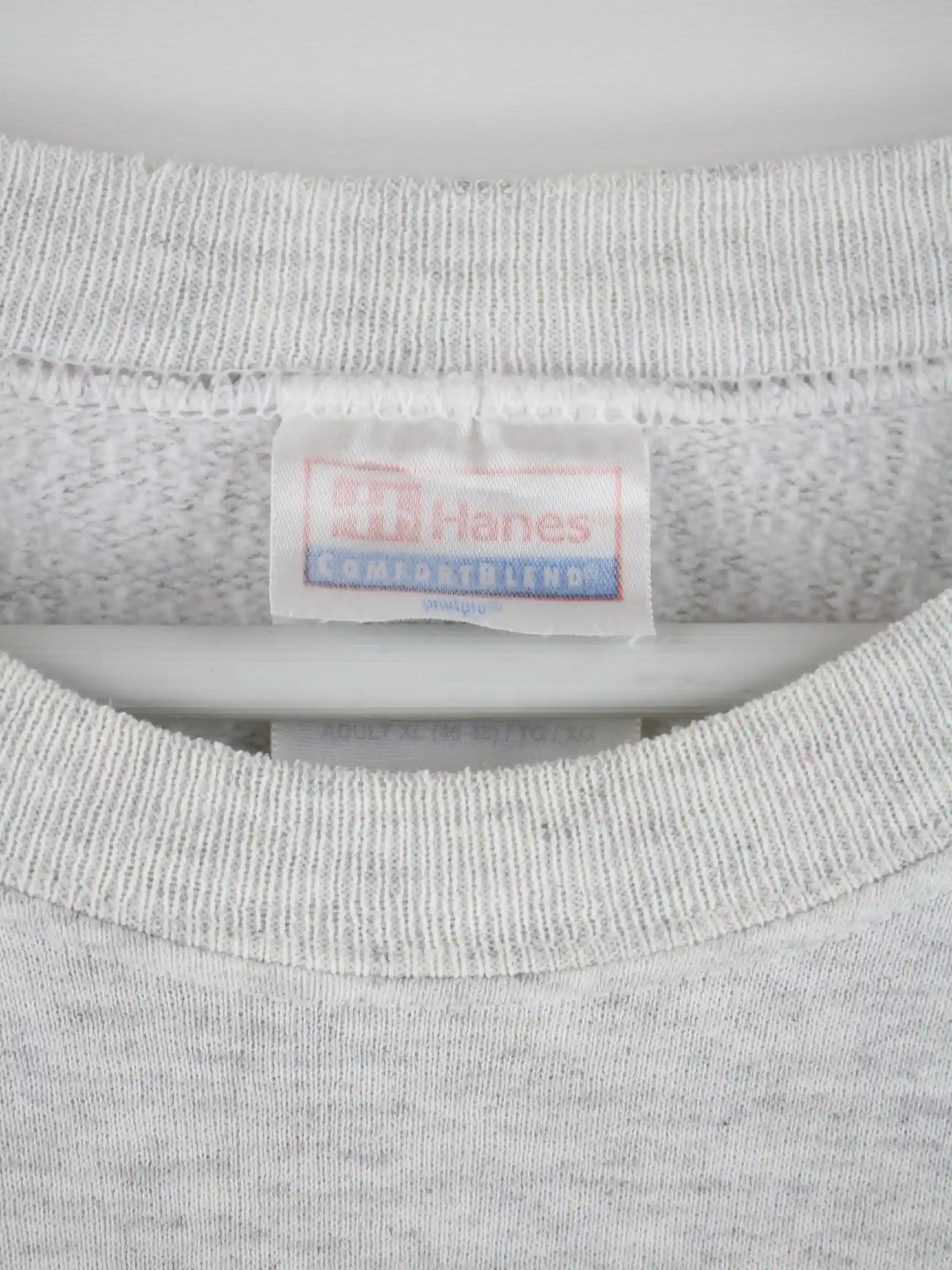 Grauer Sweater des Labels Hanes in Größe M. Er ist aus einer Baumwollmischung produziert und in sehr gutem Zustand im Bestand. Mit schönem Day Print.