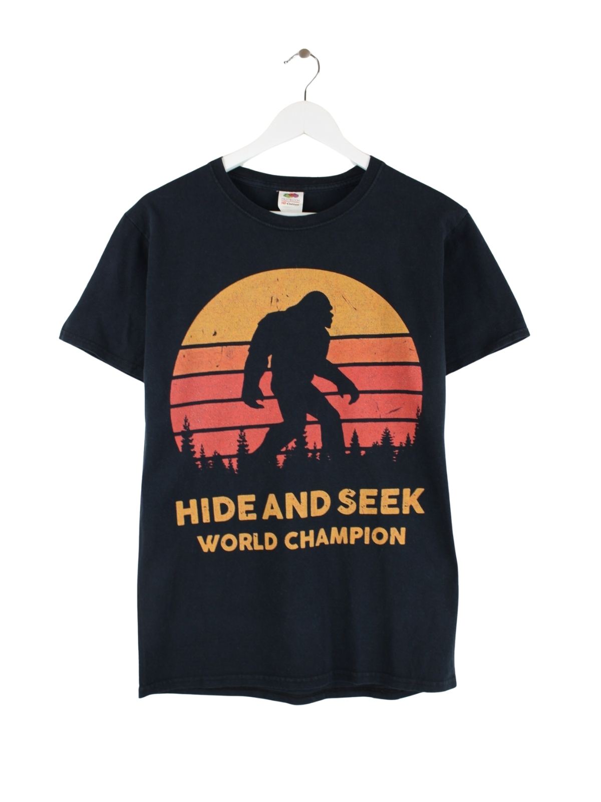 Schwarzes T-Shirt vom Brand Fruit of the Loom in Größe S. Es ist aus Baumwolle gefertigt und in sehr gutem Zustand auf Lager. Mit schönem Funny Print.