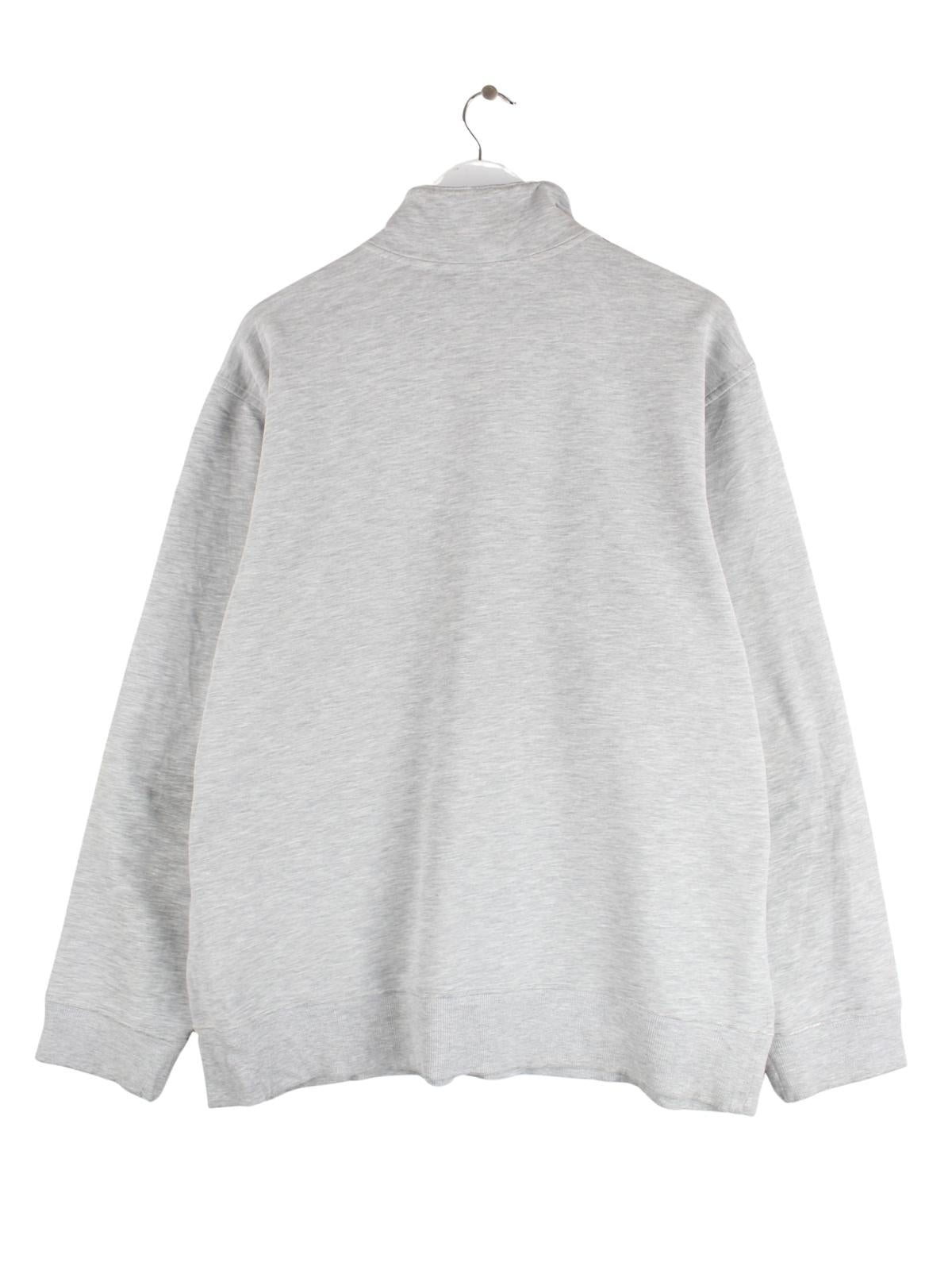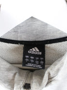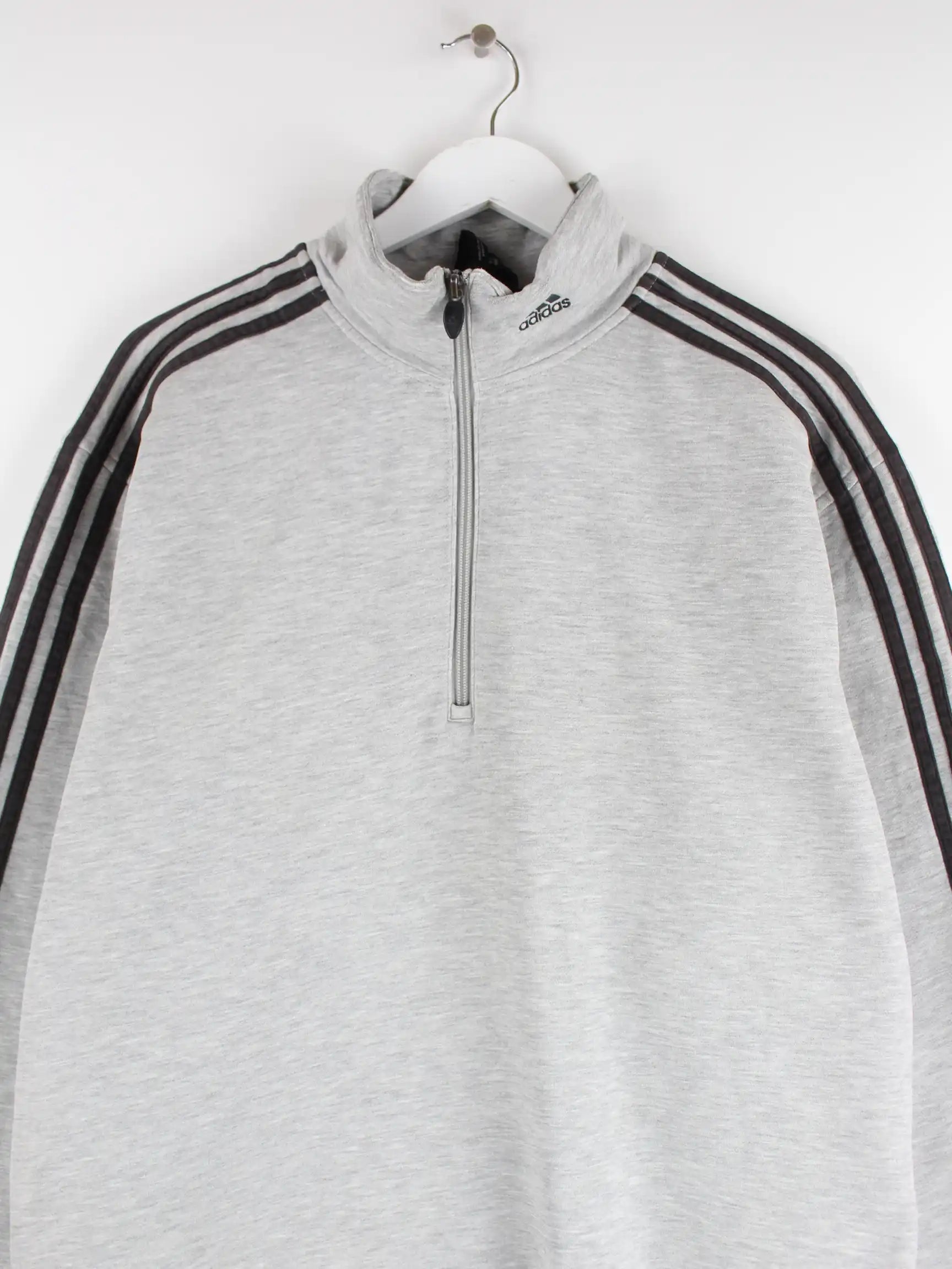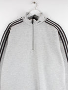 Sweater vom Label Adidas mit kurzem Reißverschluß in Größe L. Er ist aus einer Baumwollmischung gemacht und in Grau vorrätig.