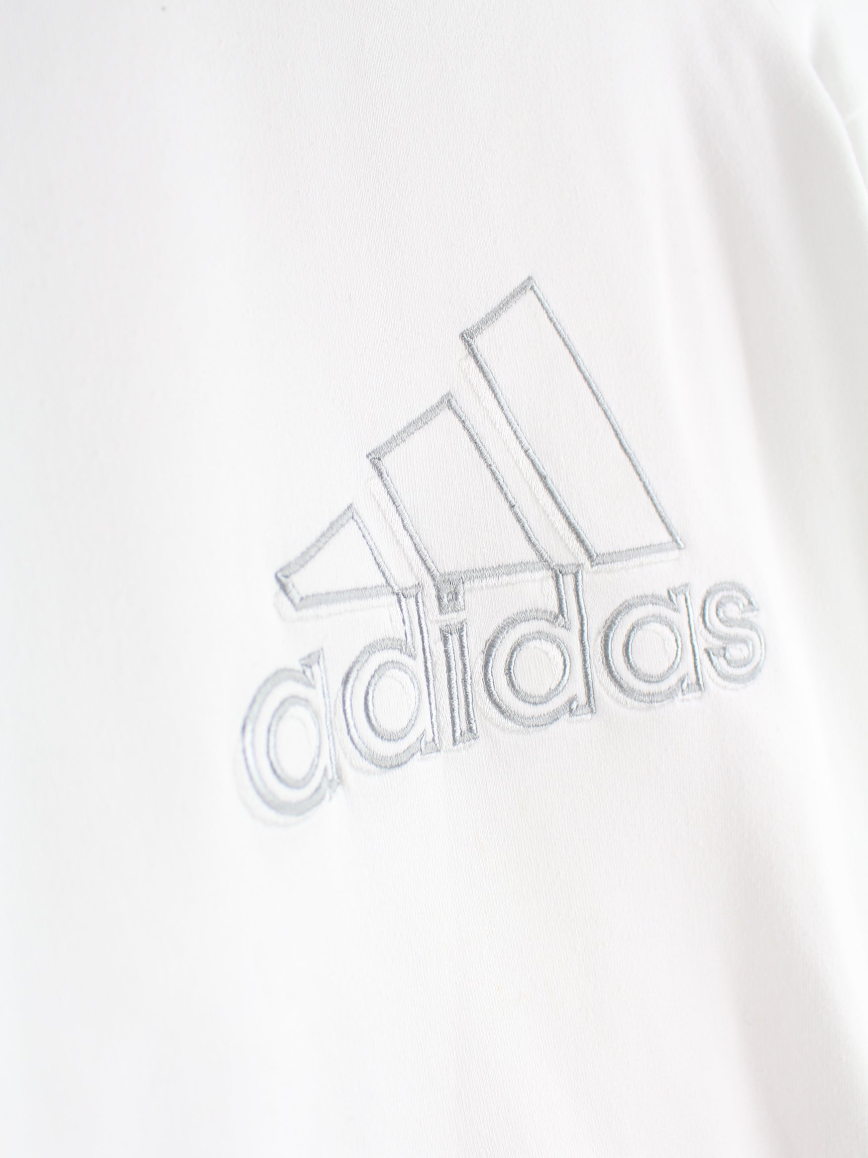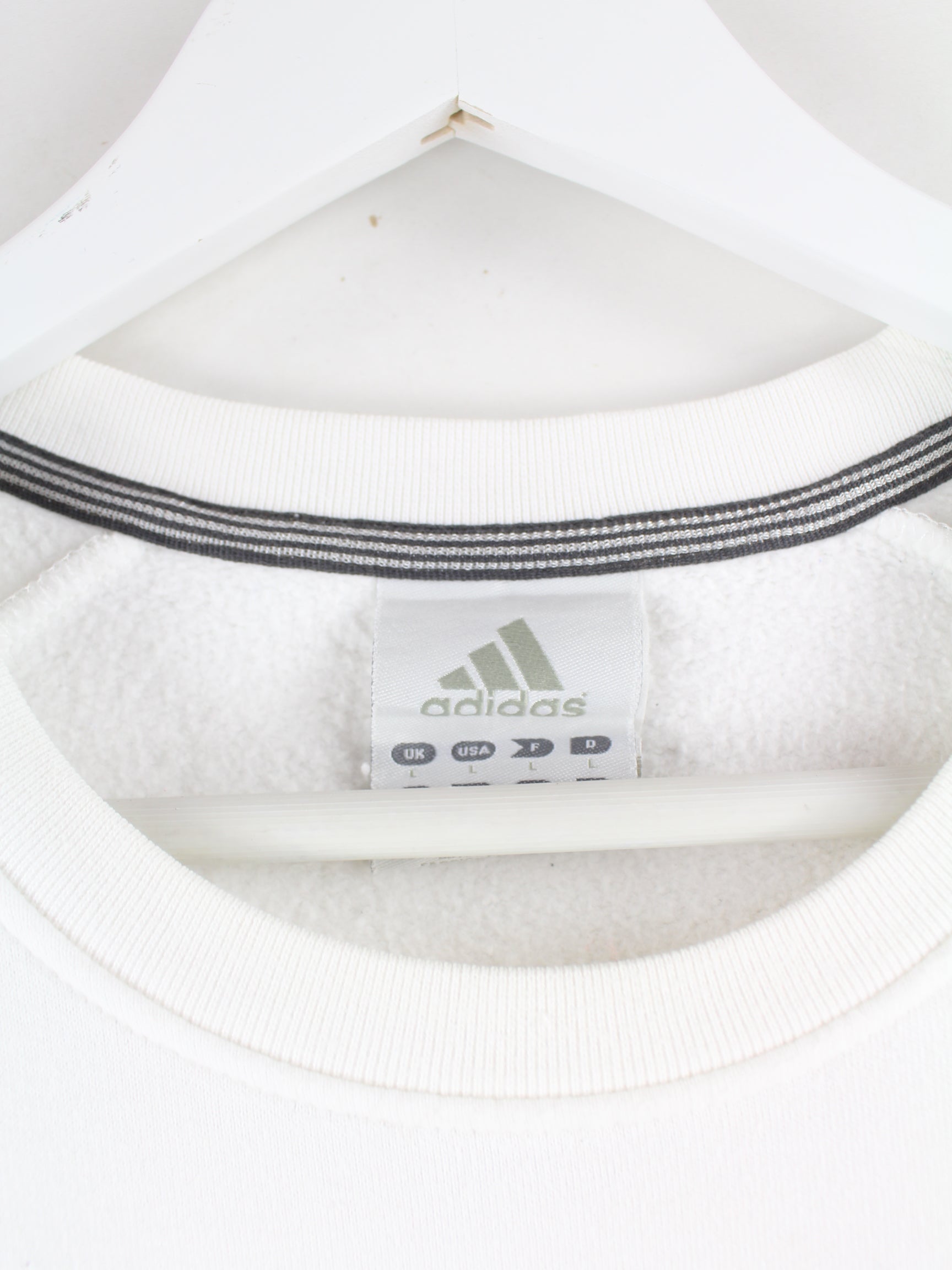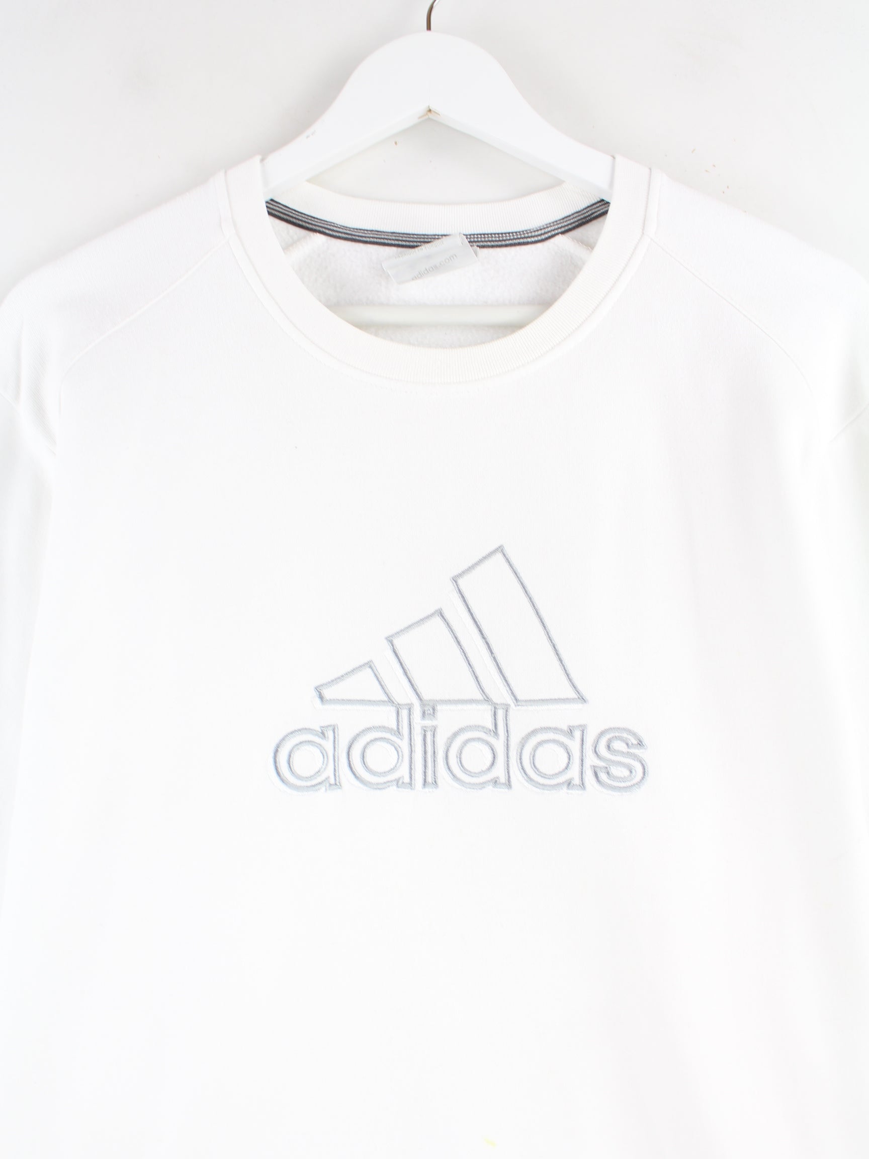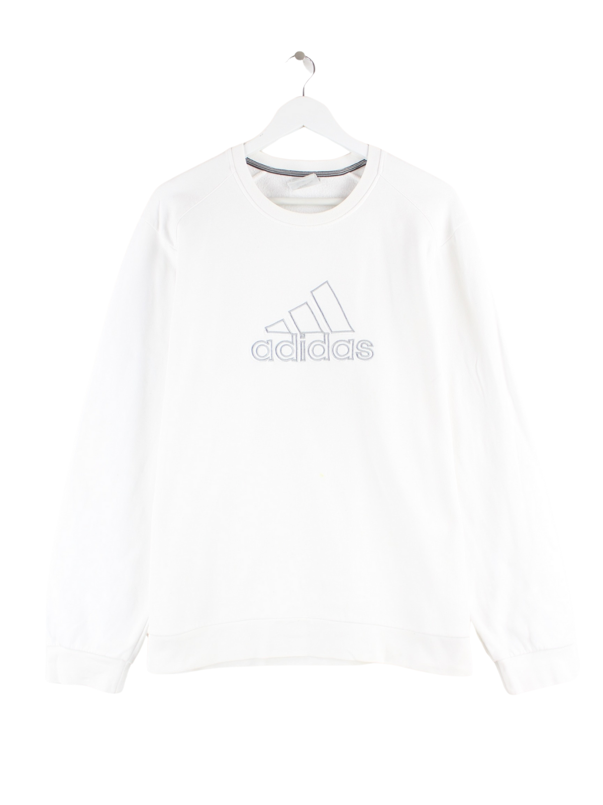 Sweater from the label Adidas with embroidery in size L. It is made of a cotton blend and is available in white.