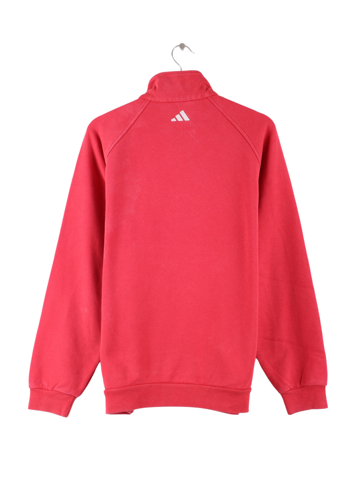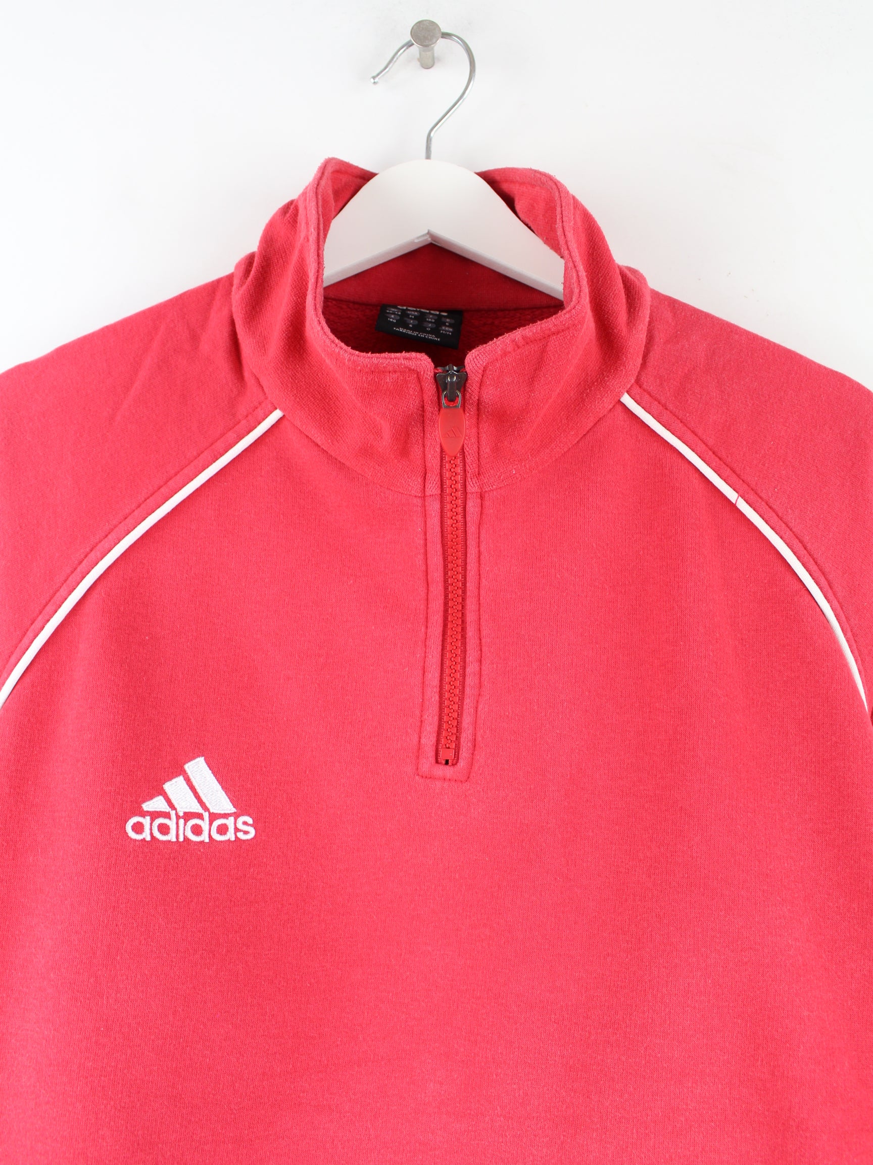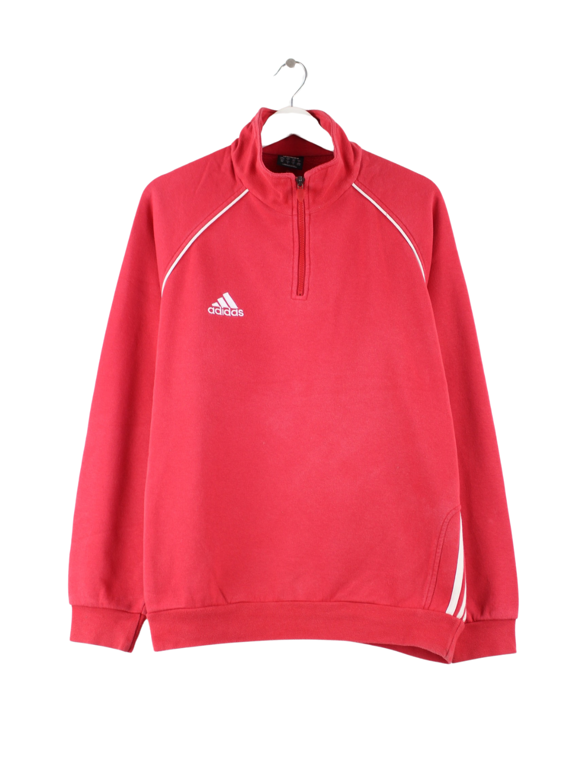 Sweater from the Adidas label with embroidery and half zip in size M. It is made from a cotton blend and is in stock in red.