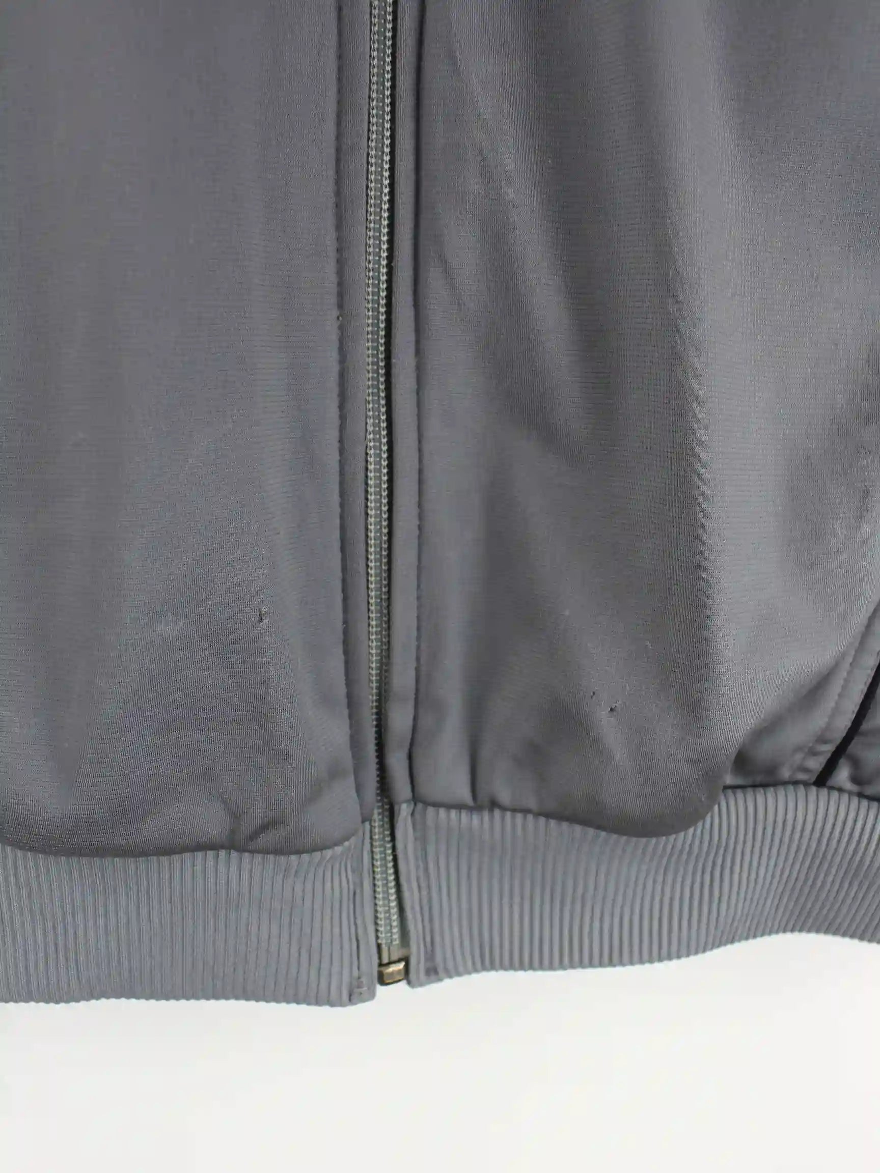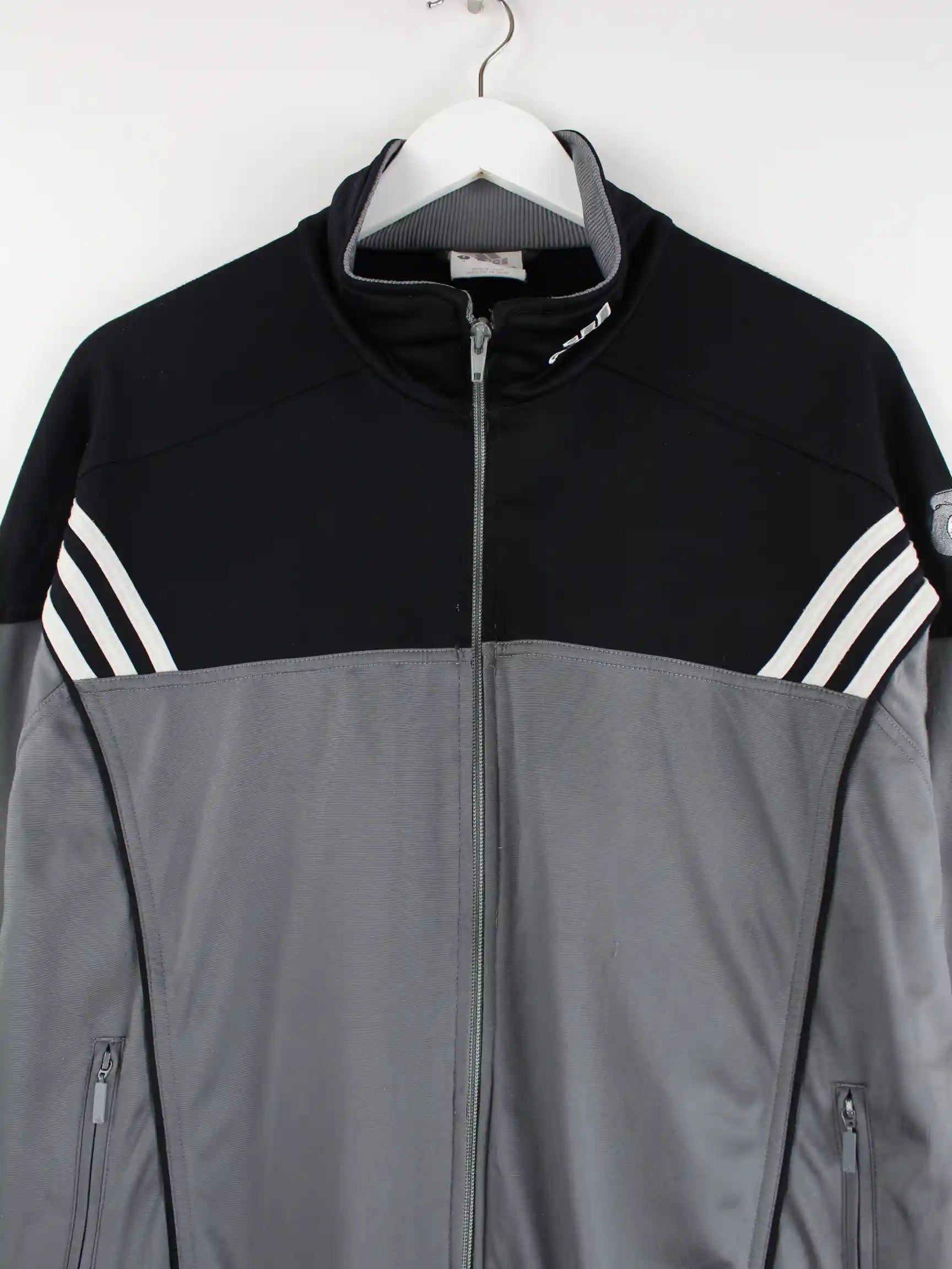 Trainingsjacke von Adidas in Größe M. Sie ist aus Synthetik produziert und in Grau bei uns zu bekommen.