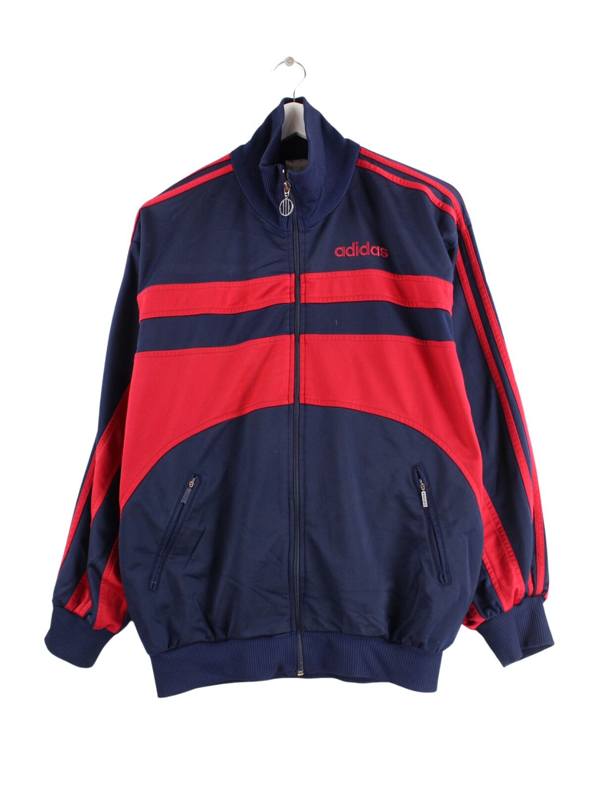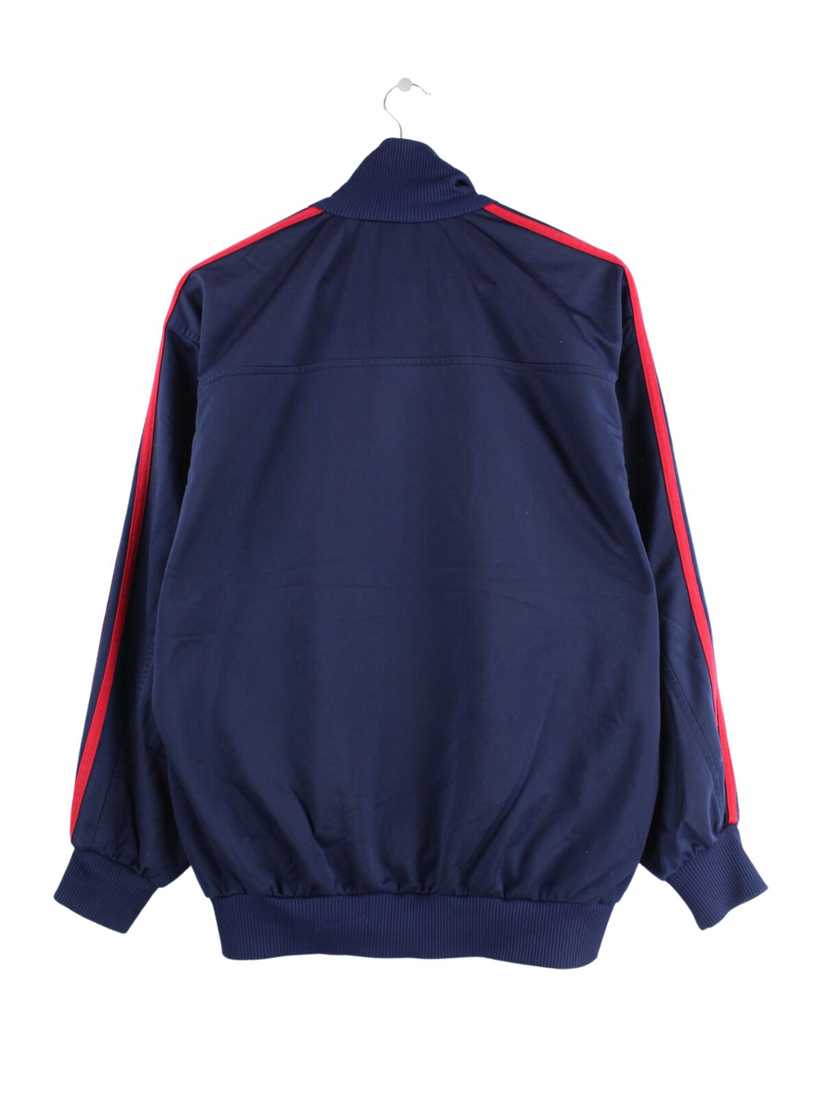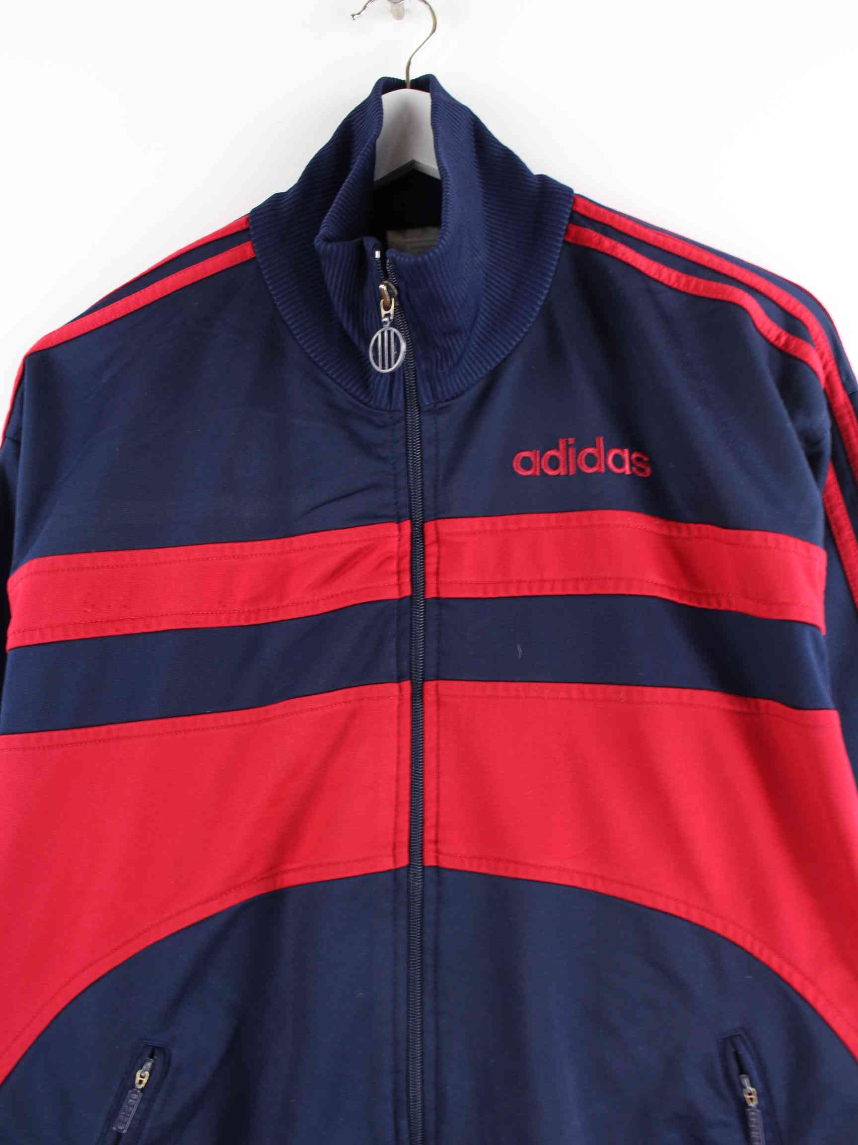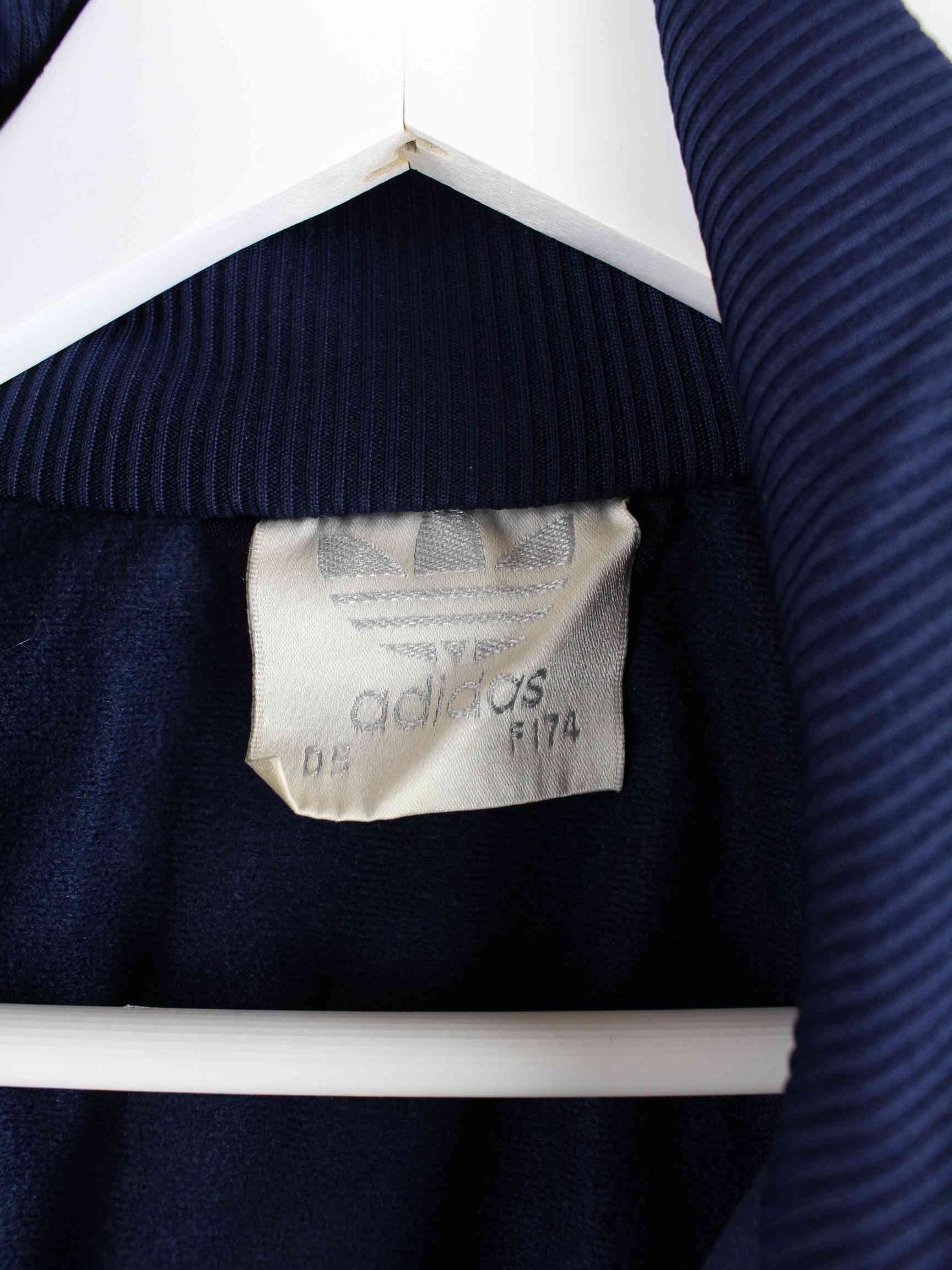 Blue training jacket from the Adidas label from the 80s in size L. It is made of synthetic material and is available from us in very good condition.