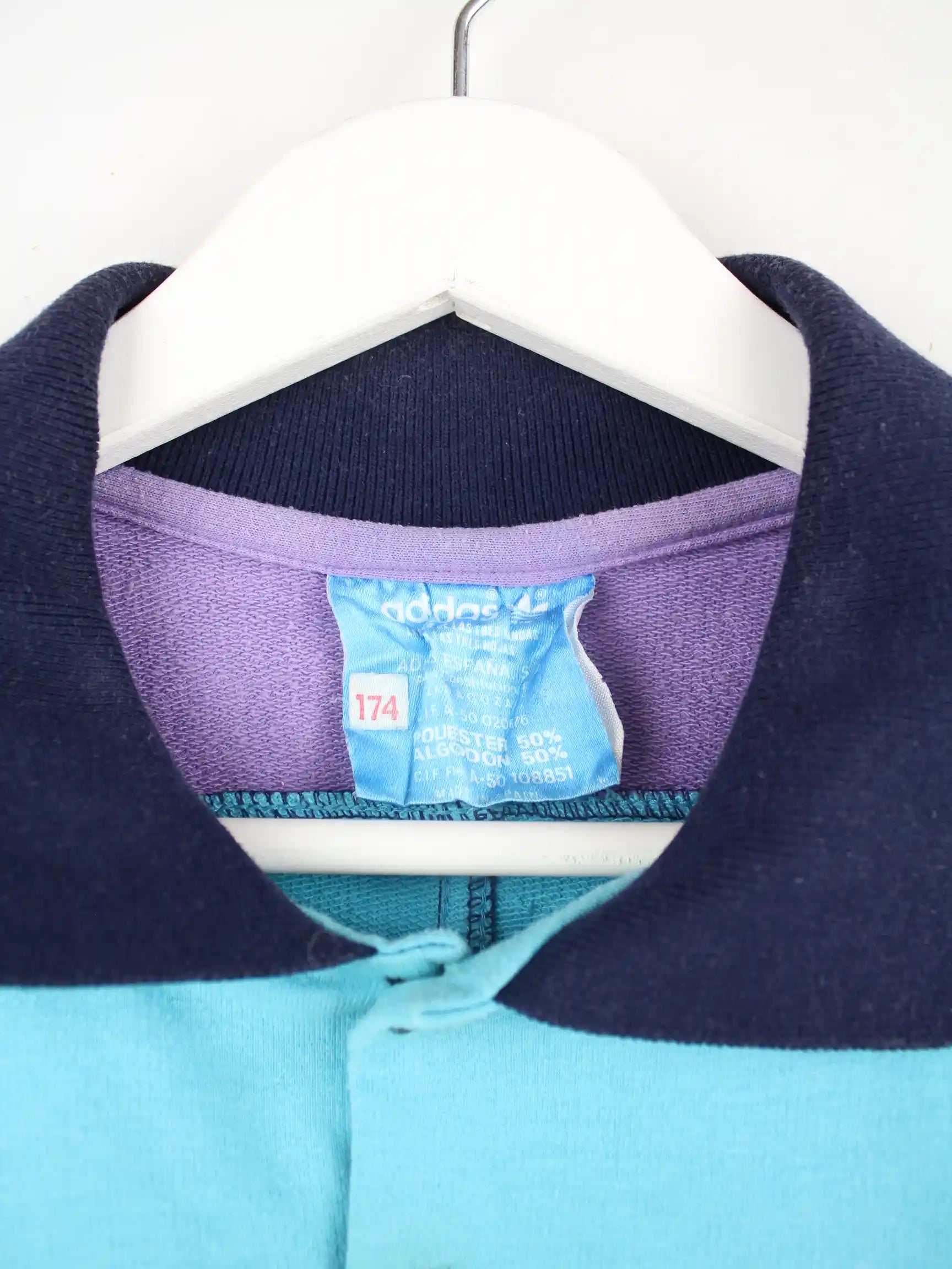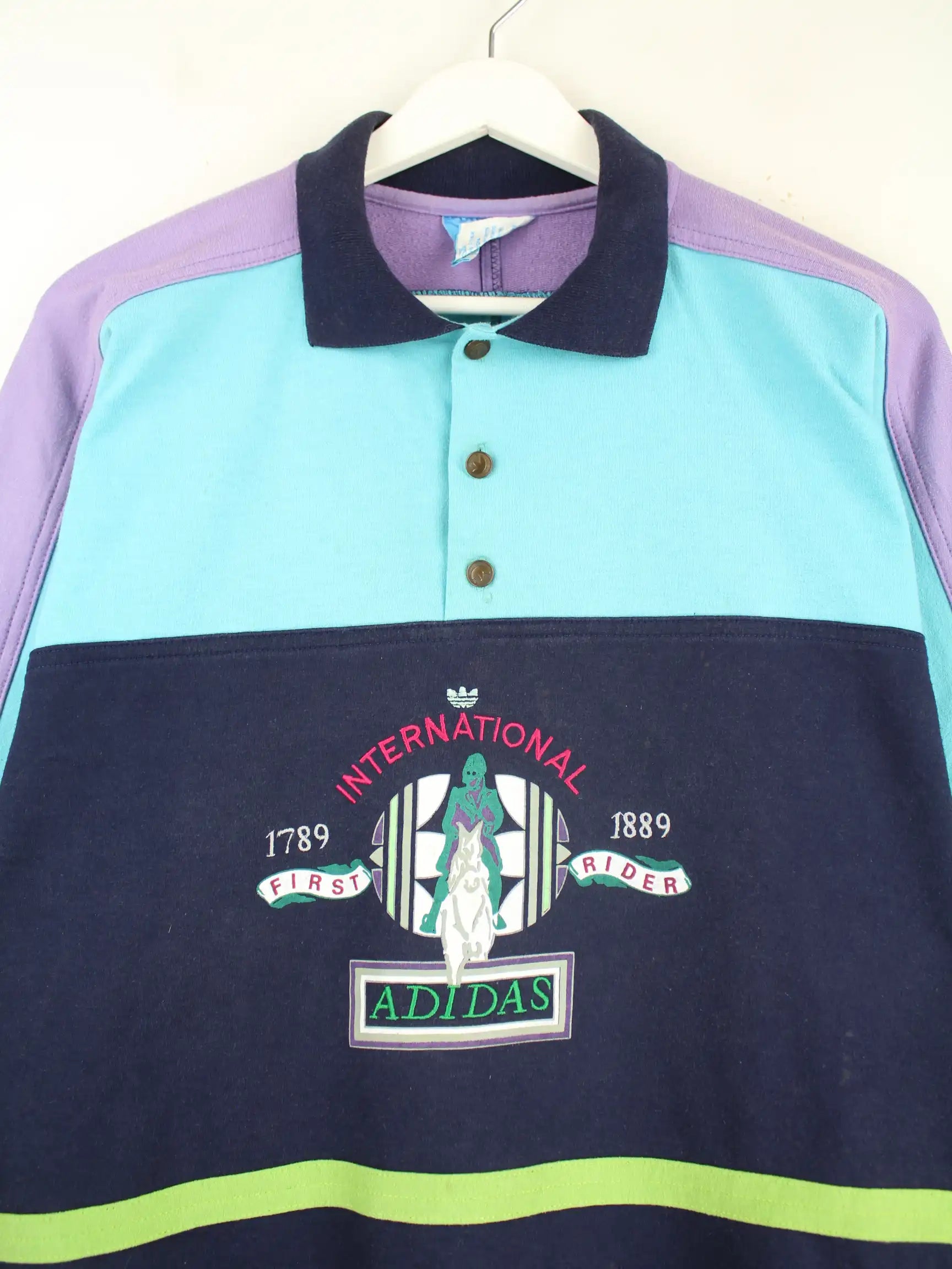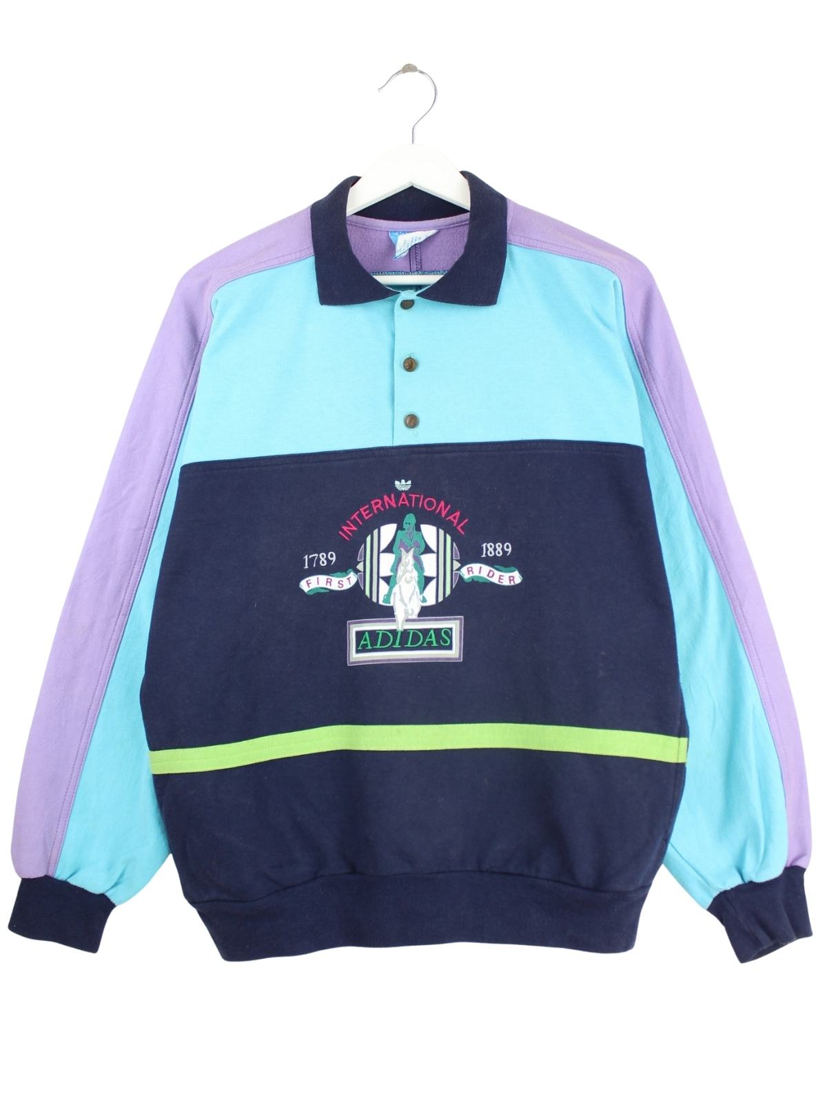 Sweater von Adidas in Größe M aus den 80'ern. Er ist aus einer Baumwollmischung produziert und in Blau bei uns zu bekommen.