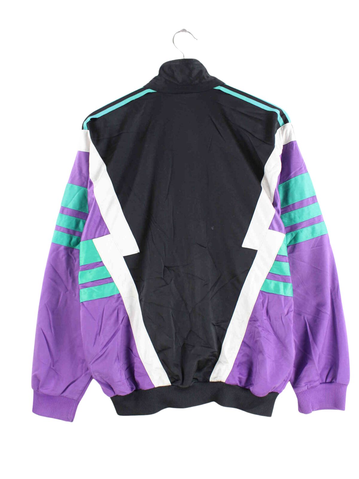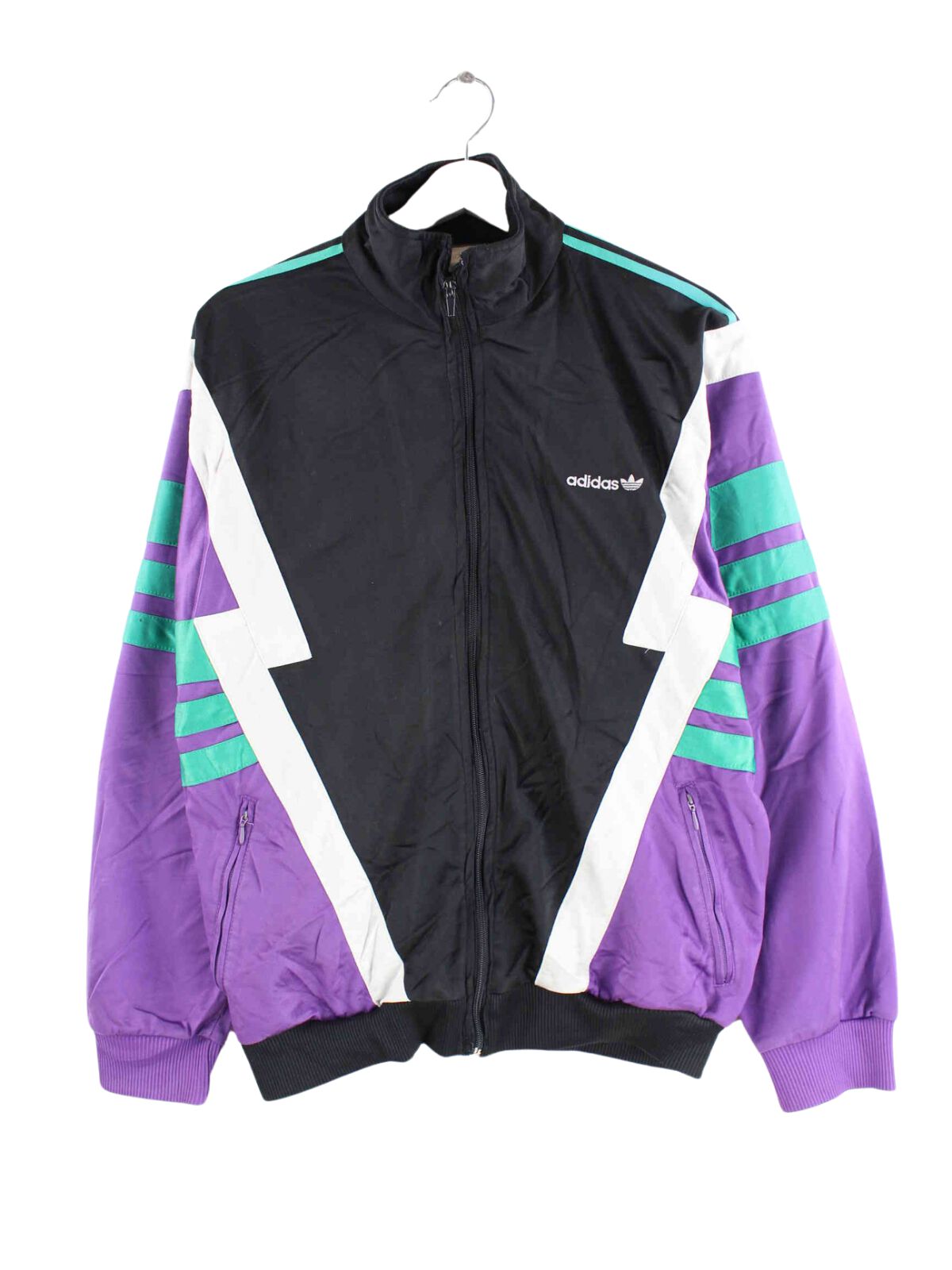 Black training jacket from Adidas from the 80's in size S. It is made of synthetic material and is in stock in good condition.