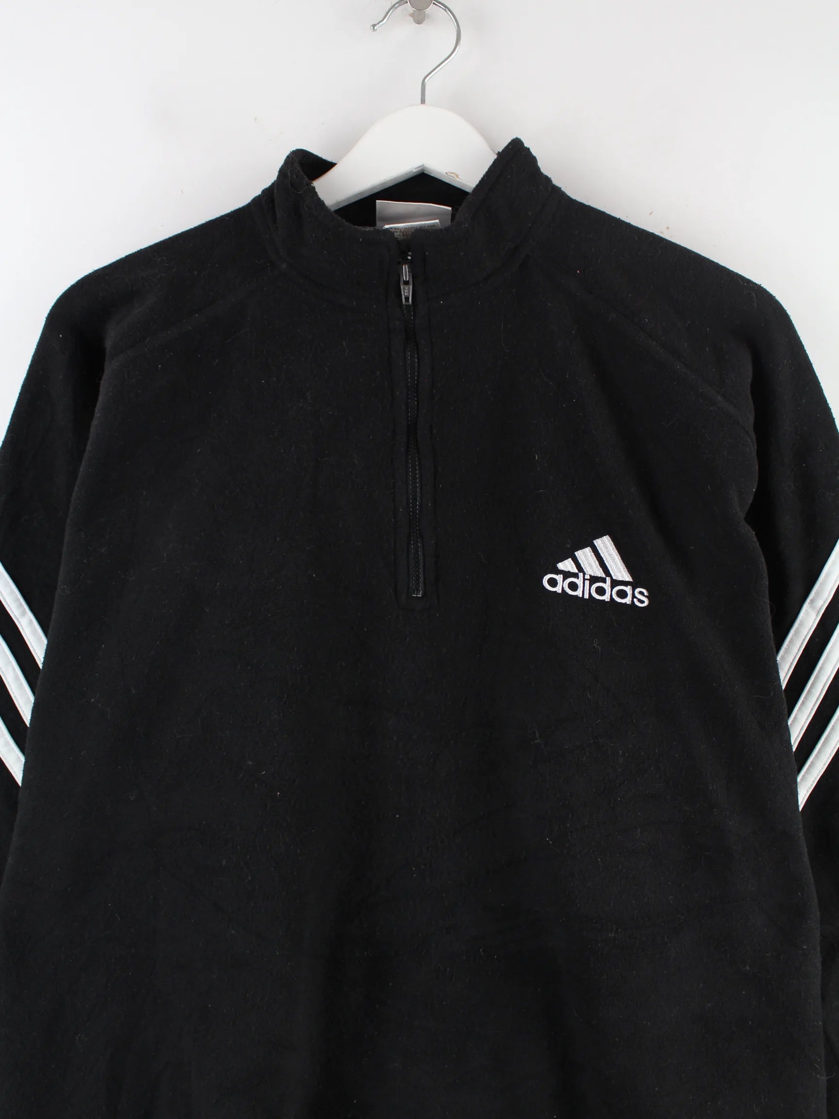 Sweater der Marke Adidas mit kurzem Reißverschluß in Größe M aus den 90'ern. Er ist aus weichem Fleece gefertigt und in Schwarz im Angebot.
