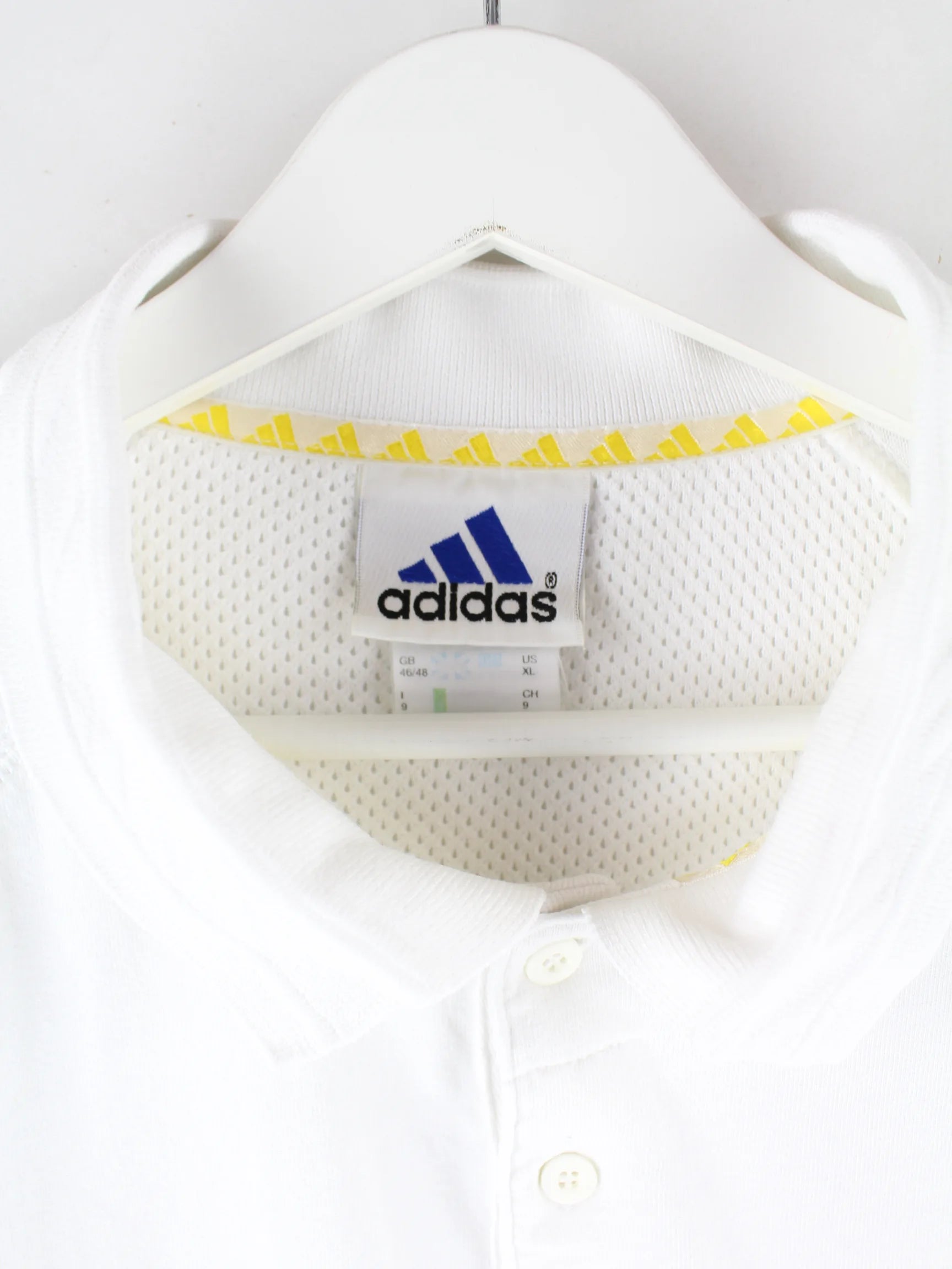 Poloshirt des Labels Adidas in Größe XXL aus den 90'ern. Es ist aus Baumwolle gefertigt und in Weiß in Stock.