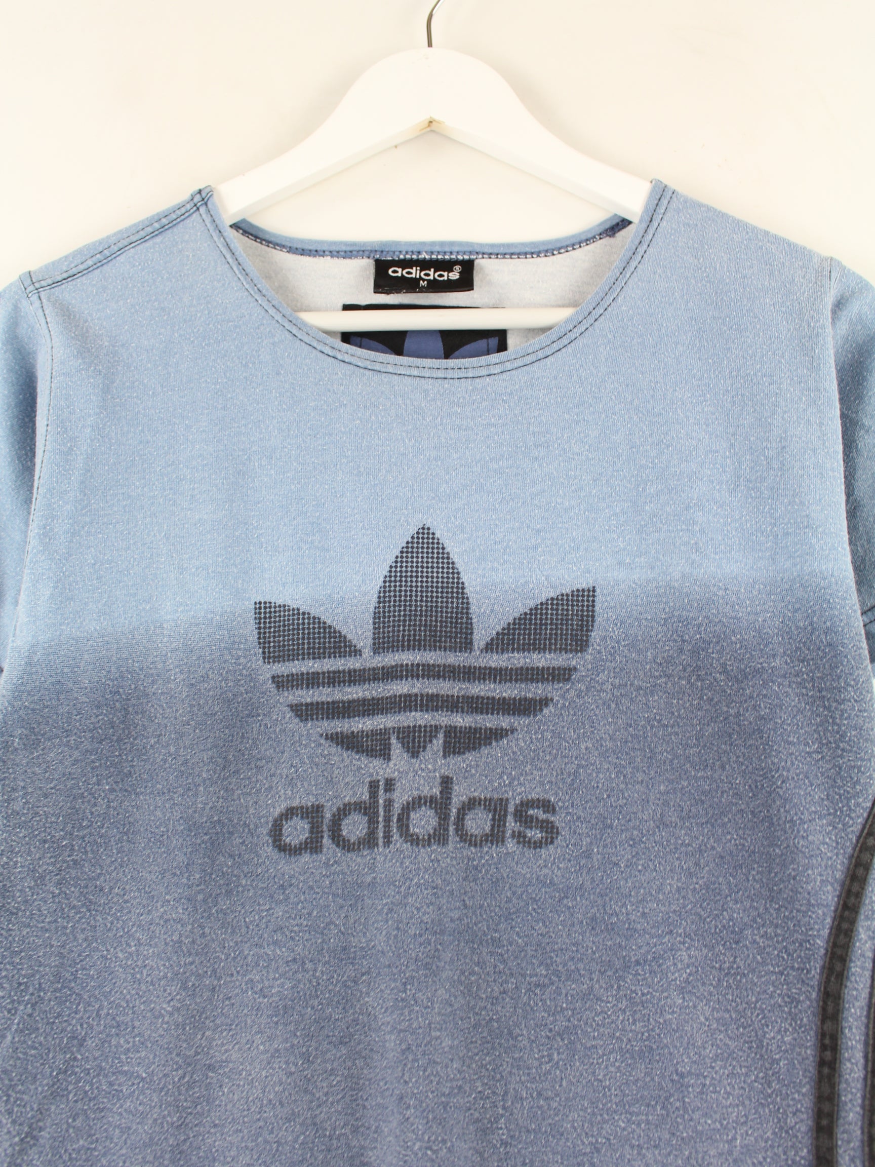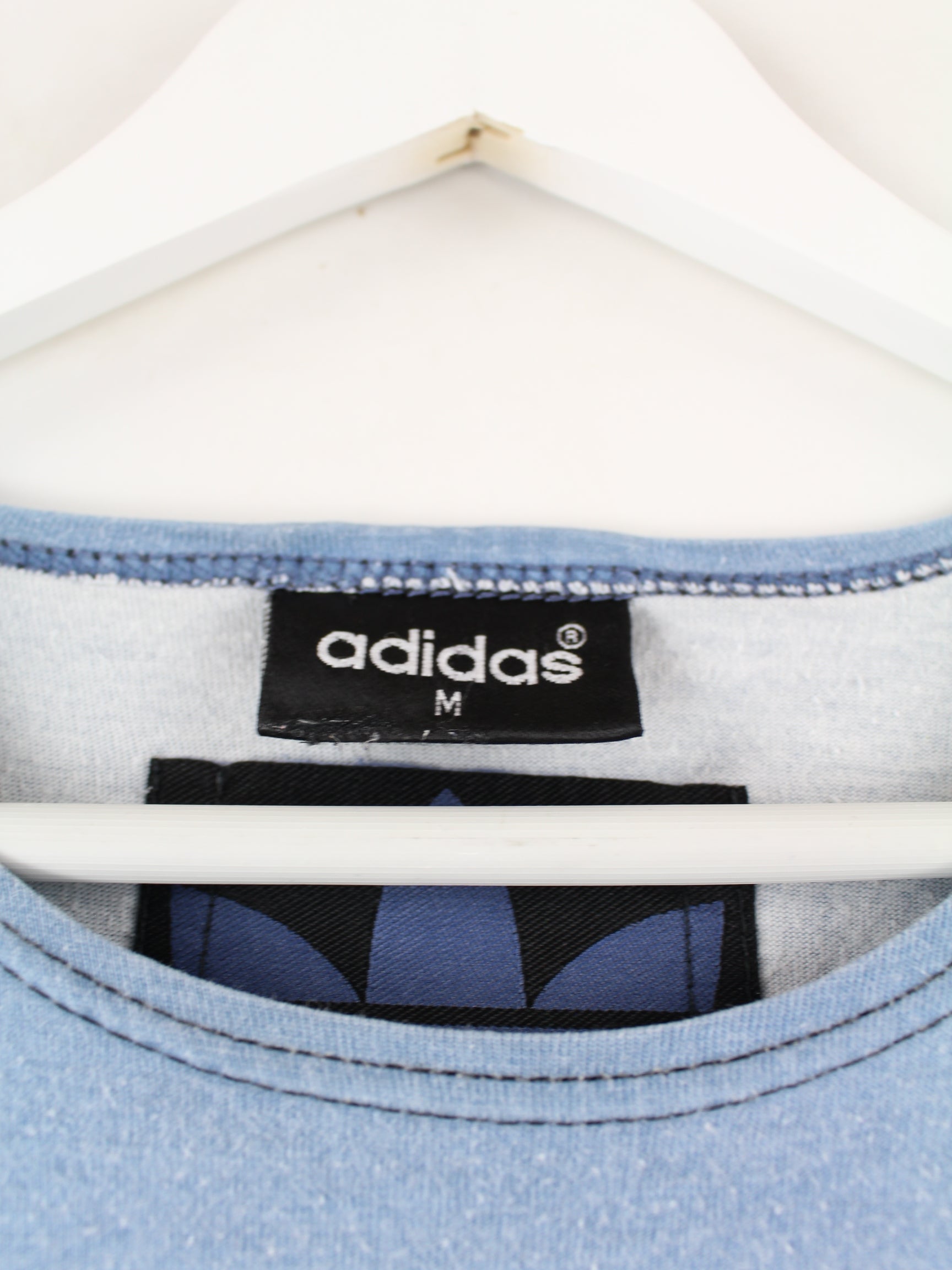 Blue T-shirt by Adidas from the 90's in size M. It is made of cotton and is in very good condition. With a chic Trefoil print.