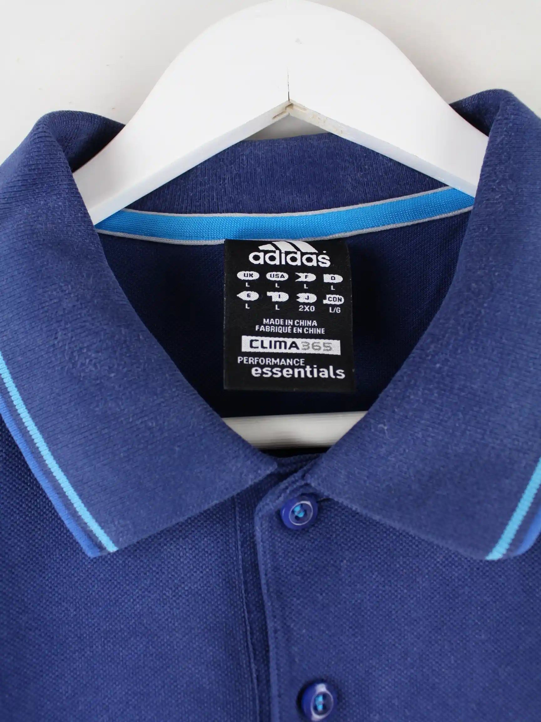 Blaues Poloshirt vom Label Adidas in Größe L. Es ist aus Baumwolle angefertigt und in gutem Zustand auf Lager.