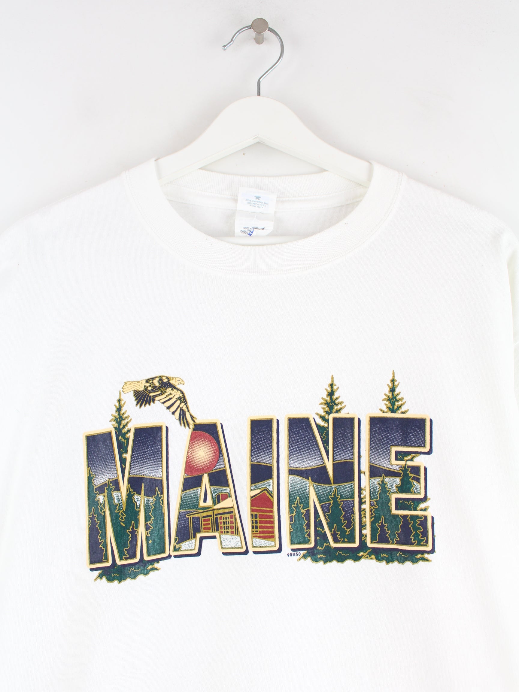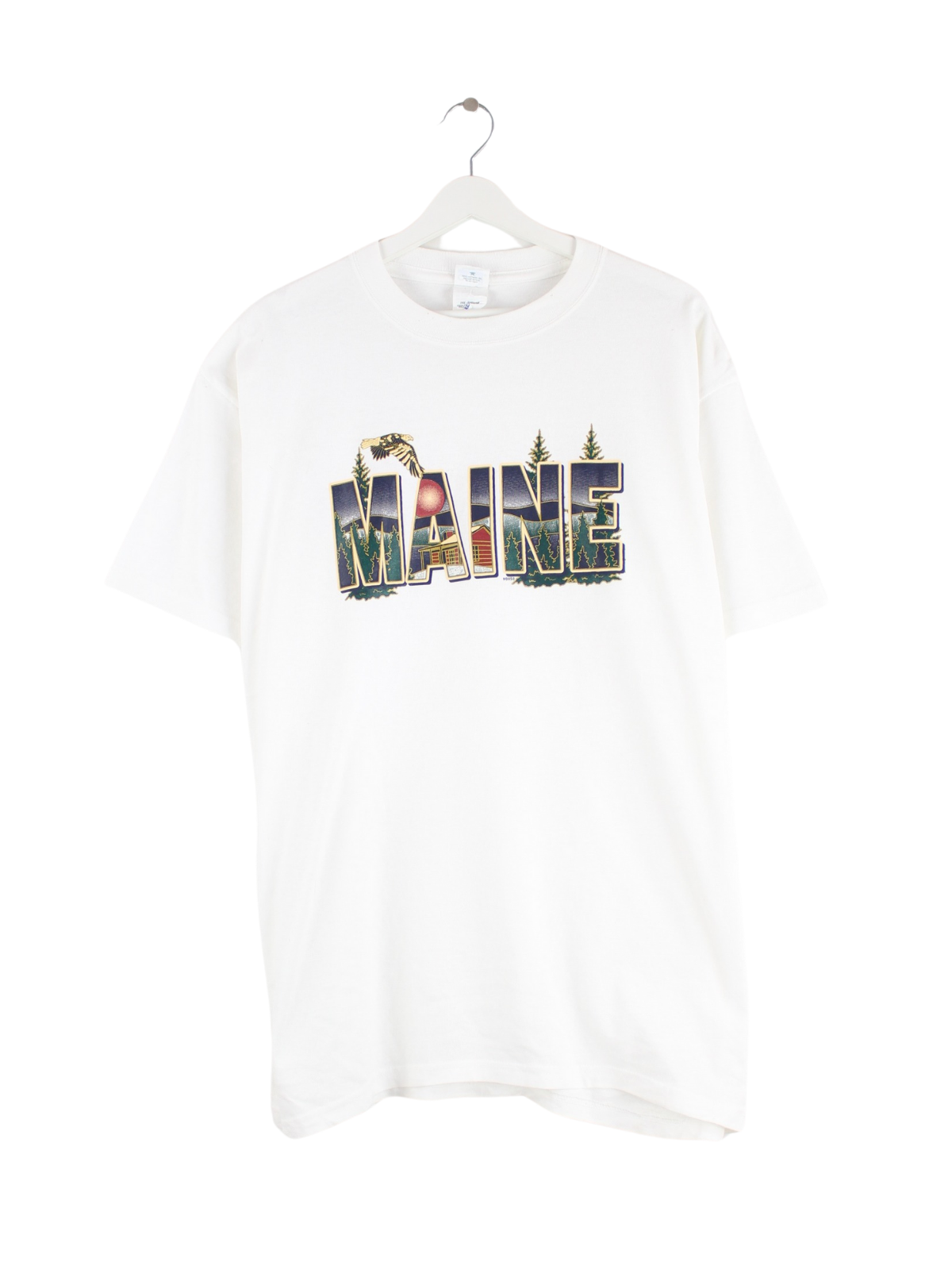 T-shirt from the brand Anvil in size XL. It is made of cotton and is available in white. With a great Maine print.