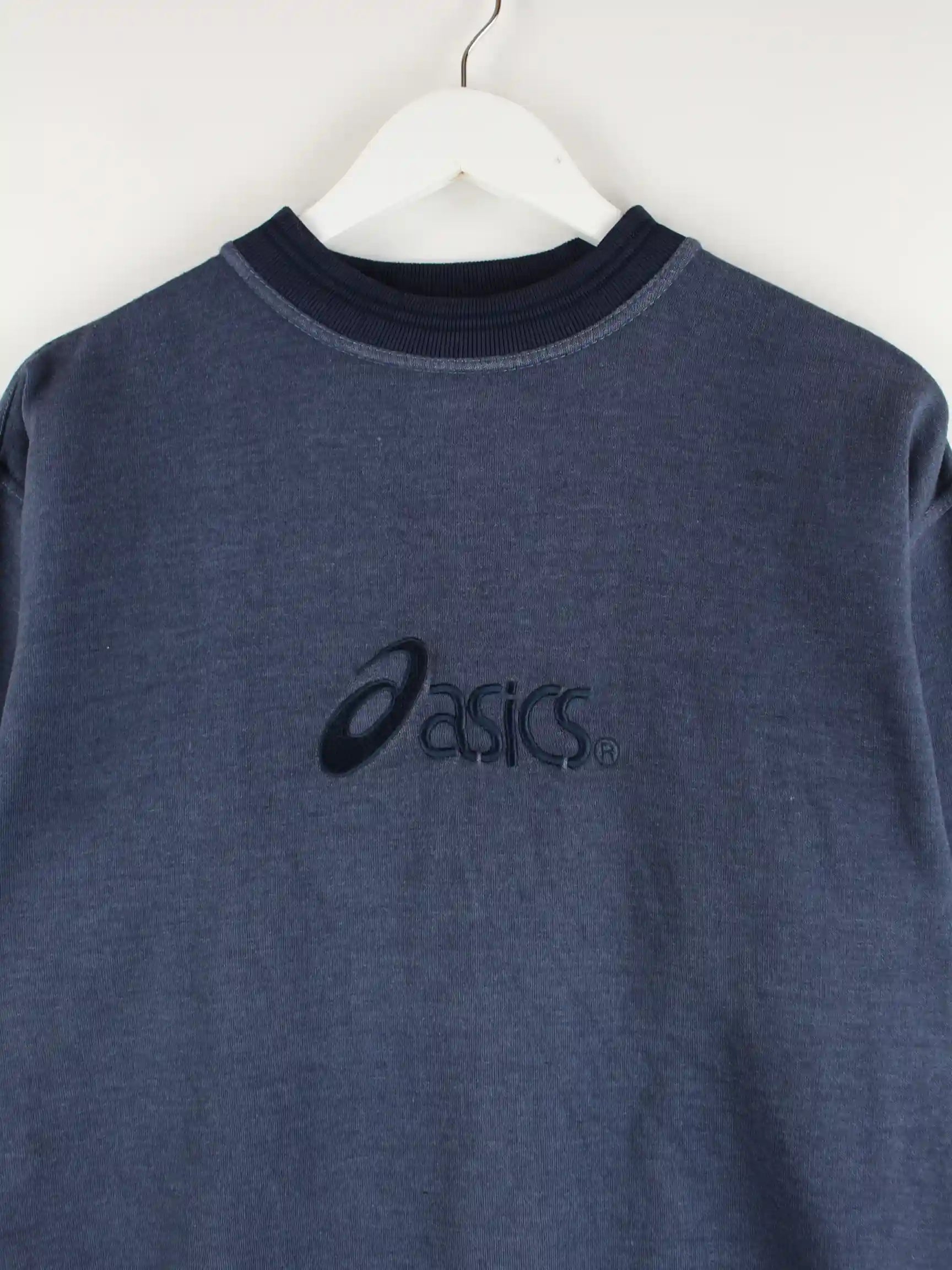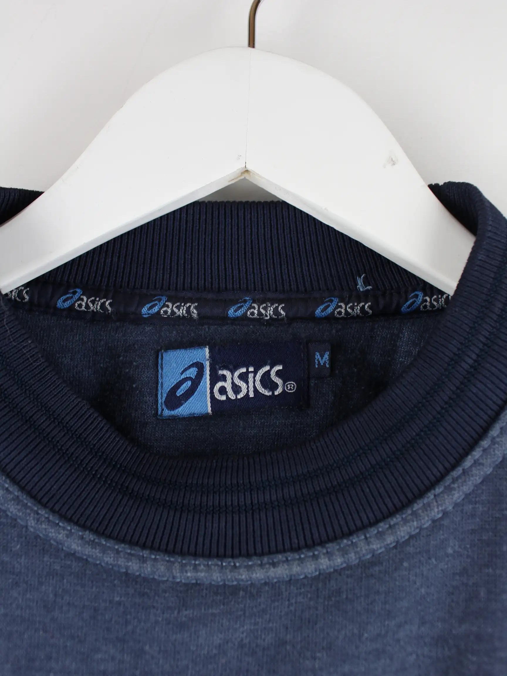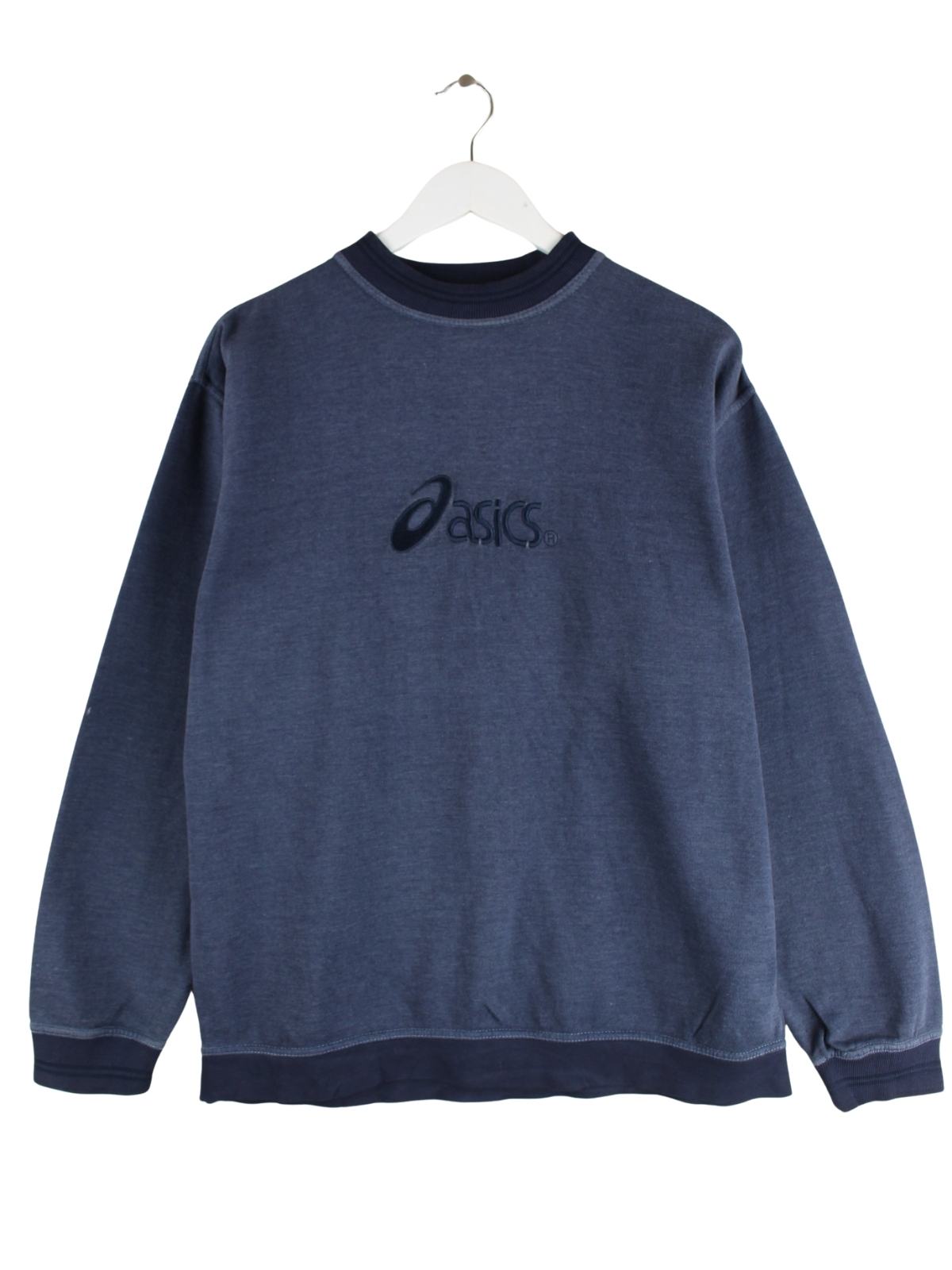 Sweater vom Label Asics in Größe M aus den 90'ern. Er ist aus einer Baumwollmischung produziert und in Blau im Bestand.