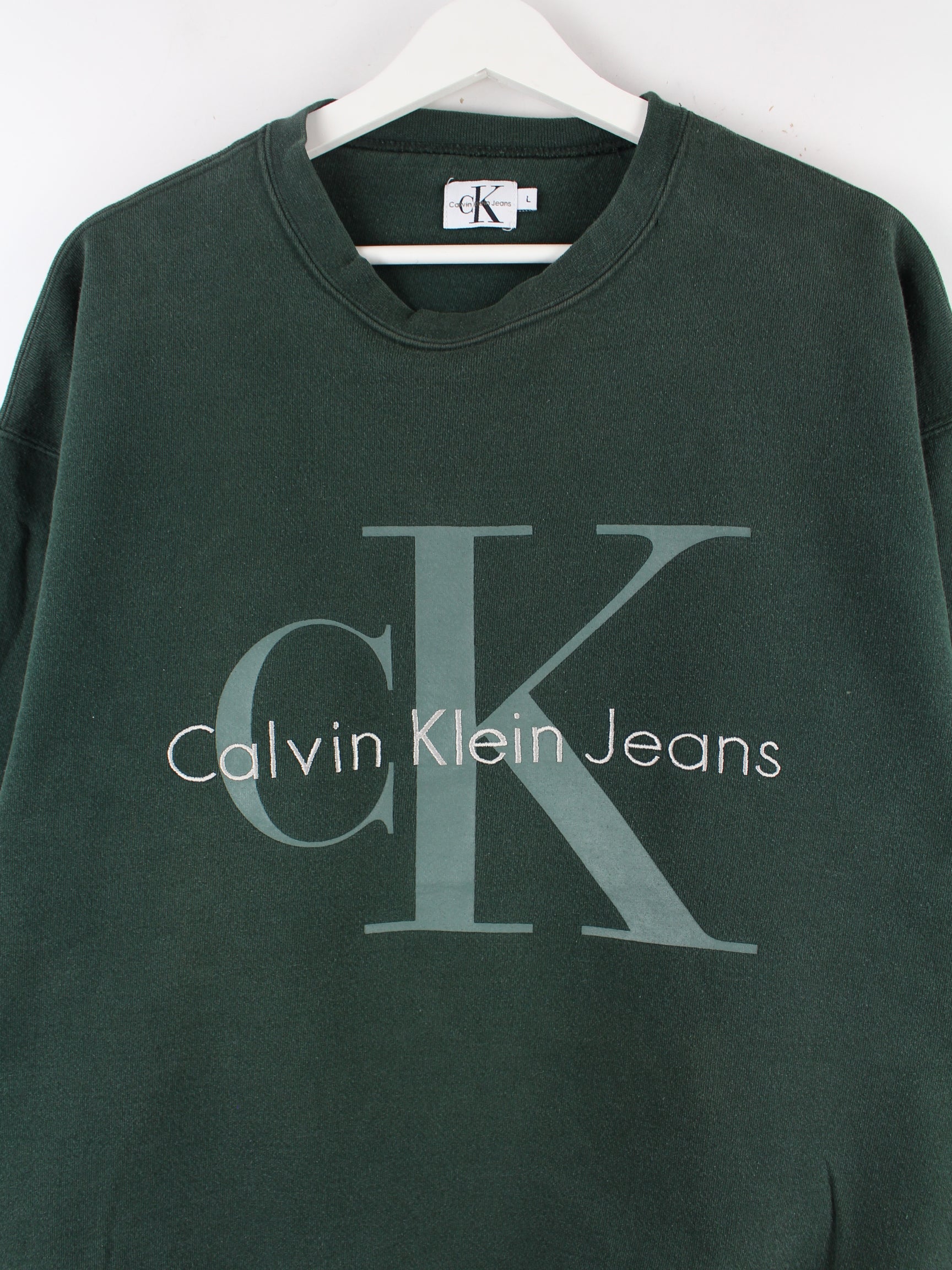 Sweater des Labels Calvin Klein mit Stickereien in Größe L aus den 90'ern. Er ist aus einer Baumwollmischung angefertigt und in Grün zu bekommen.