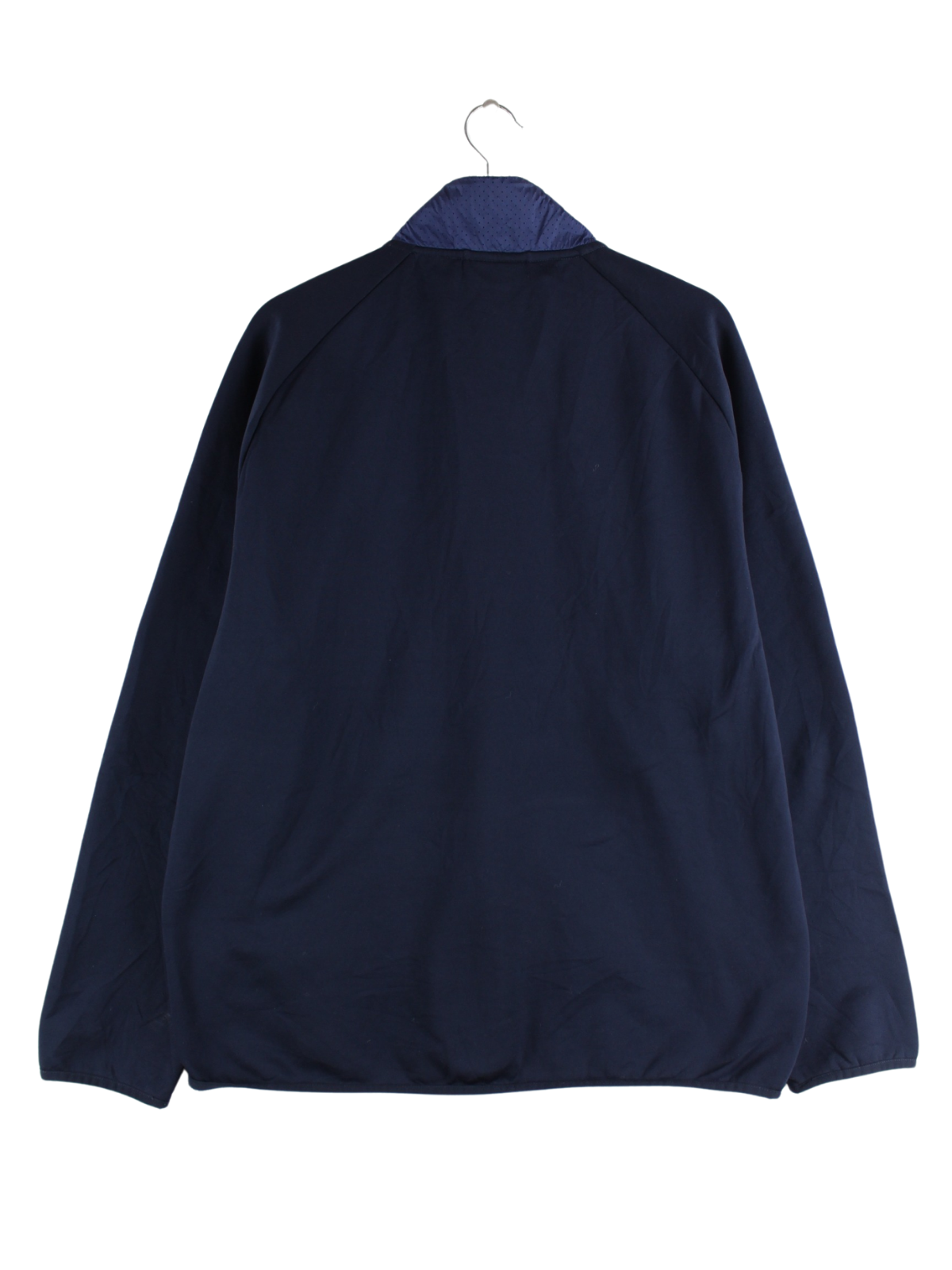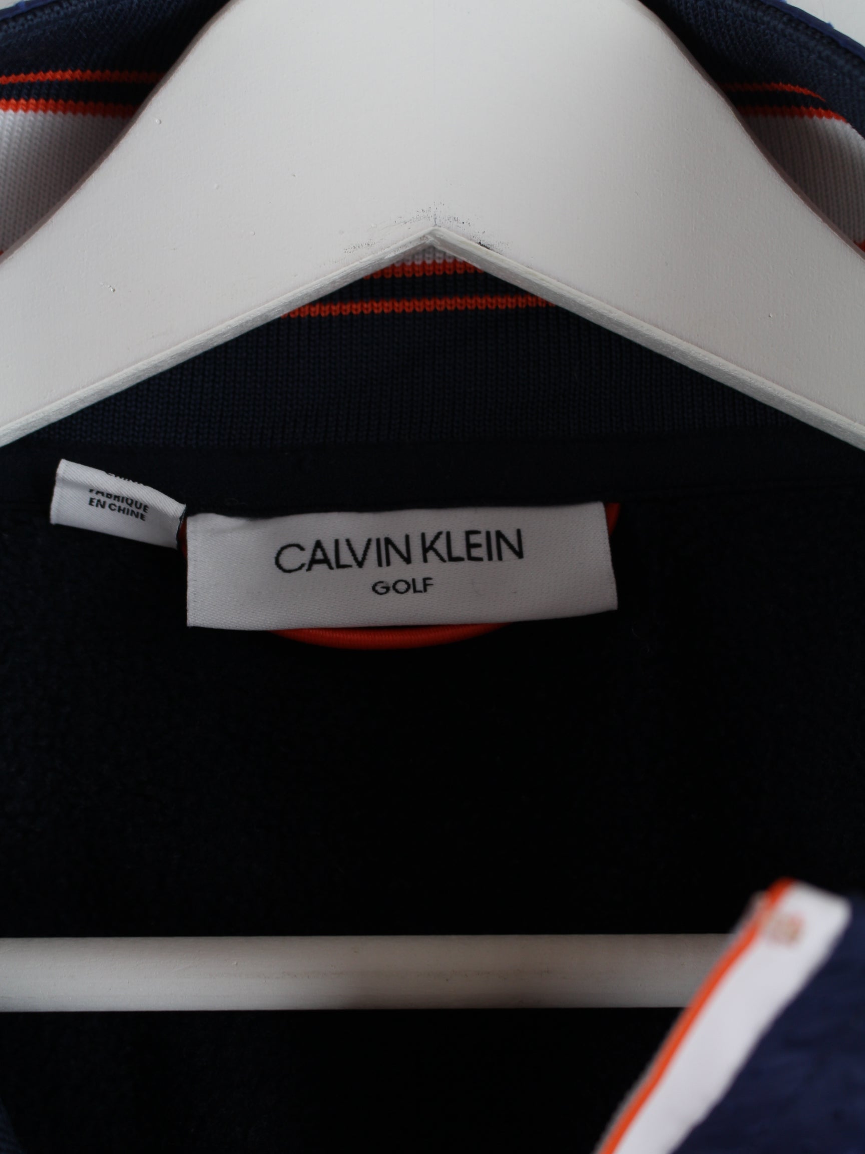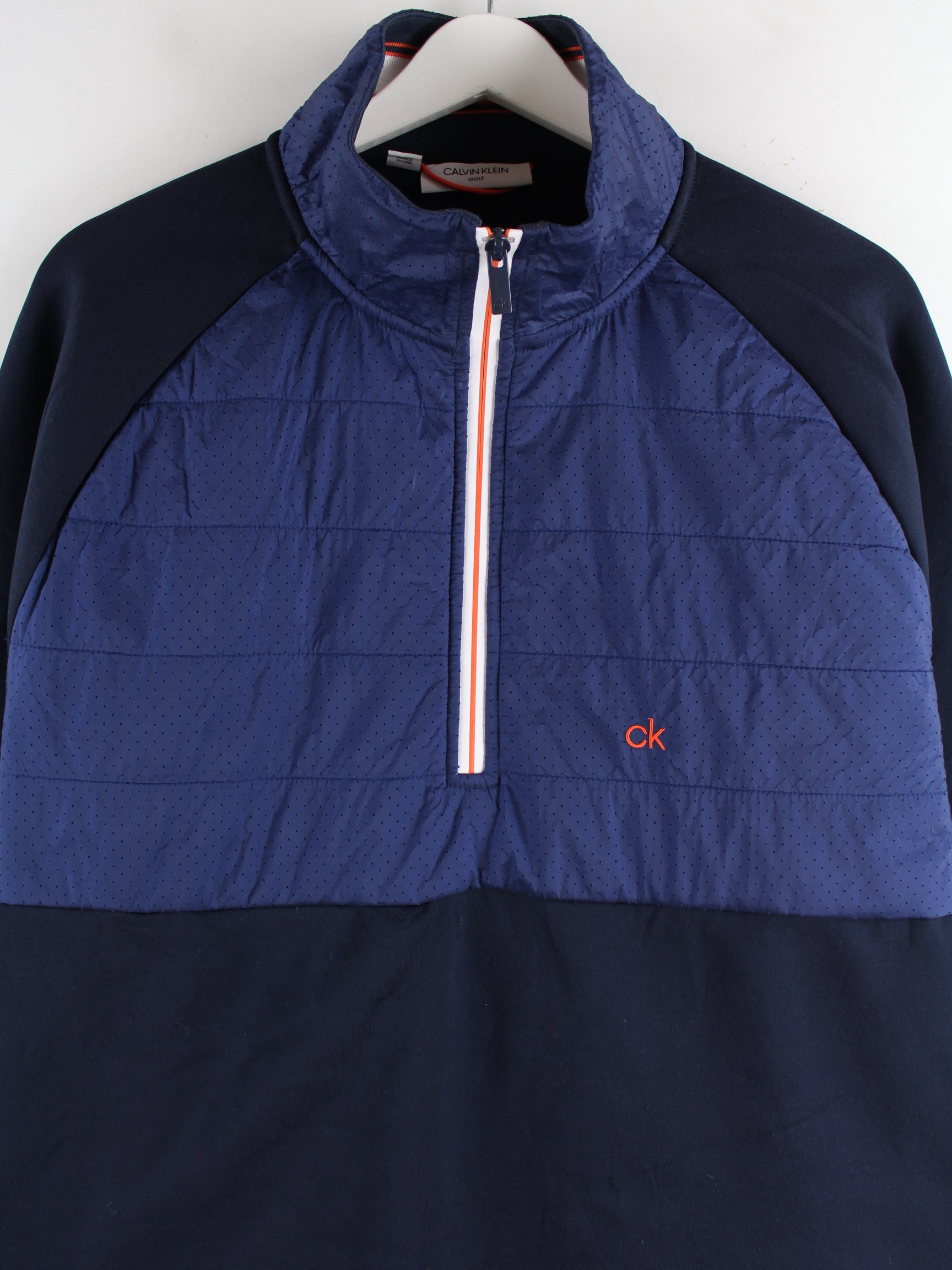 Sweater der Marke Calvin Klein mit kurzem Reißverschluß in Größe XXL. Er ist aus Synthetik und in Blau im Bestand.