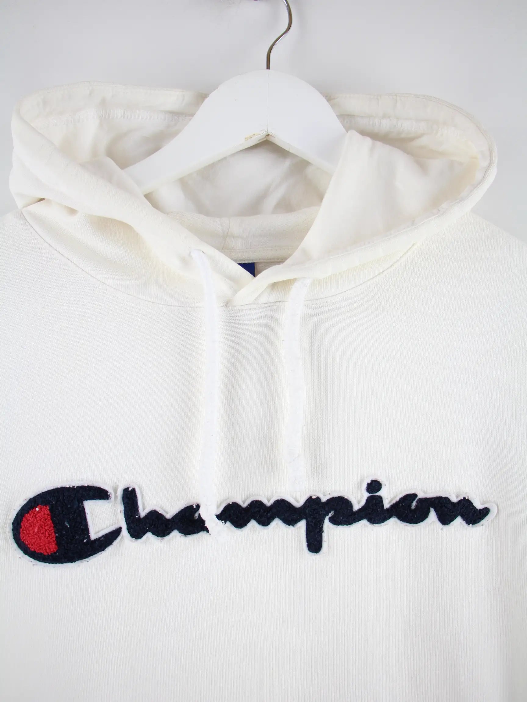 Weißer Hoodie aus dem Hause Champion in Größe M. Er ist aus einer Baumwollmischung angefertigt und in gutem Zustand zu bekommen.