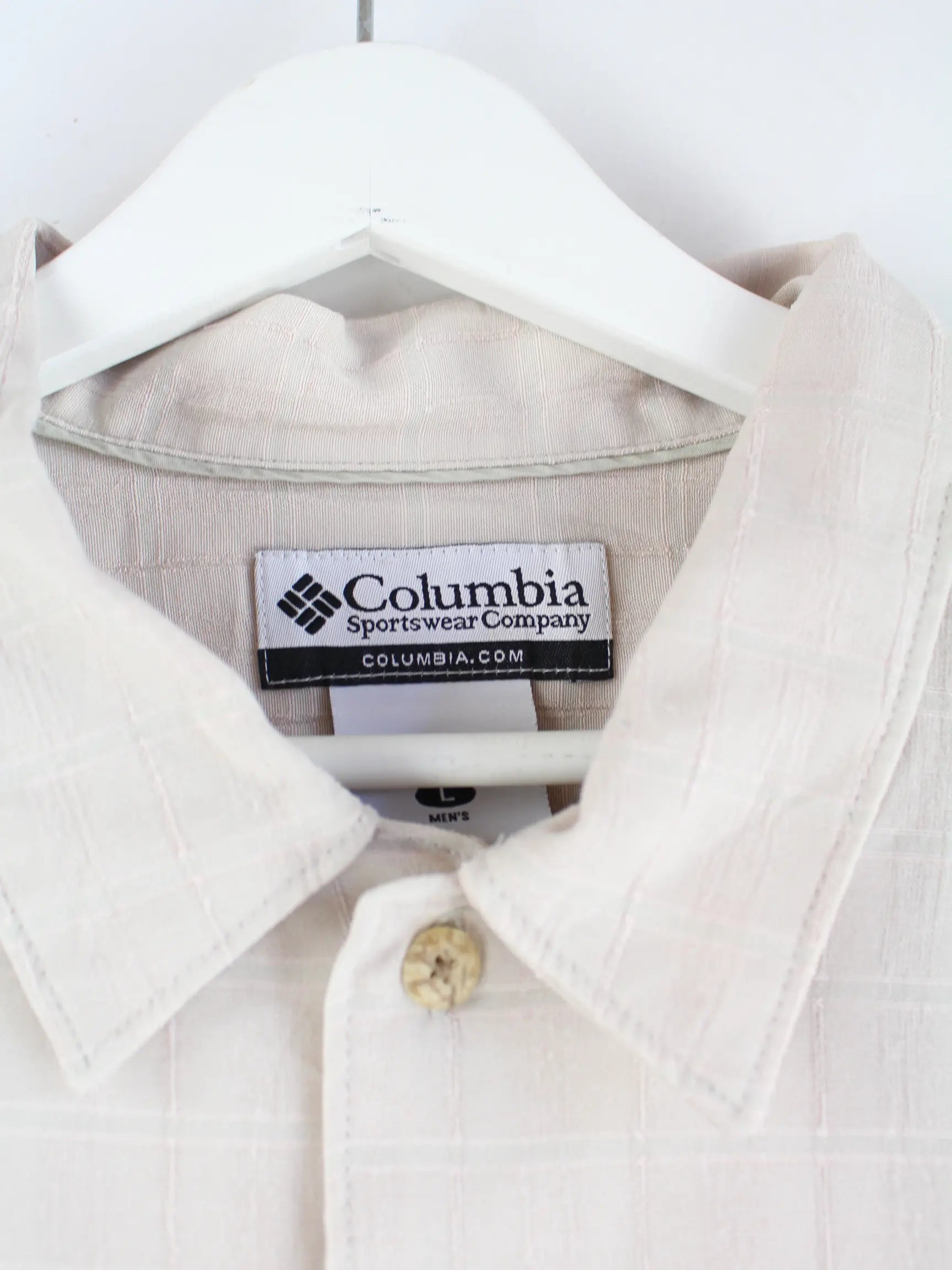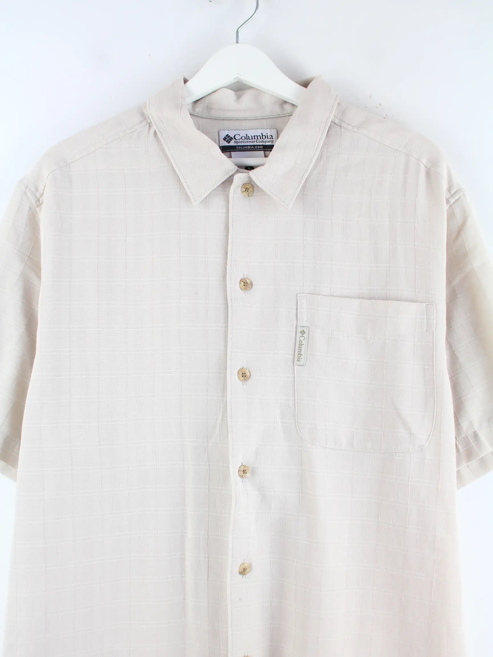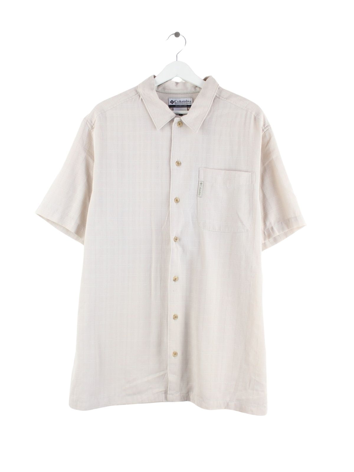Freizeit Hemd vom Brand Columbia in Größe XXL aus den 90'ern. Es ist aus Synthetik gefertigt und in Beige auf Lager.