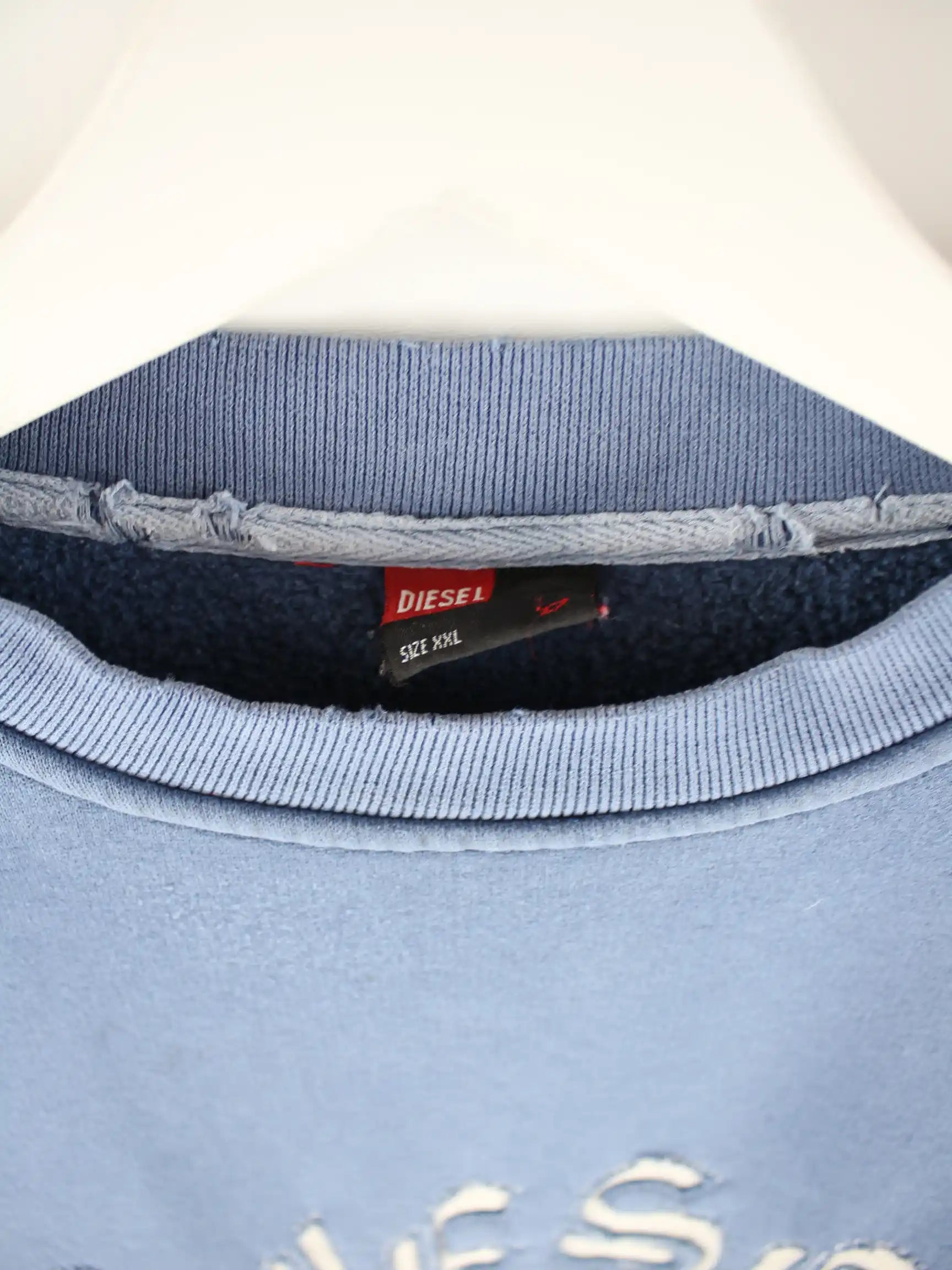 Blauer Sweater mit gesticktem Logo vom Brand Diesel aus den 90'ern in Größe XXL. Er ist aus einer Baumwollmischung produziert. Den Zustand würden wir als 'In Ordnung' bezeichnen (vergl. Bilder).