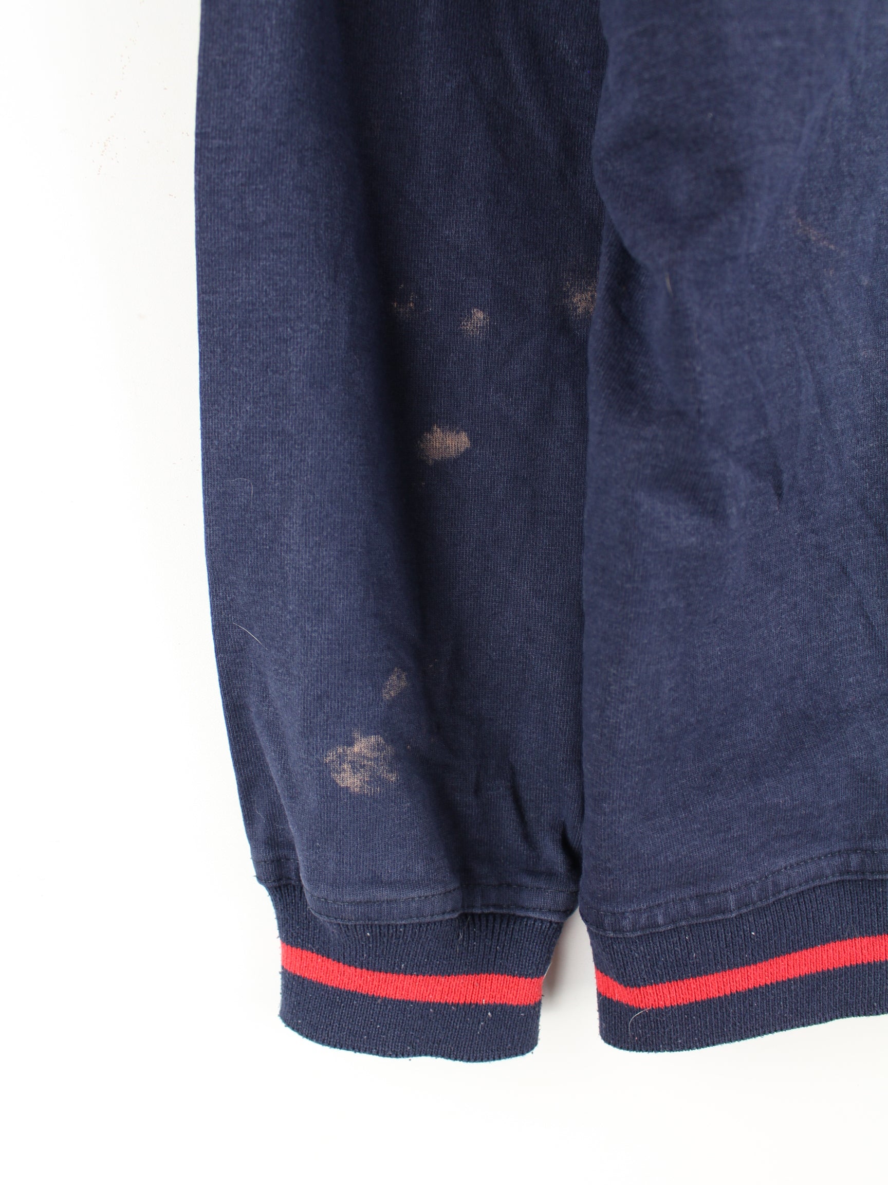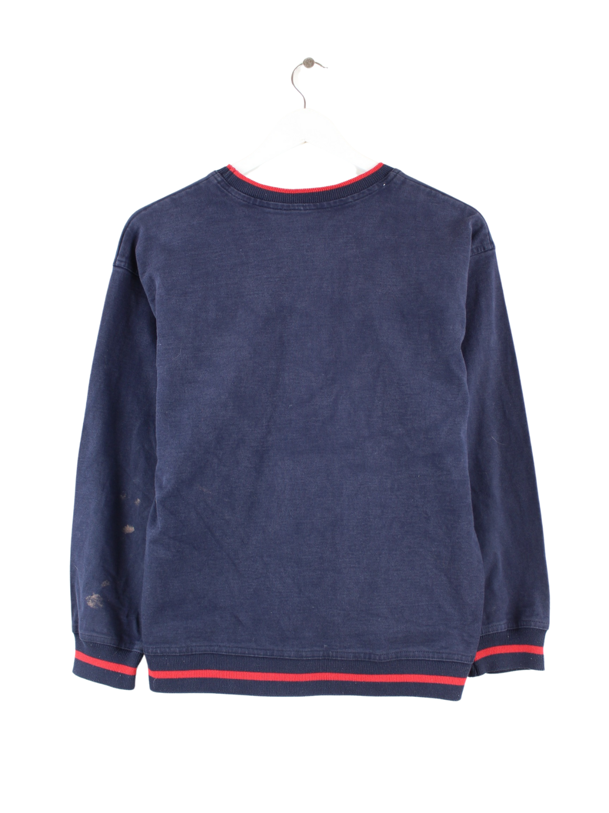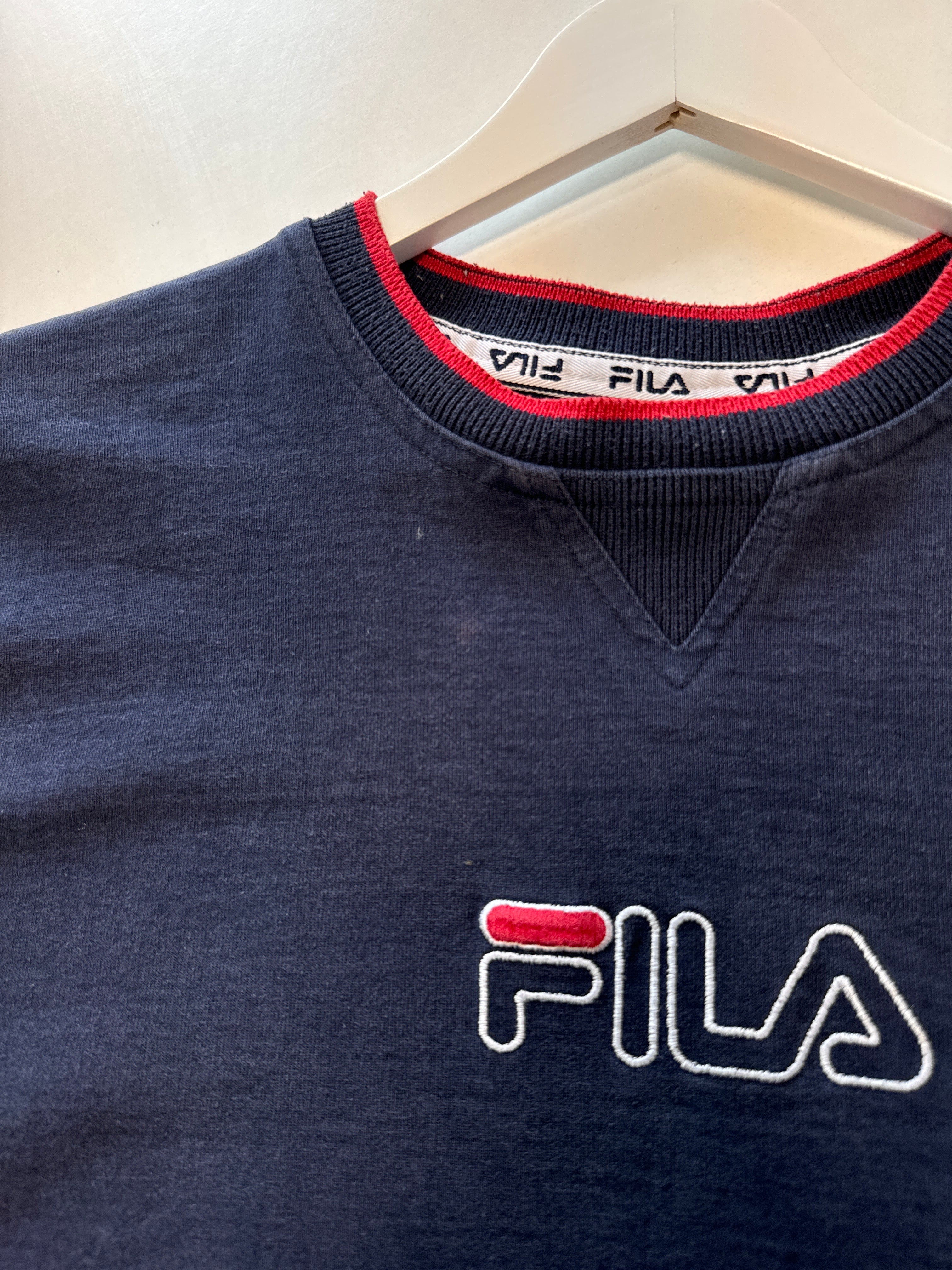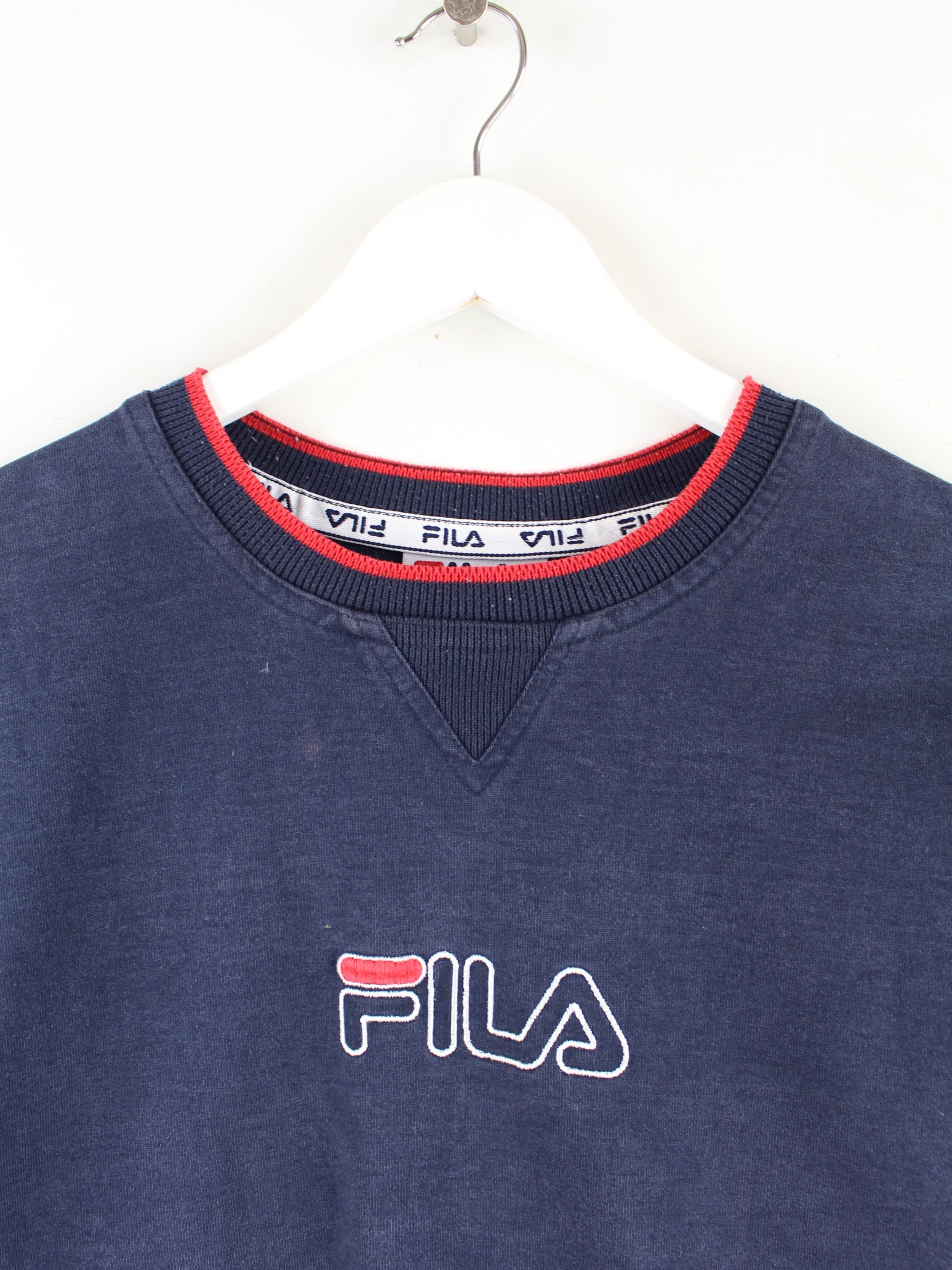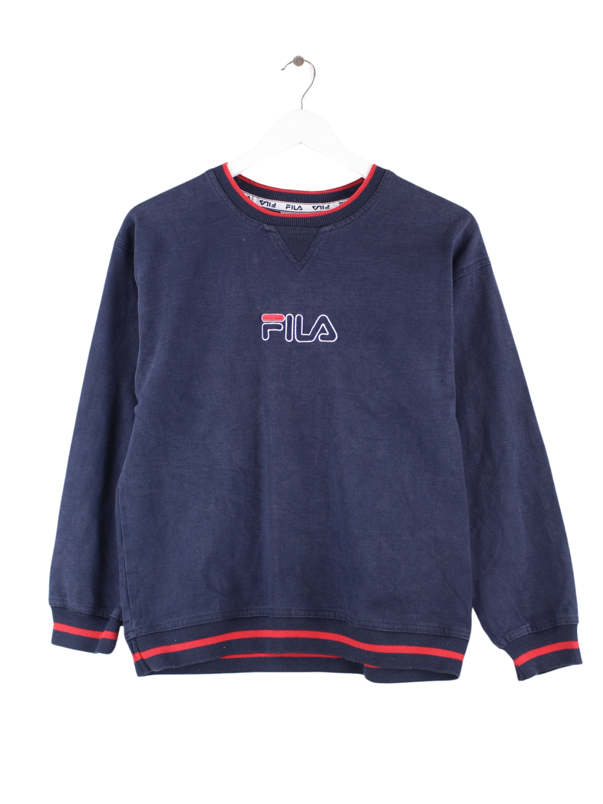 Blue sweater with embroidered motifs from the Fila brand in size S. It is made of a cotton blend and is in good condition in stock.