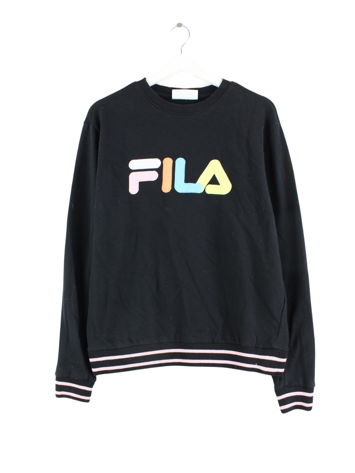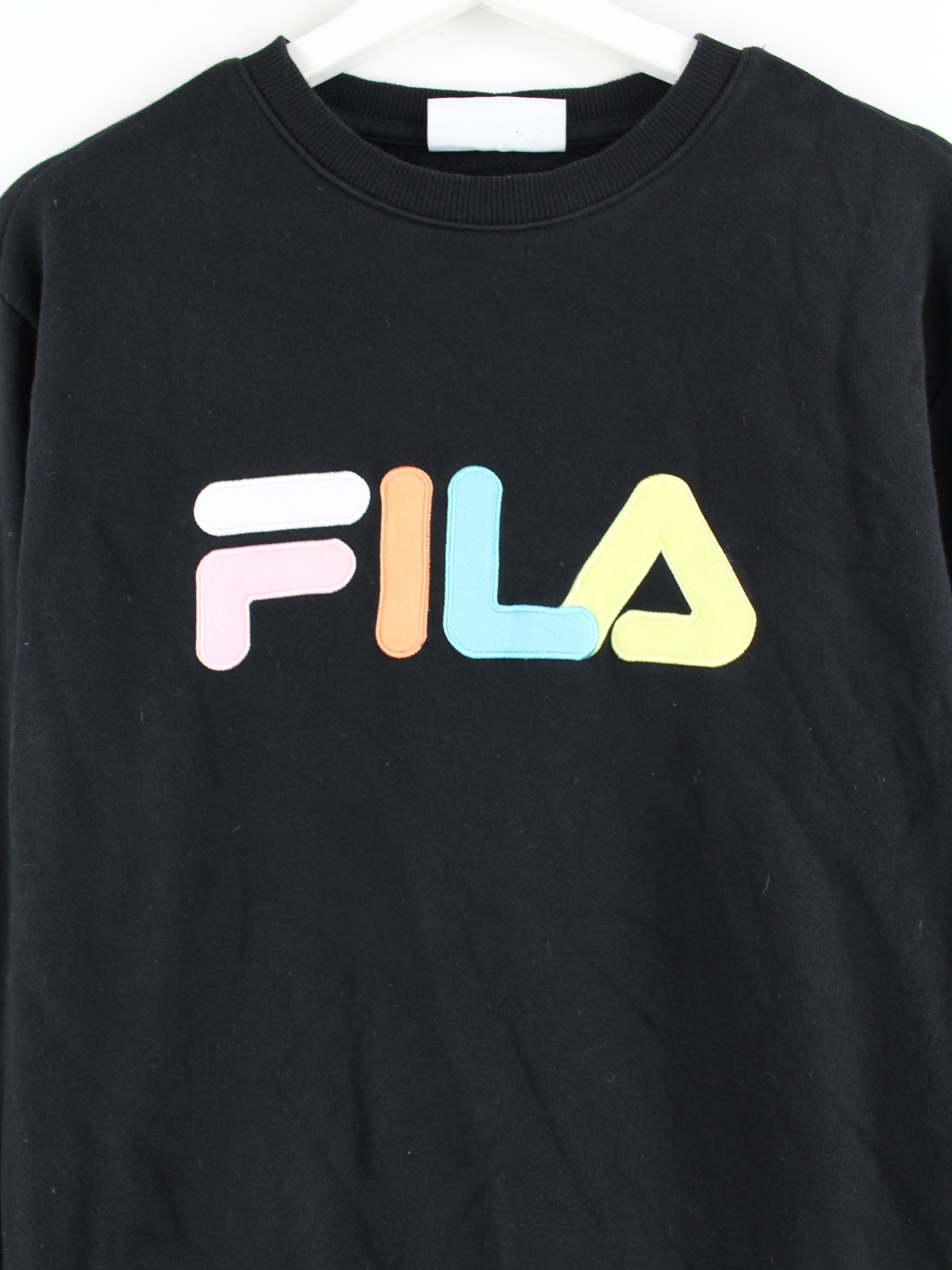 Black sweater with embroidered motifs from the Fila label in size L. It is made from a cotton blend and is available in very good condition.