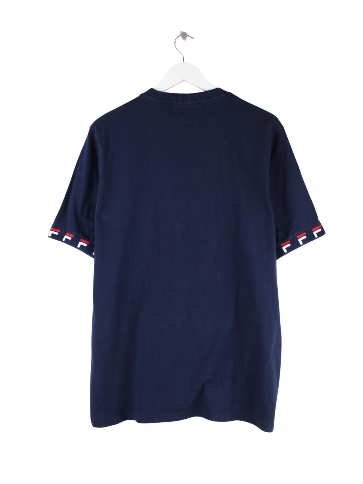 T-Shirt der Brand Fila mit gesticktem Logo in Größe XL. Es ist aus Baumwolle produziert und in Blau zu haben.