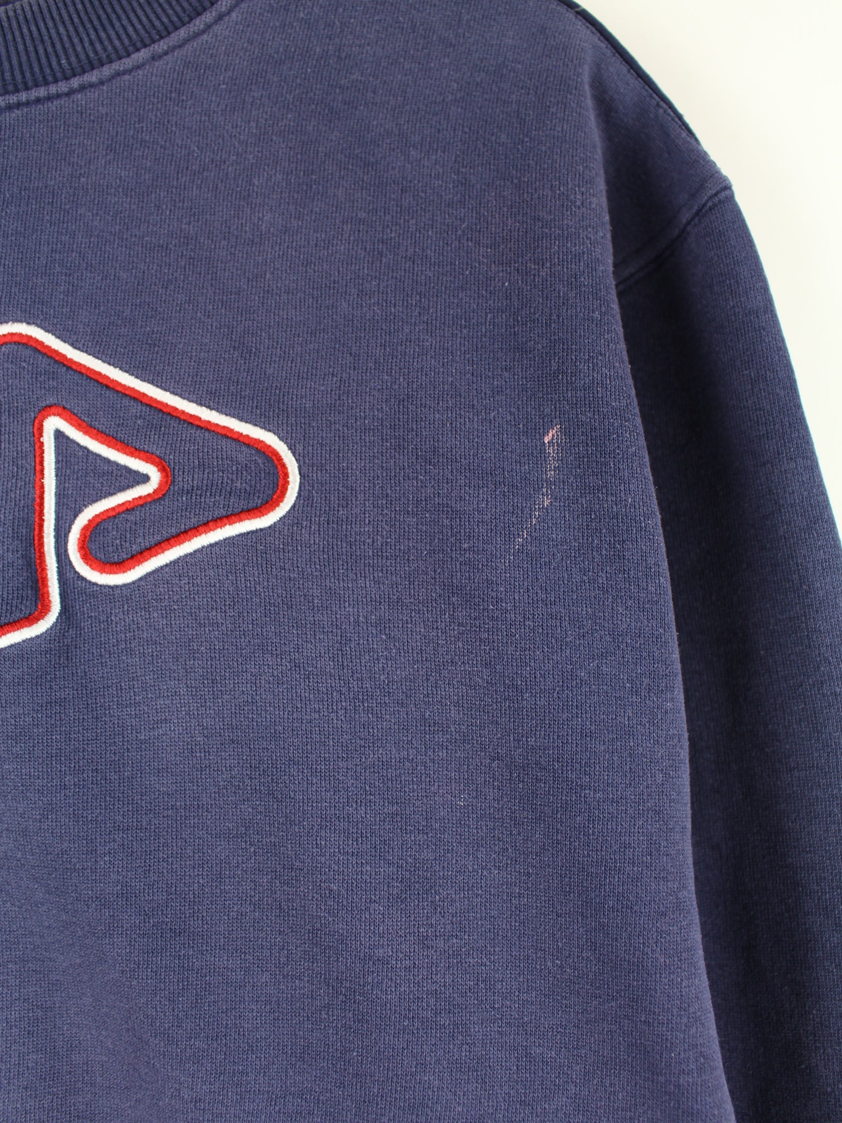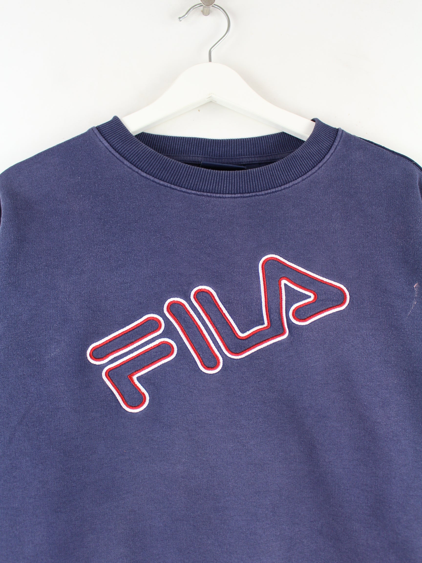 Blue sweater with embroidery from the label Fila in size L. It is made of a cotton blend and is in good condition in stock.