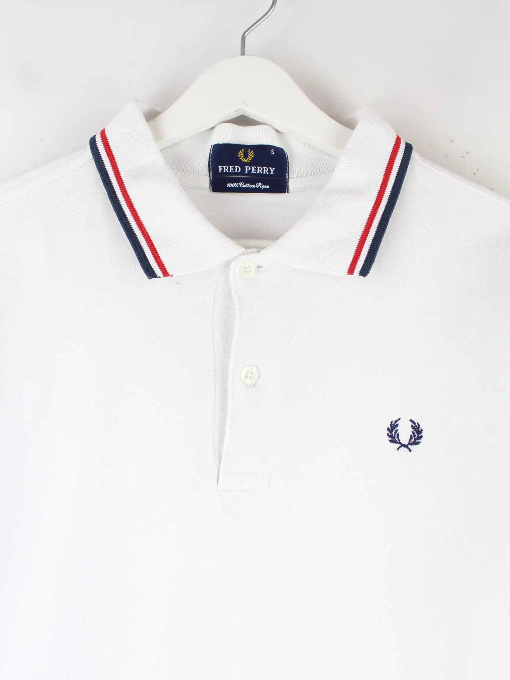 Poloshirt der Marke Fred Perry in Größe S. Es ist aus Baumwolle und in Weiß zu haben.