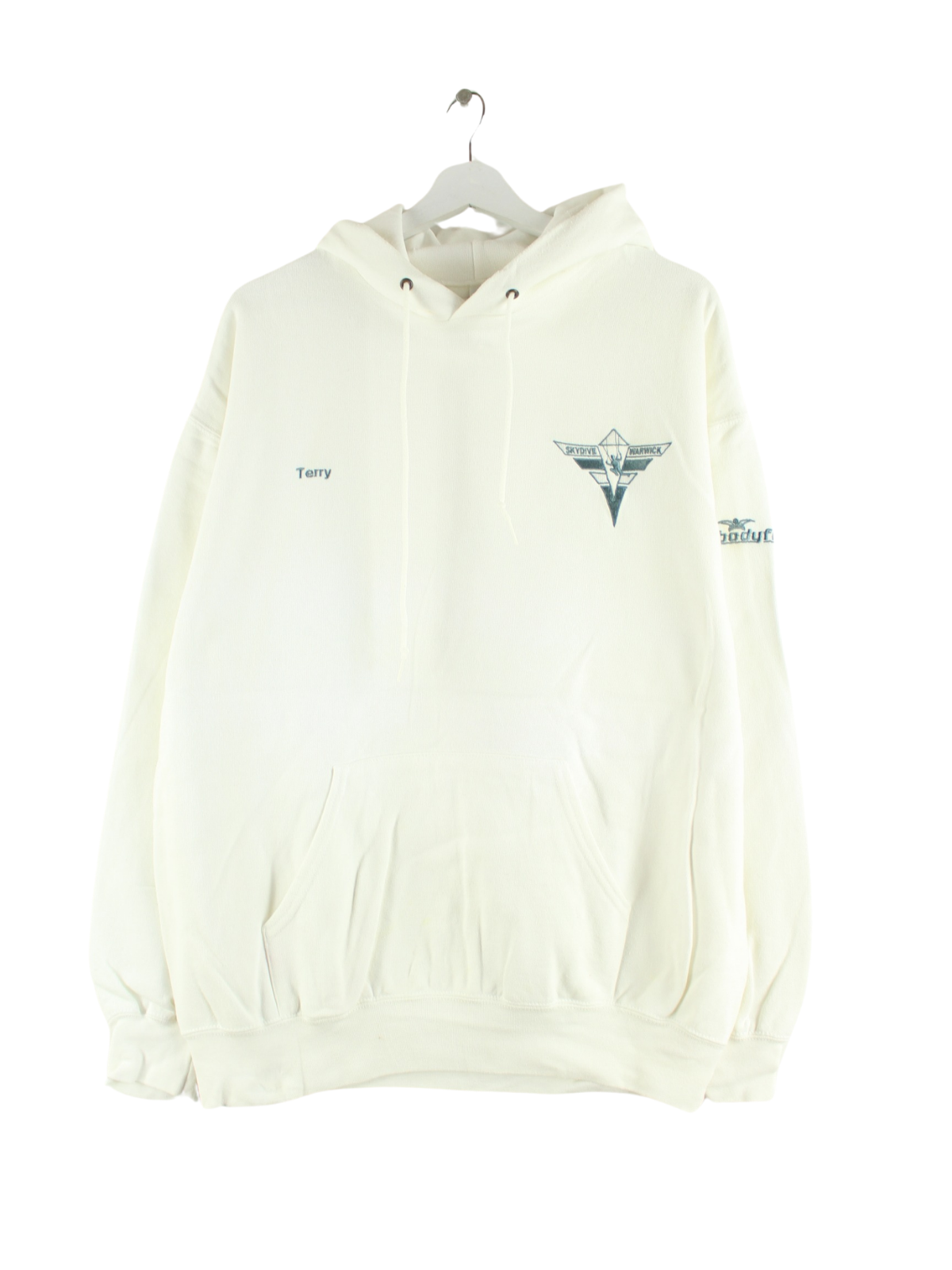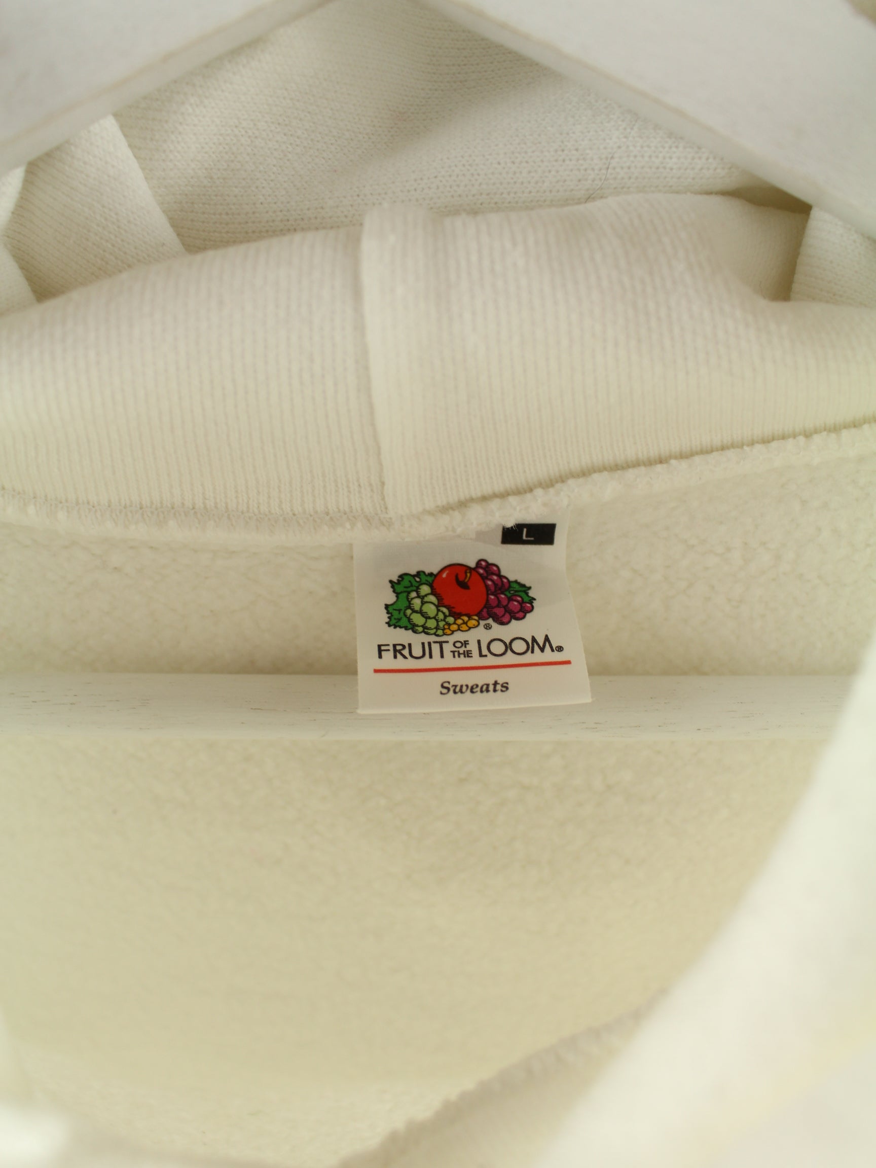 White hoodie from Fruit of the Loom in size L. It is made of a cotton blend and is in good condition. With a rare skydiving print.