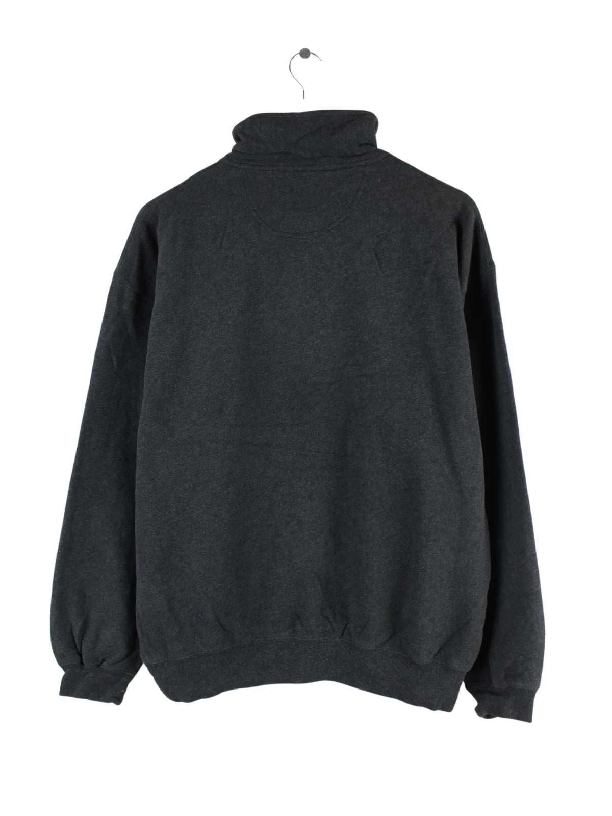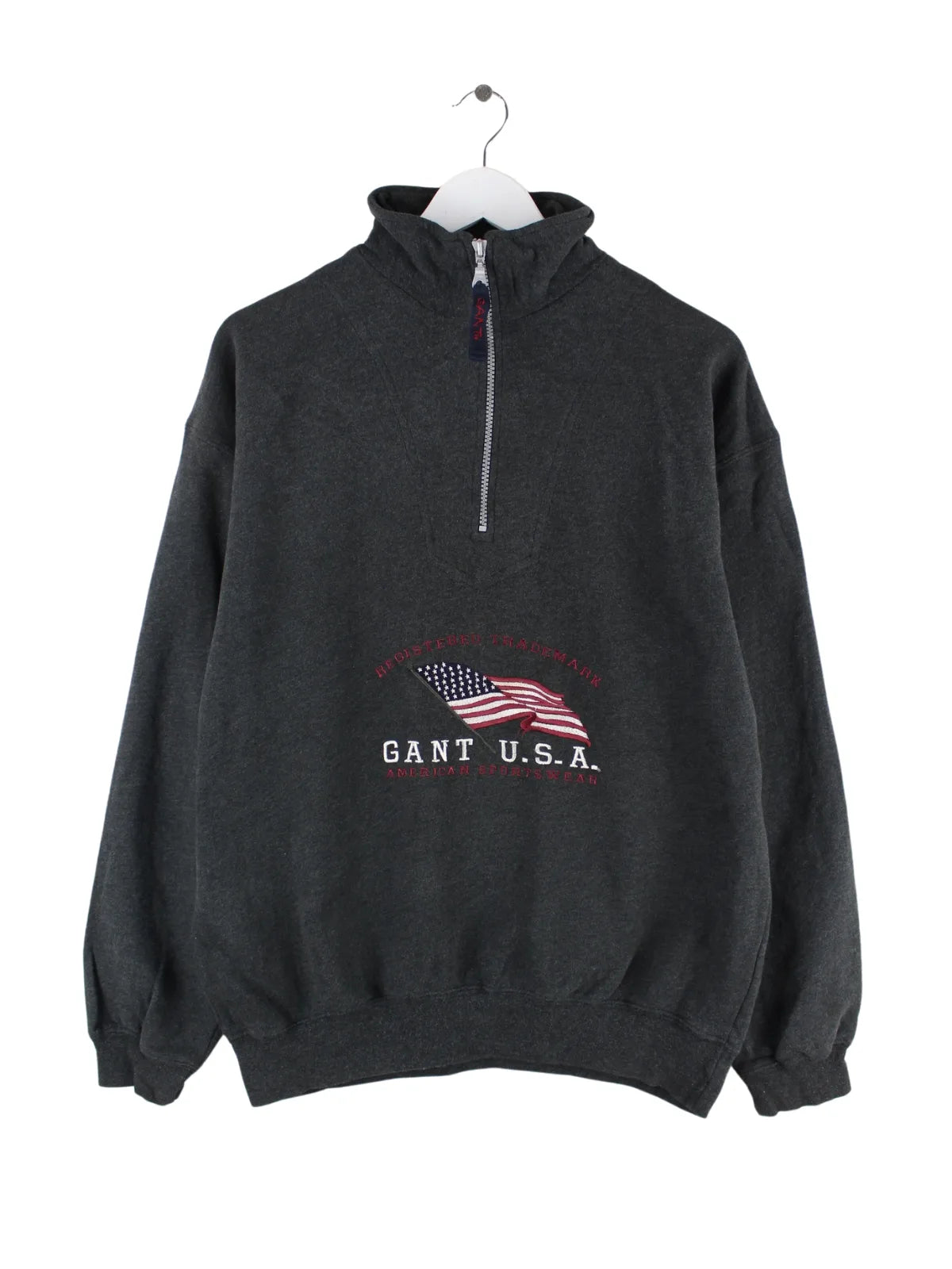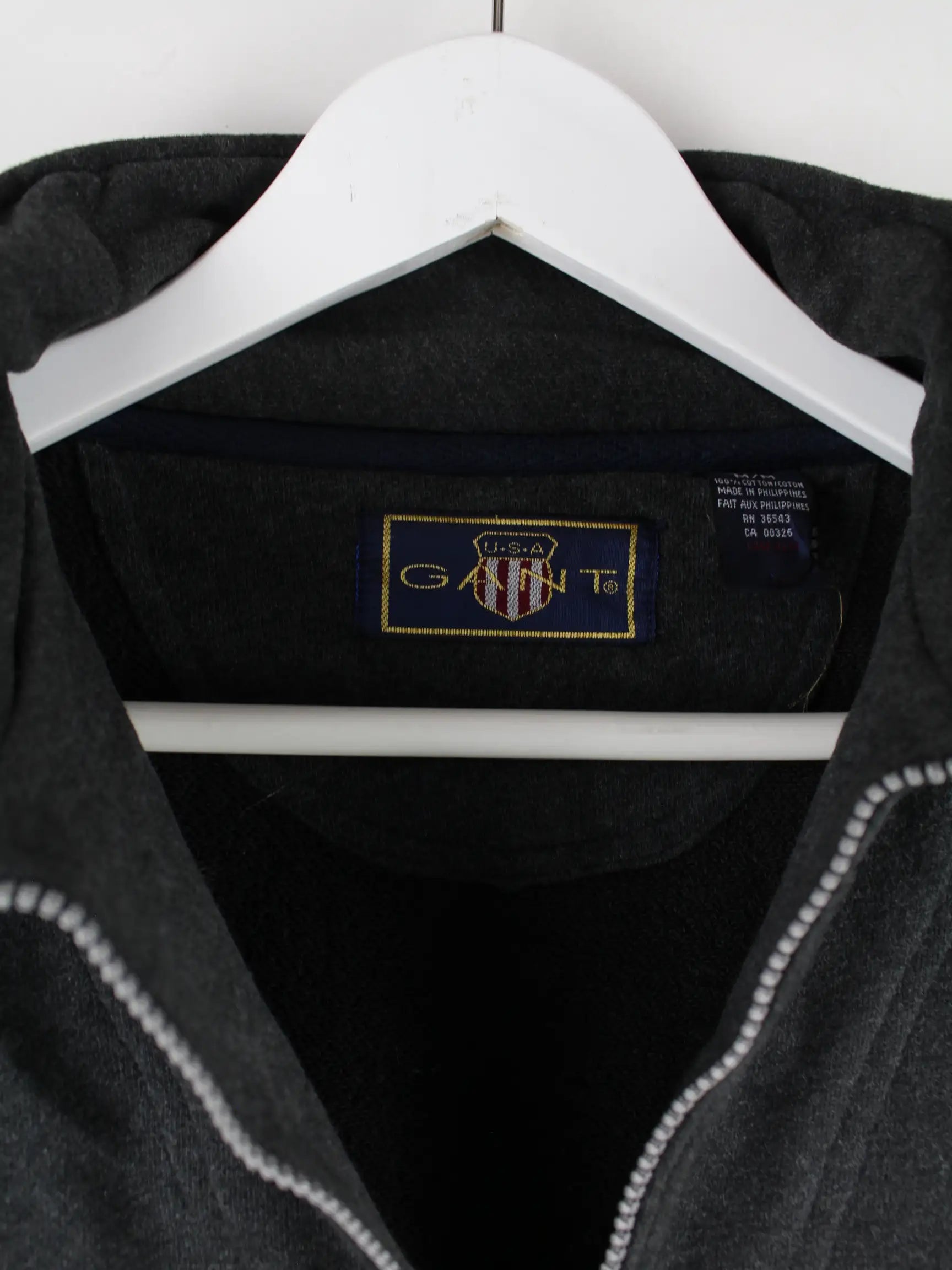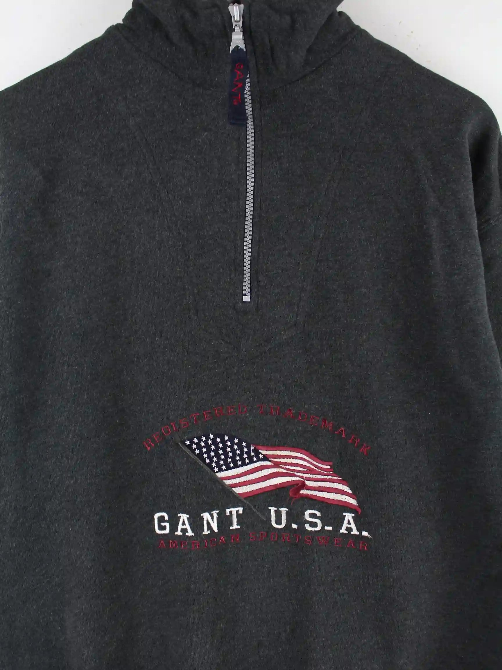 Grauer Sweater mit gestickten Motiven und half Zip der Brand Gant in Größe M. Er ist aus Baumwolle gemacht und in sehr gutem Zustand zu haben.