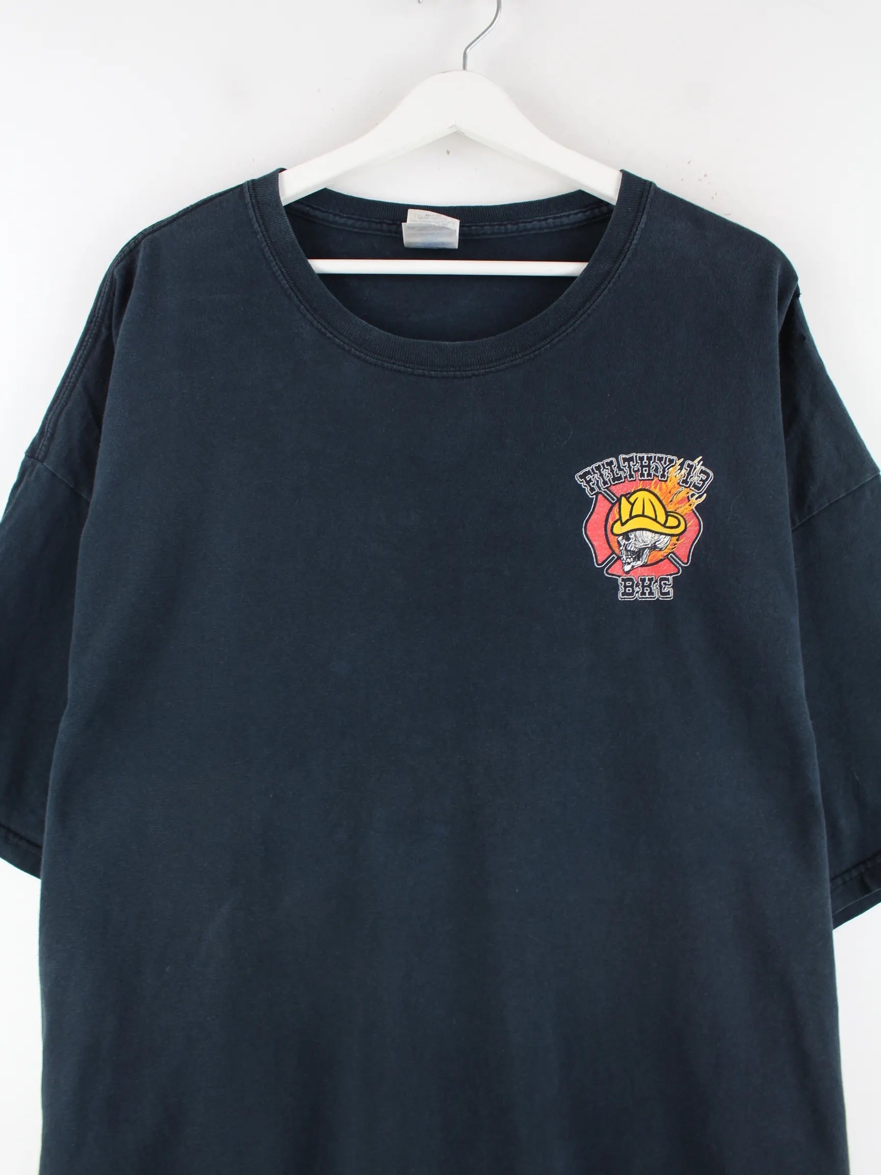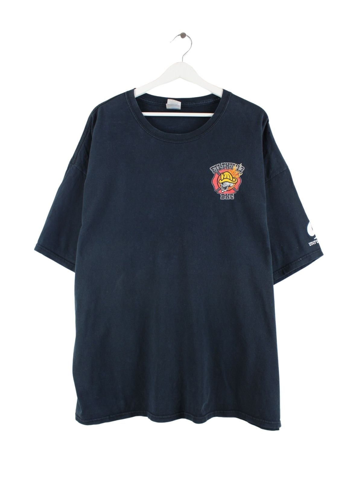 Blaues T-Shirt vom Brand Gildan in Größe 3XL. Es ist aus Baumwolle angefertigt und in gutem Zustand vorrätig. Mit chiquem Firefighter Print.