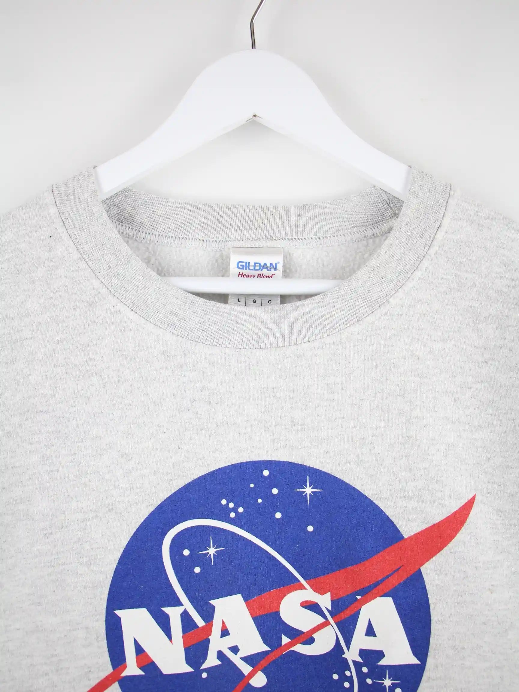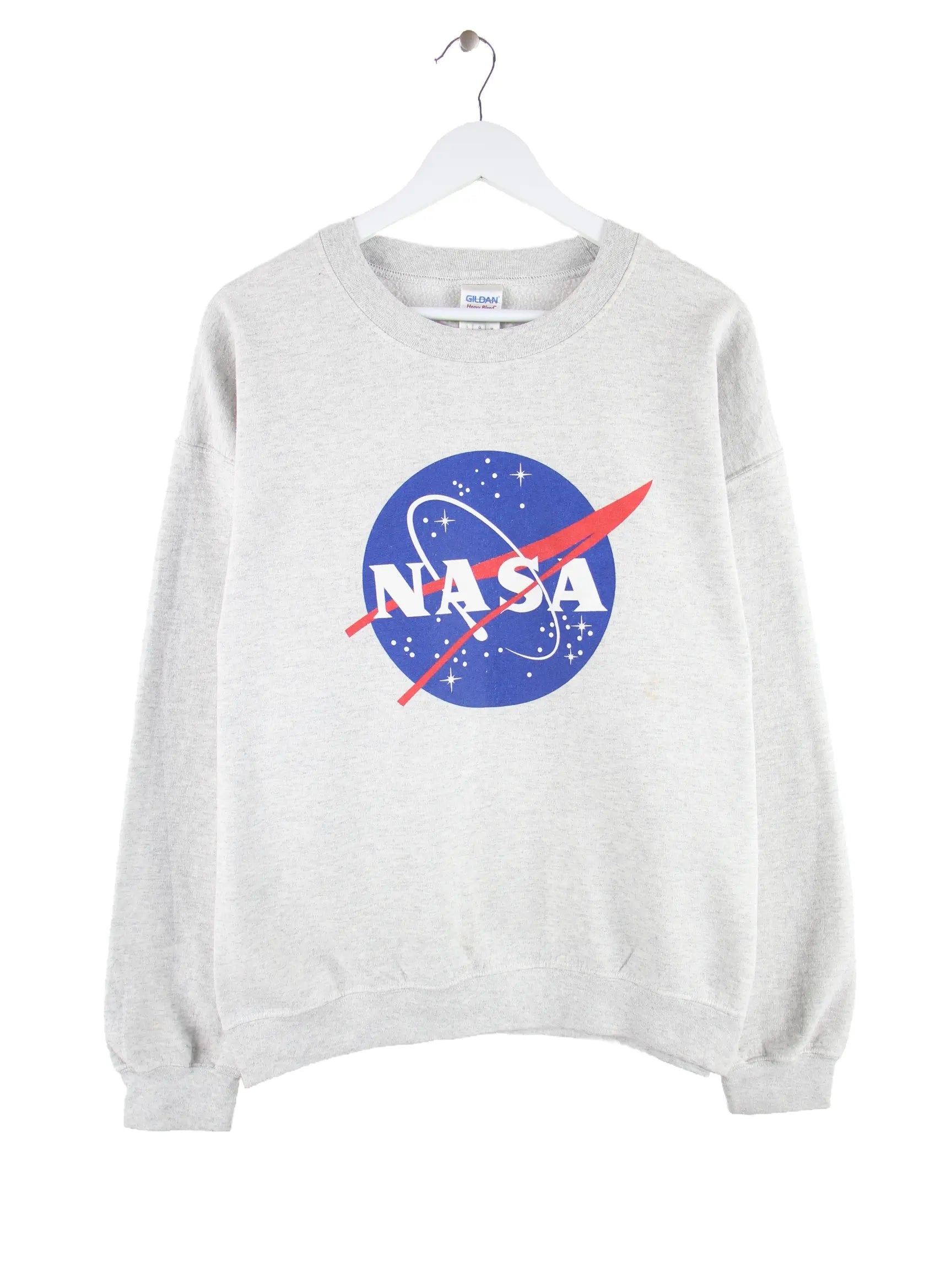 Sweater von Gildan in Größe L. Er ist aus einer Baumwollmischung angefertigt und in Grau vorrätig. Mit seltenem Nasa Print.