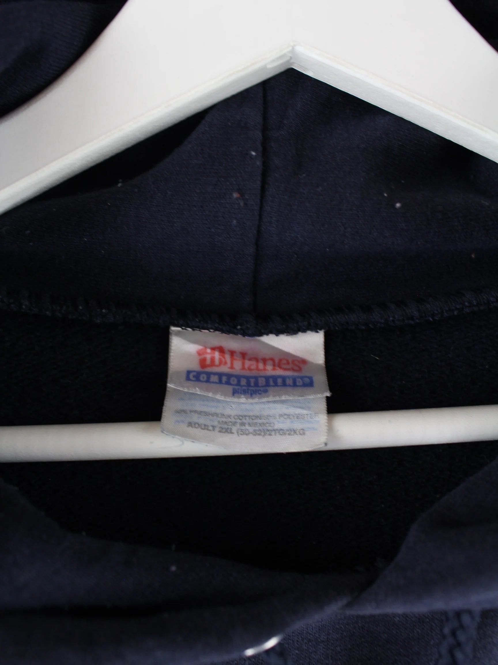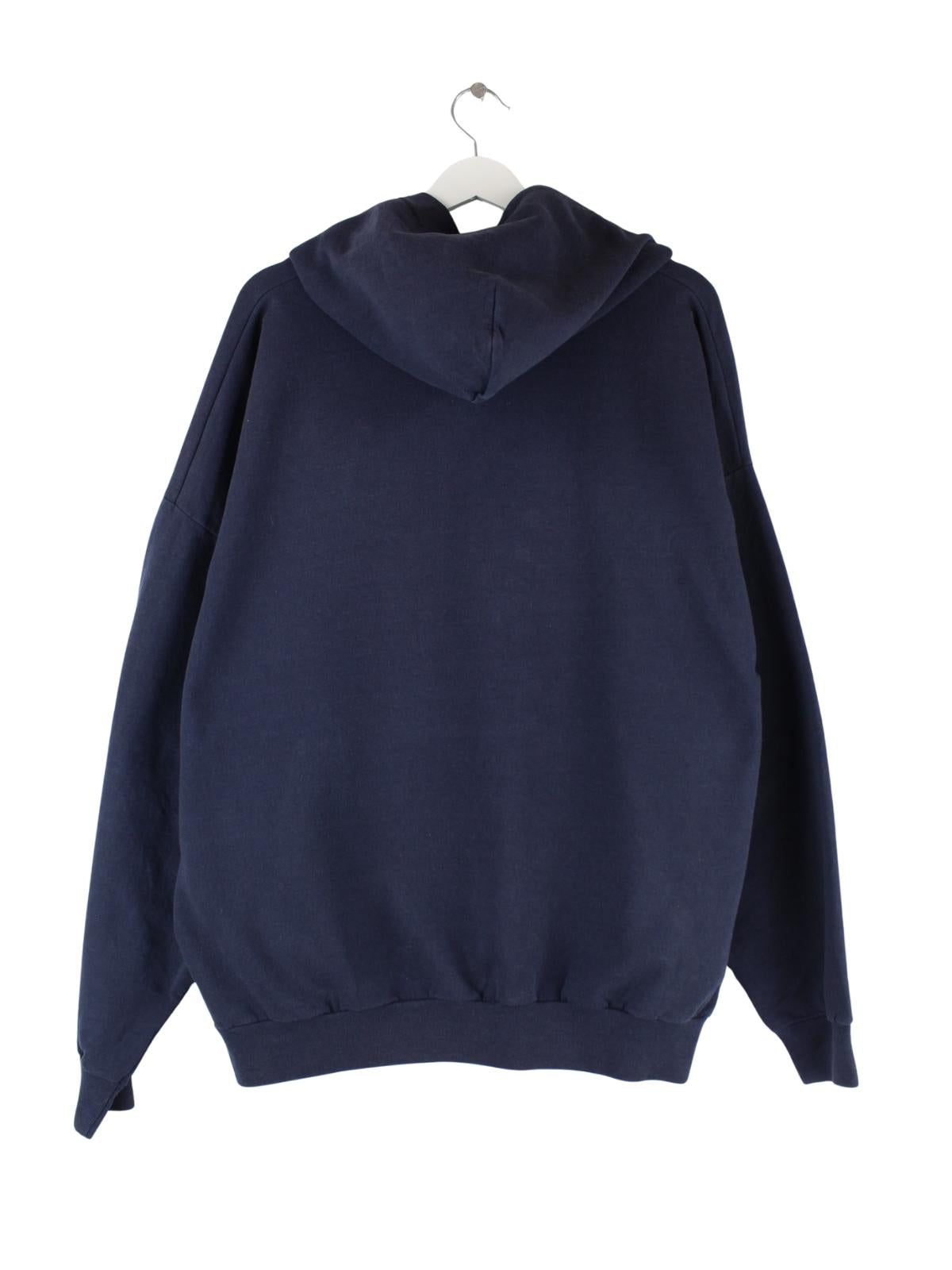Blauer Hoodie mit gestickten Motiven von Hanes in Größe XL. Er ist aus einer Baumwollmischung produziert und in sehr gutem Zustand in Stock.