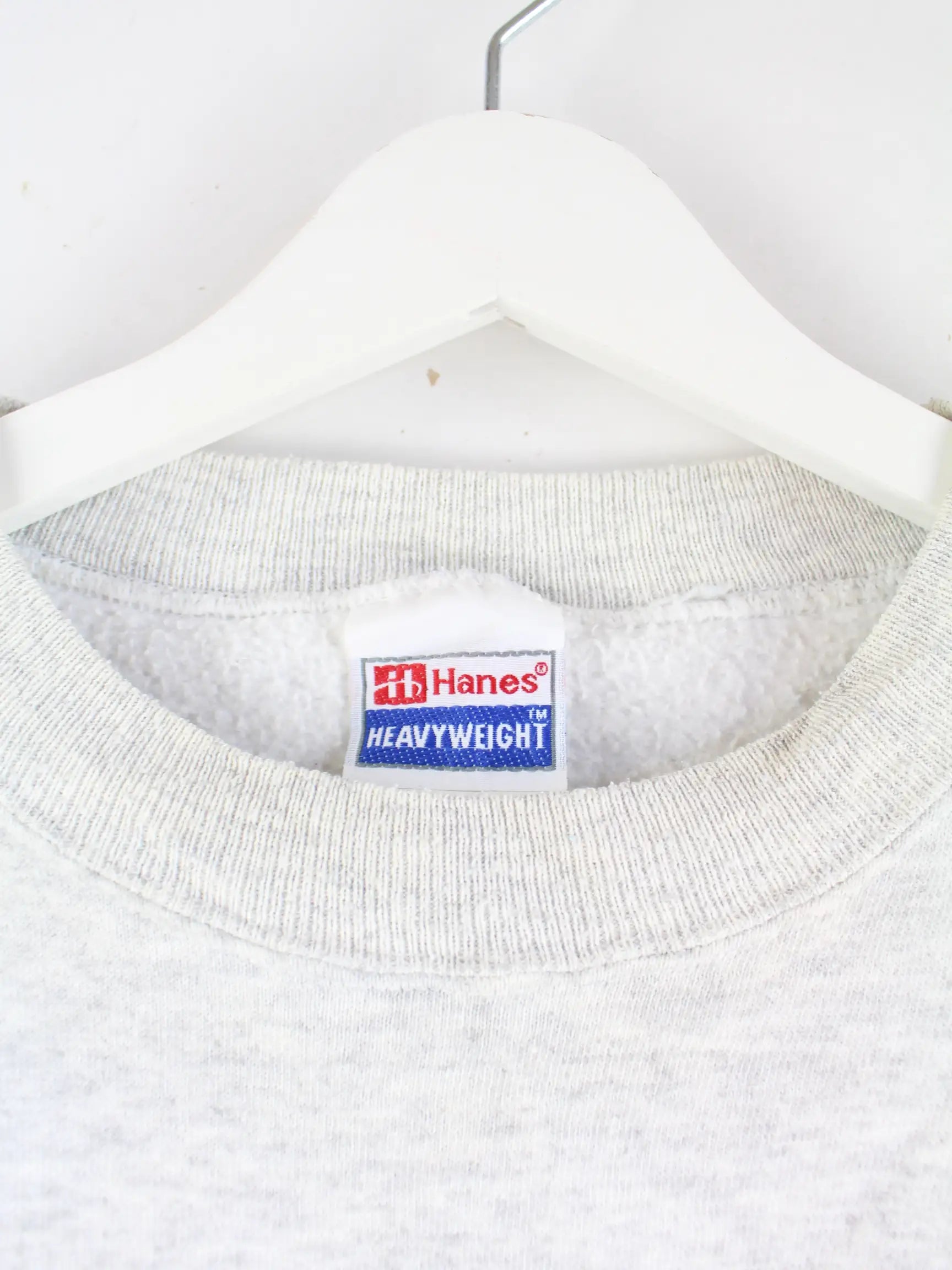 Grauer Sweater mit gesticktem Logo vom Label Hanes aus den 80'ern in Größe XL. Er ist aus einer Baumwollmischung gemacht und in gutem Zustand vorrätig.