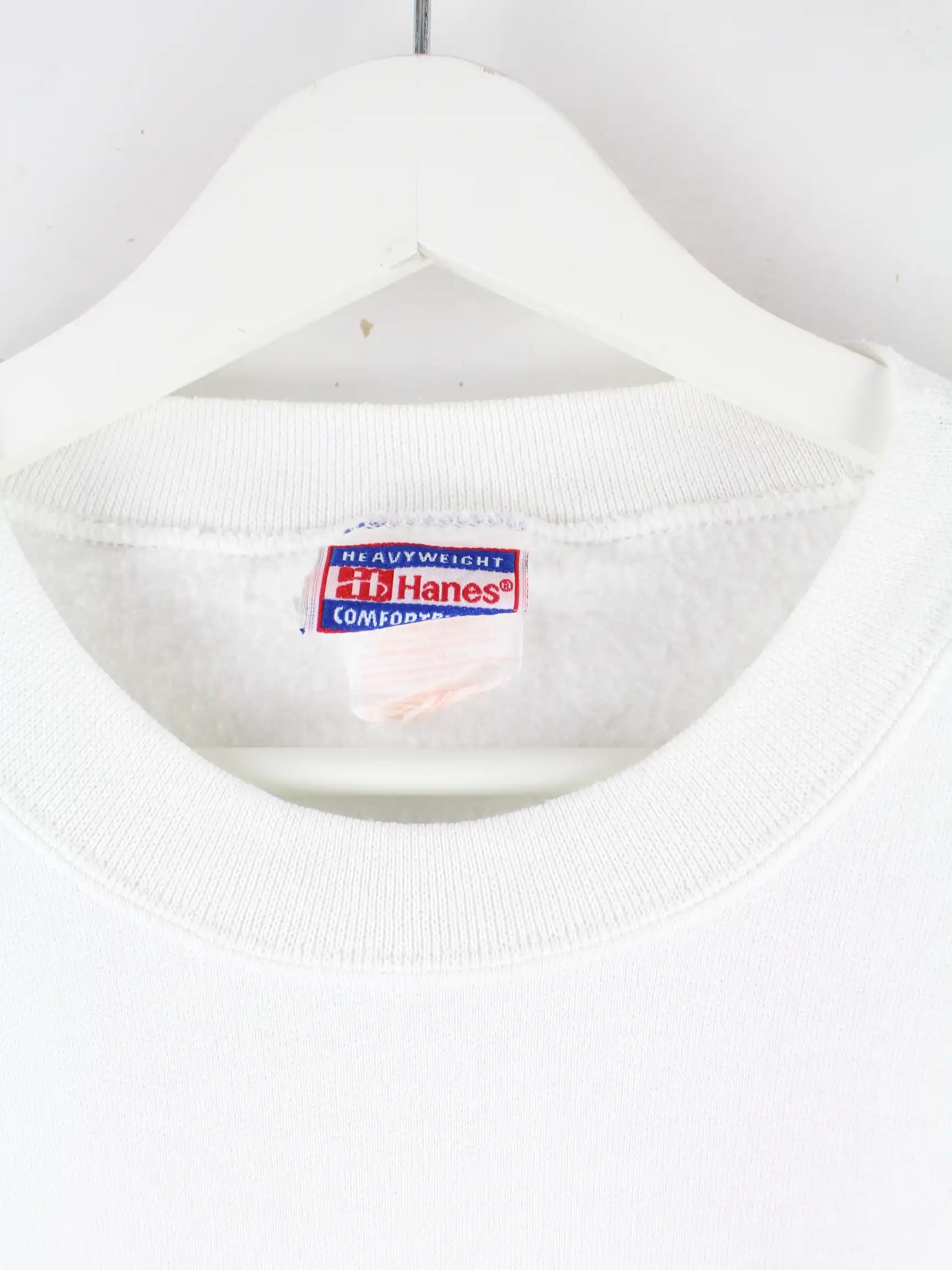 Sweater vom Label Hanes in Größe L aus den 90'ern. Er ist aus einer Baumwollmischung hergestellt und in Weiß im Bestand. Mit seltenem Competition Print.