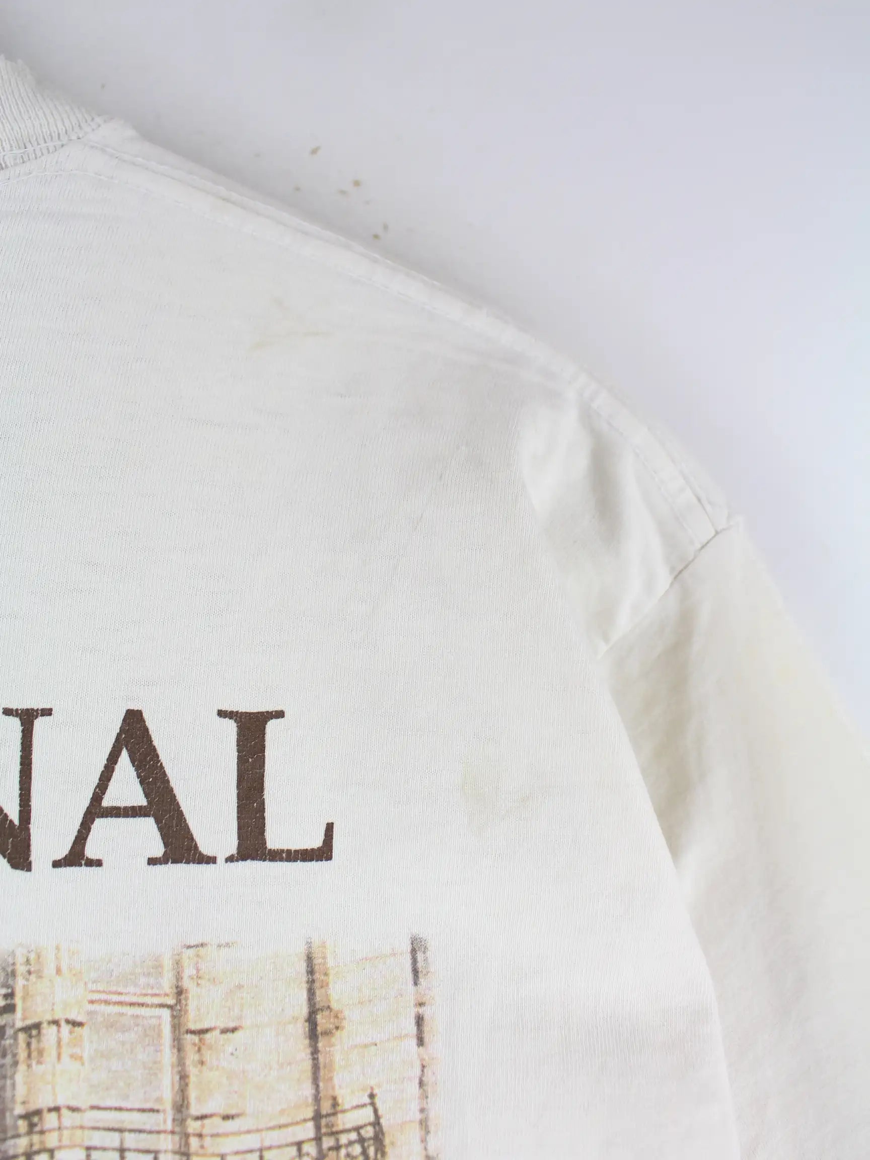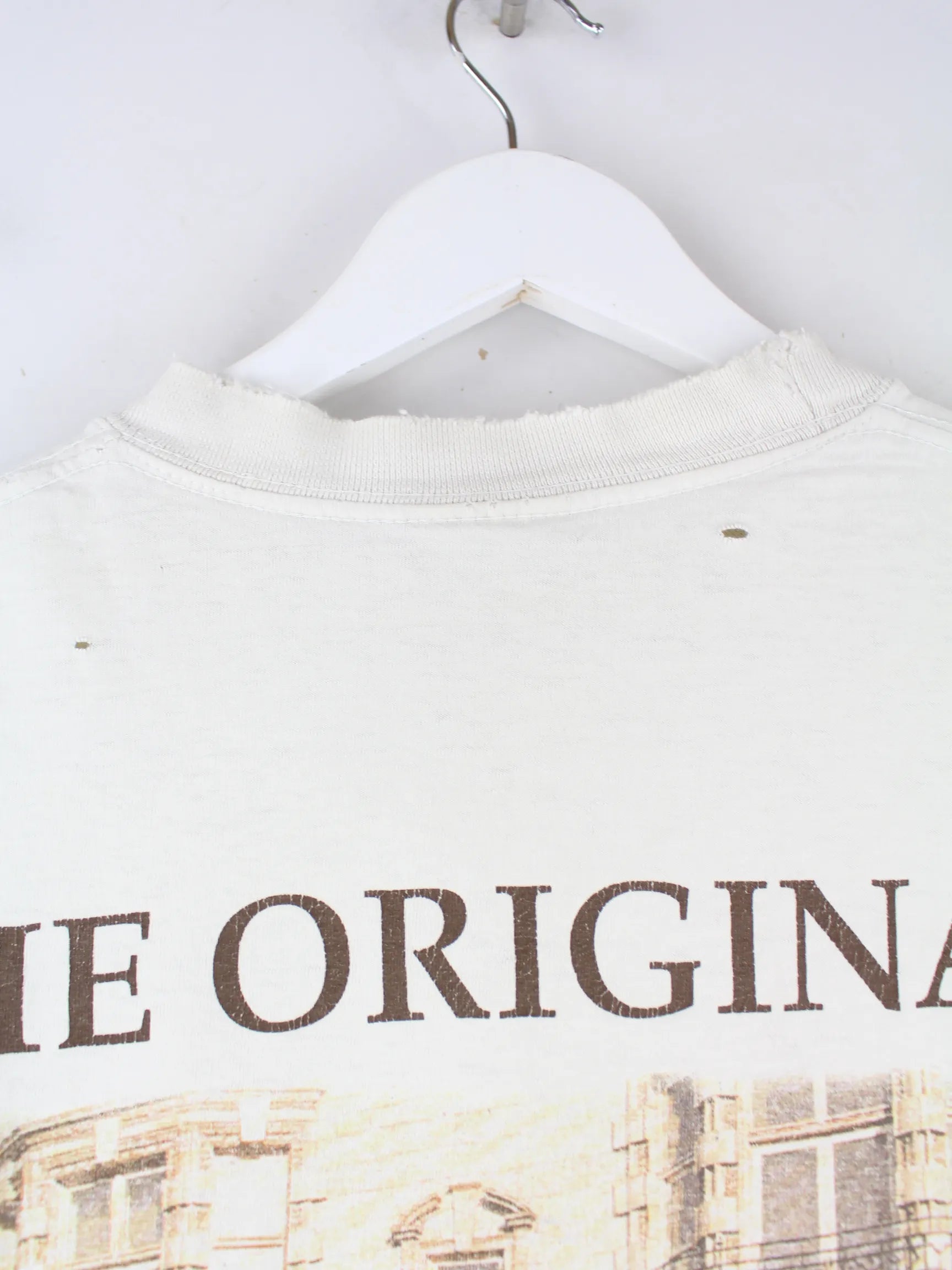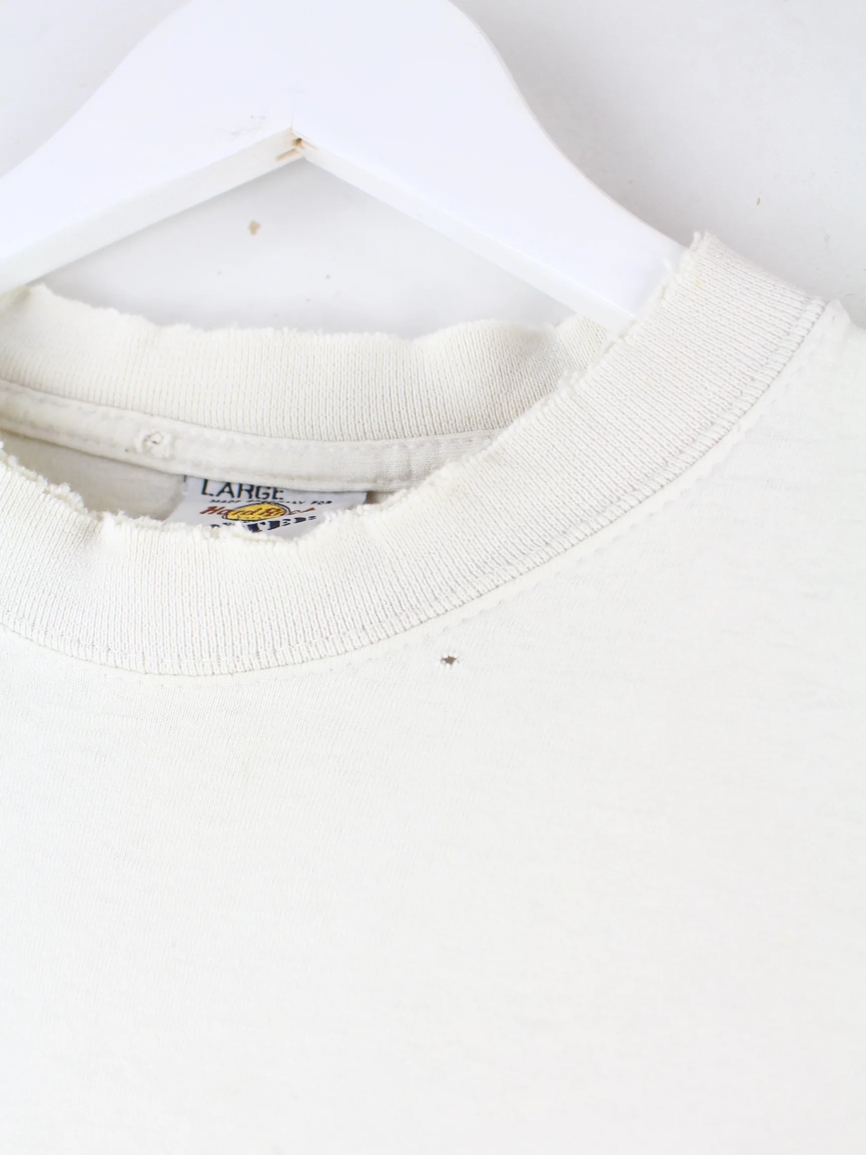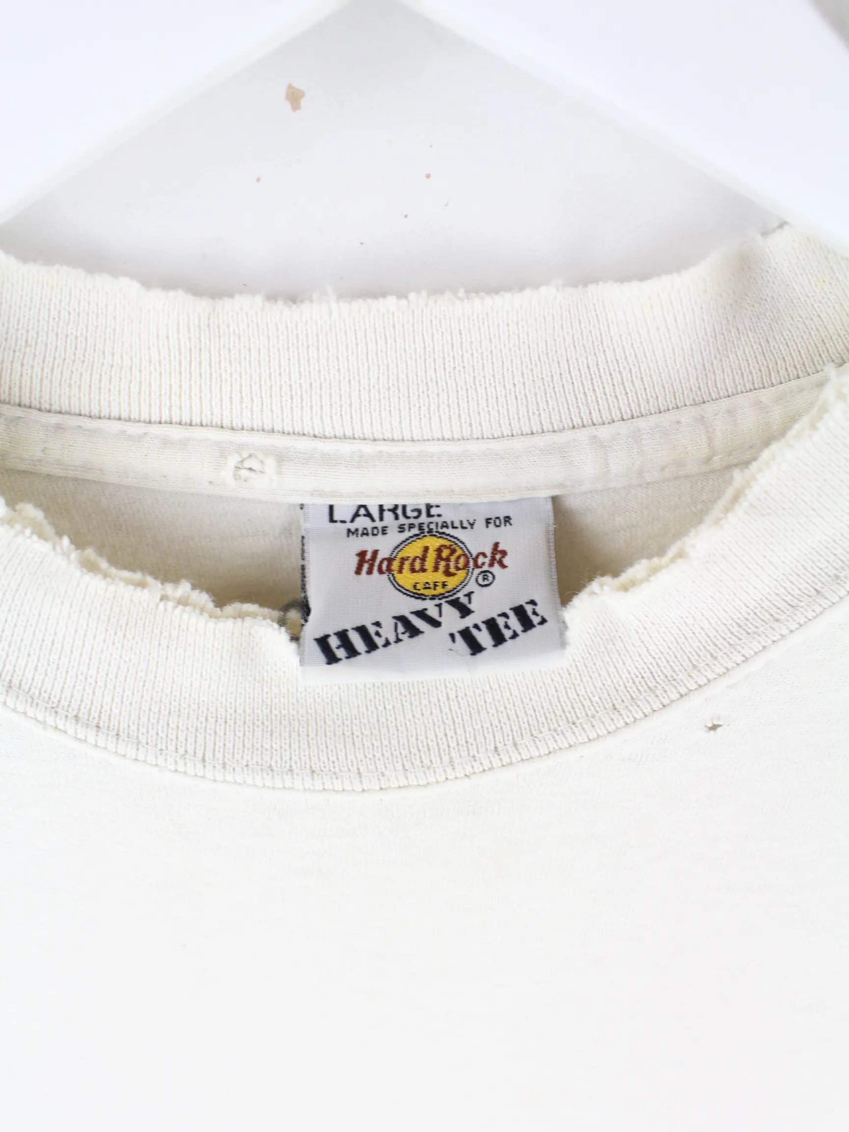 Weißes T-Shirt der Brand Hard Rock Cafe aus den 90'ern in Größe L. Es ist aus Baumwolle angefertigt. Den Zustand würden wir als 'In Ordnung' bezeichnen (vergl. Bilder).Mit tollem Original Print.