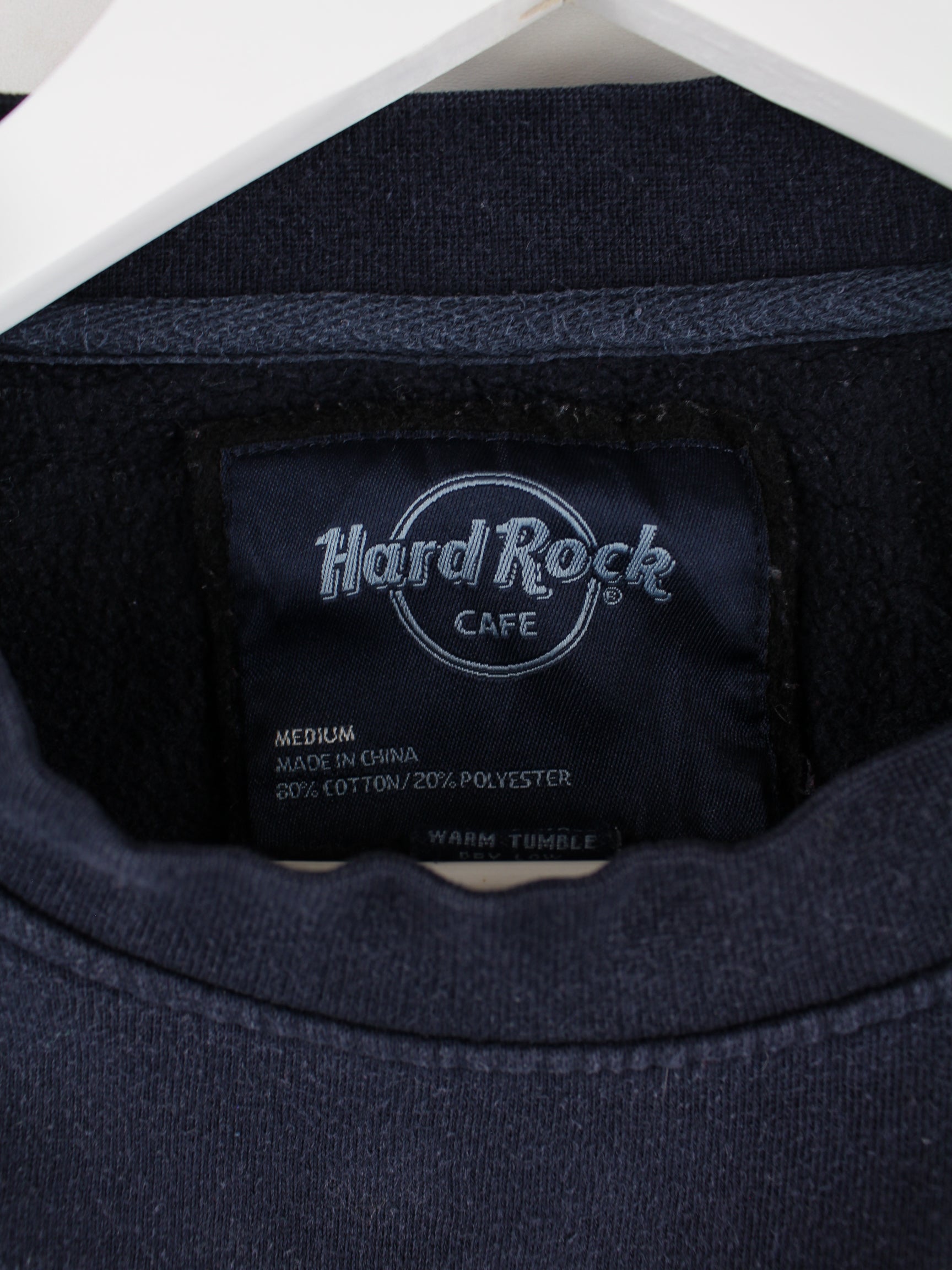 Blauer Sweater mit gesticktem Logo vom Brand Hard Rock Cafe in Größe M. Er ist aus einer Baumwollmischung gefertigt und in sehr gutem Zustand auf Lager.