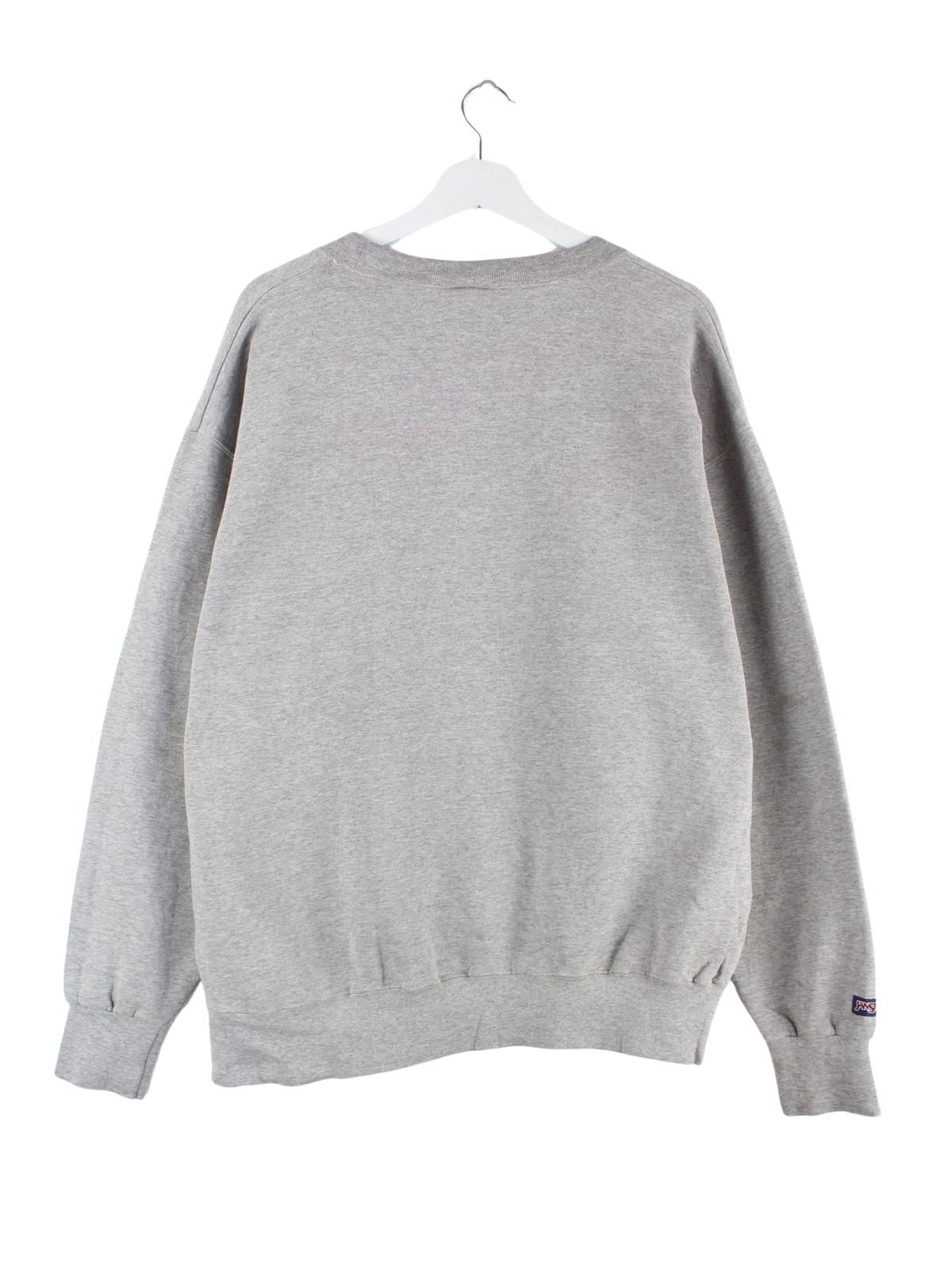 Sweater der Brand Jansport mit gestickten Motiven in Größe L aus den 90'ern. Er ist aus einer Baumwollmischung angefertigt und in Grau im Bestand.