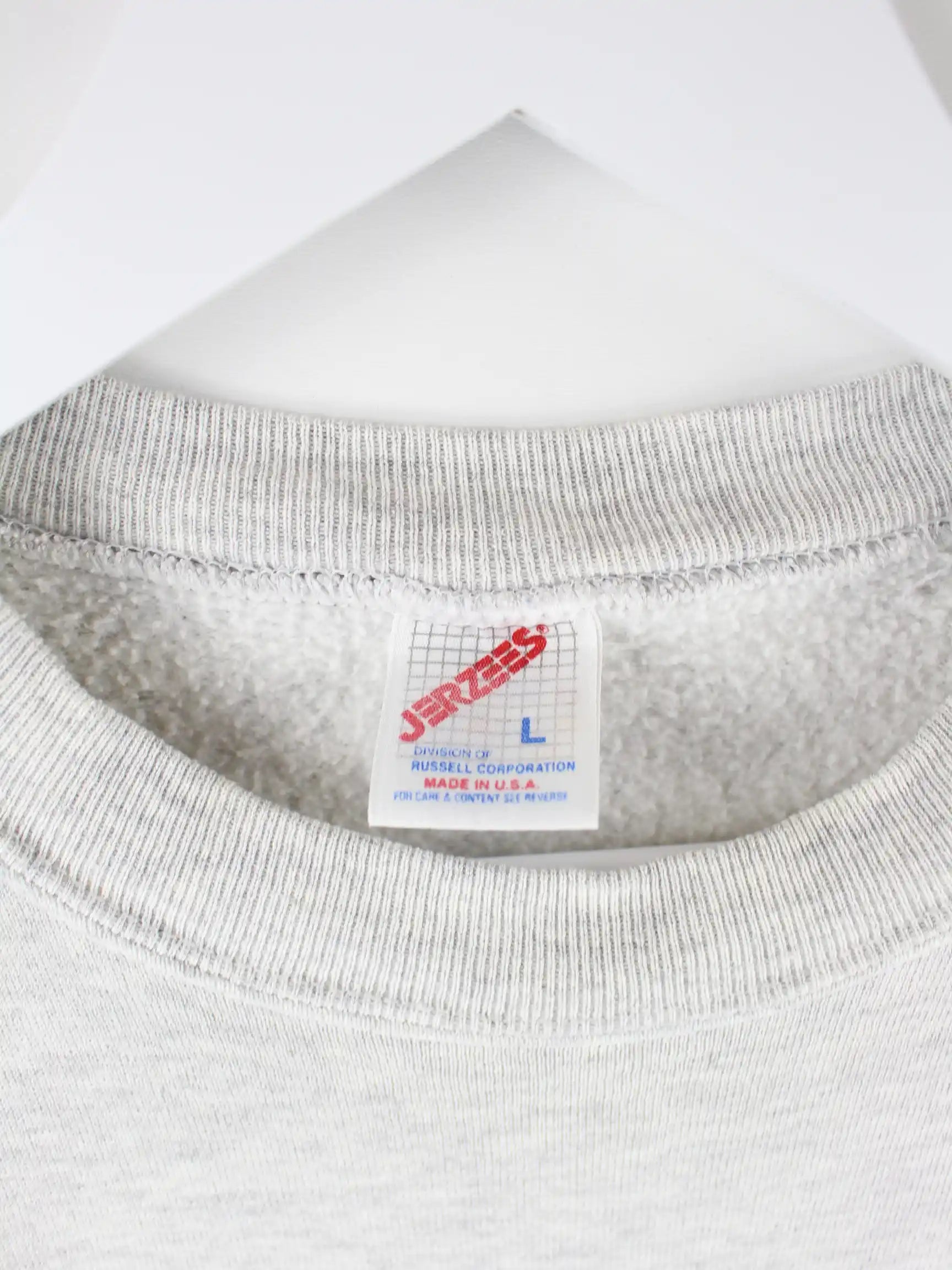 Sweater des Labels Jerzees in Größe L aus den 90'ern. Er ist aus einer Baumwollmischung gefertigt und in Grau zu haben. Mit schickem Patriots Print.