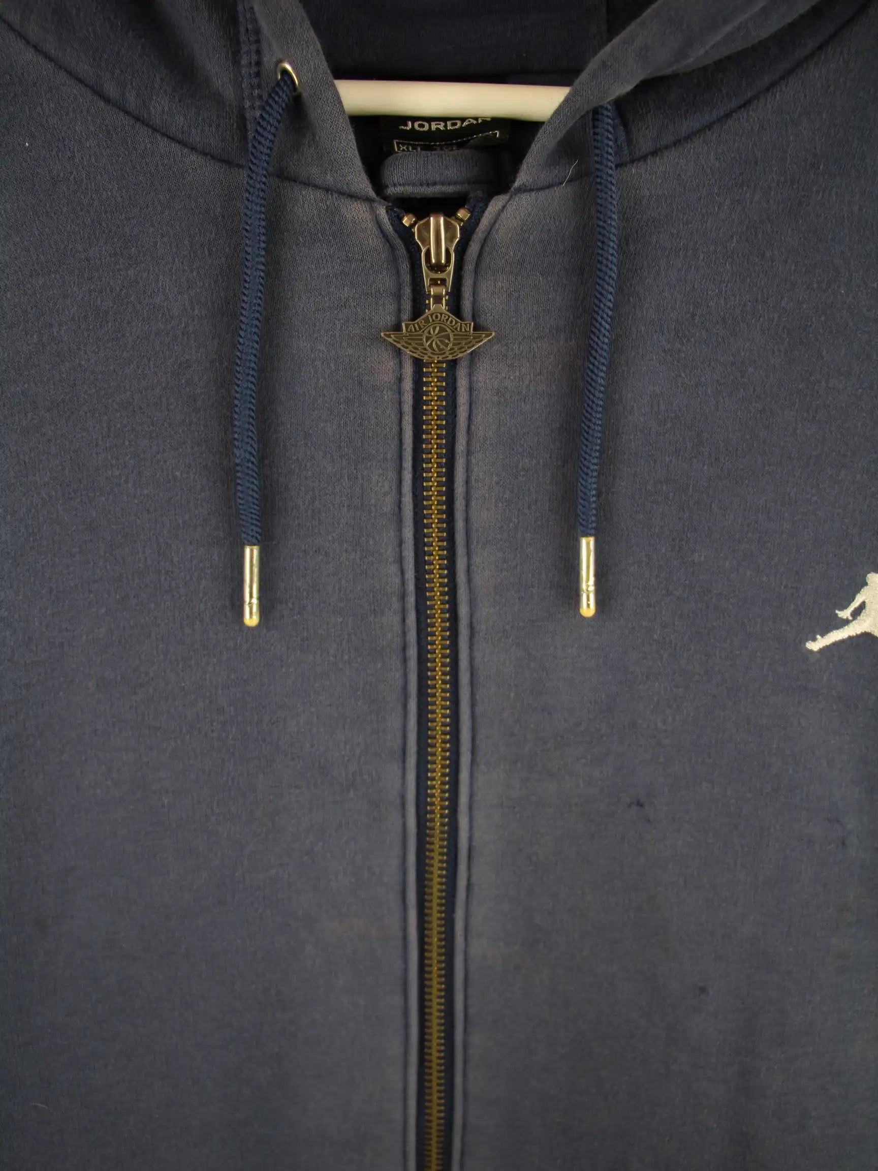 Hoodie der Marke Jordan mit Reißverschluß in Größe 3XL. Er ist aus einer Baumwollmischung gemacht und in Blau auf Lager.