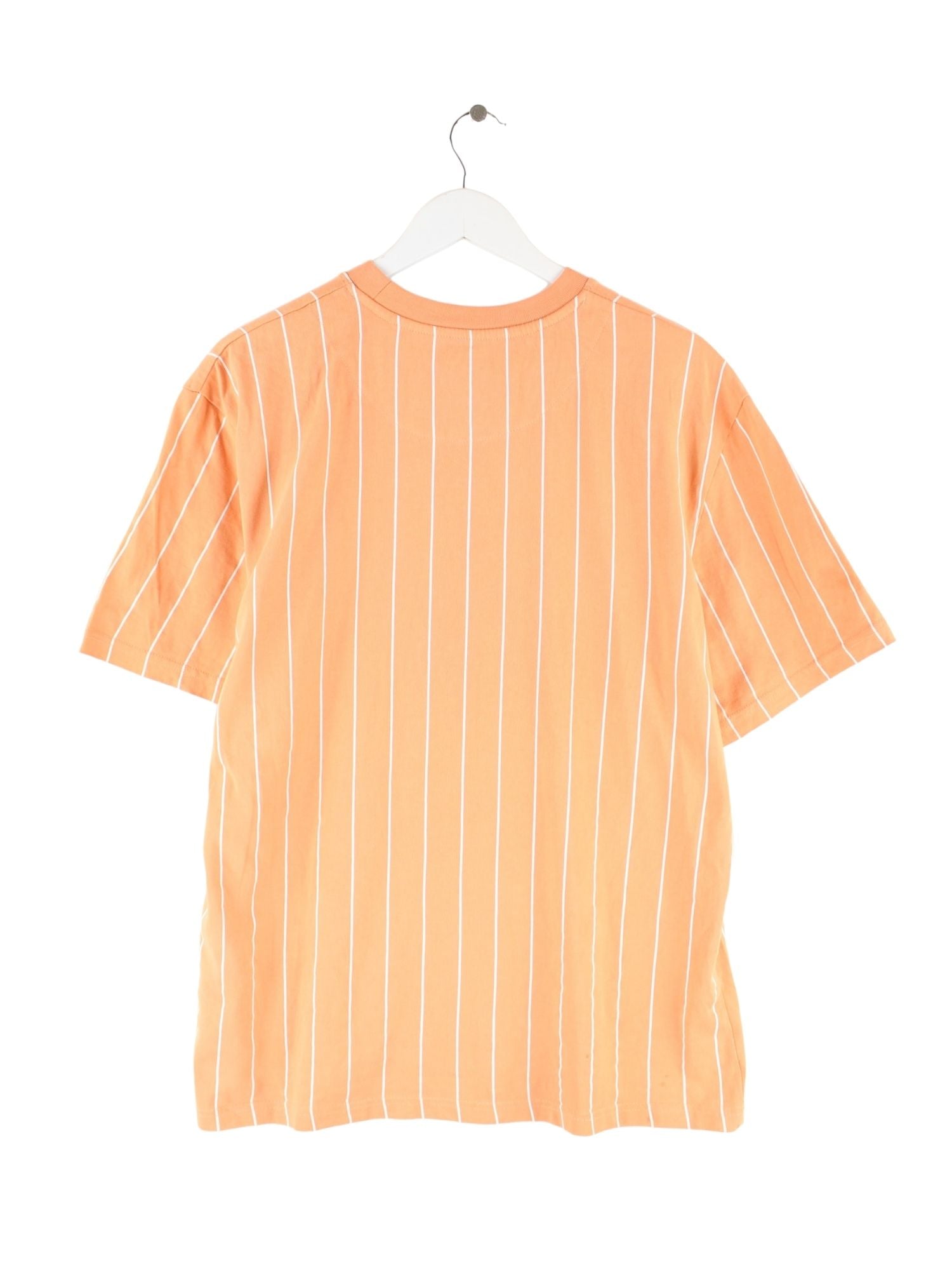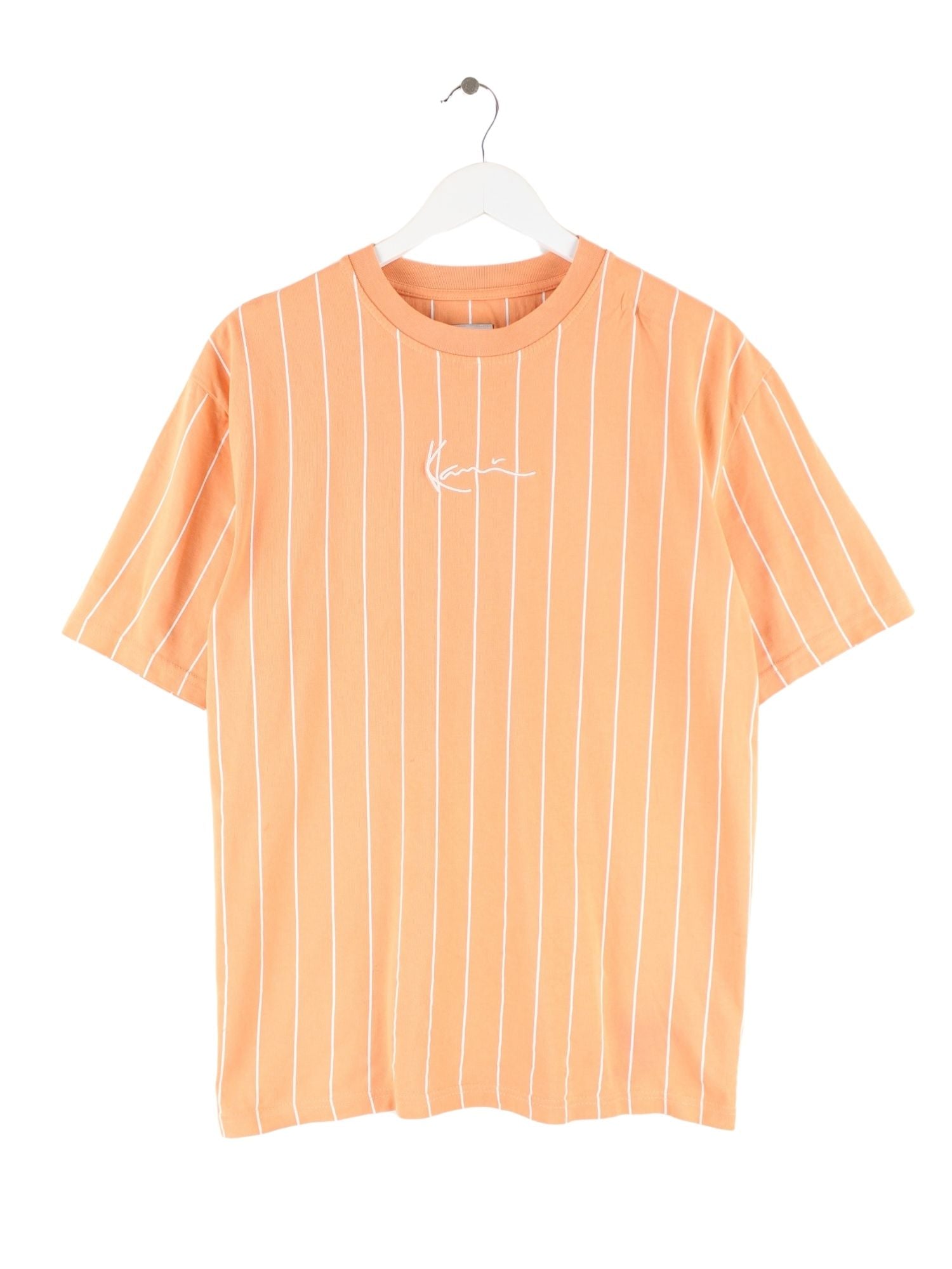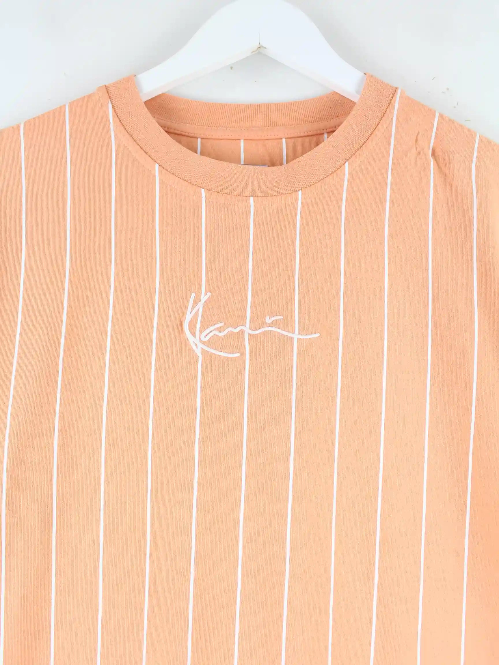 Orangefarbenes T-Shirt mit Stickereien aus dem Hause Karl Kani in Größe S. Es ist aus Baumwolle gemacht. Den Zustand würden wir als 'In Ordnung' bezeichnen (vergl. Bilder).