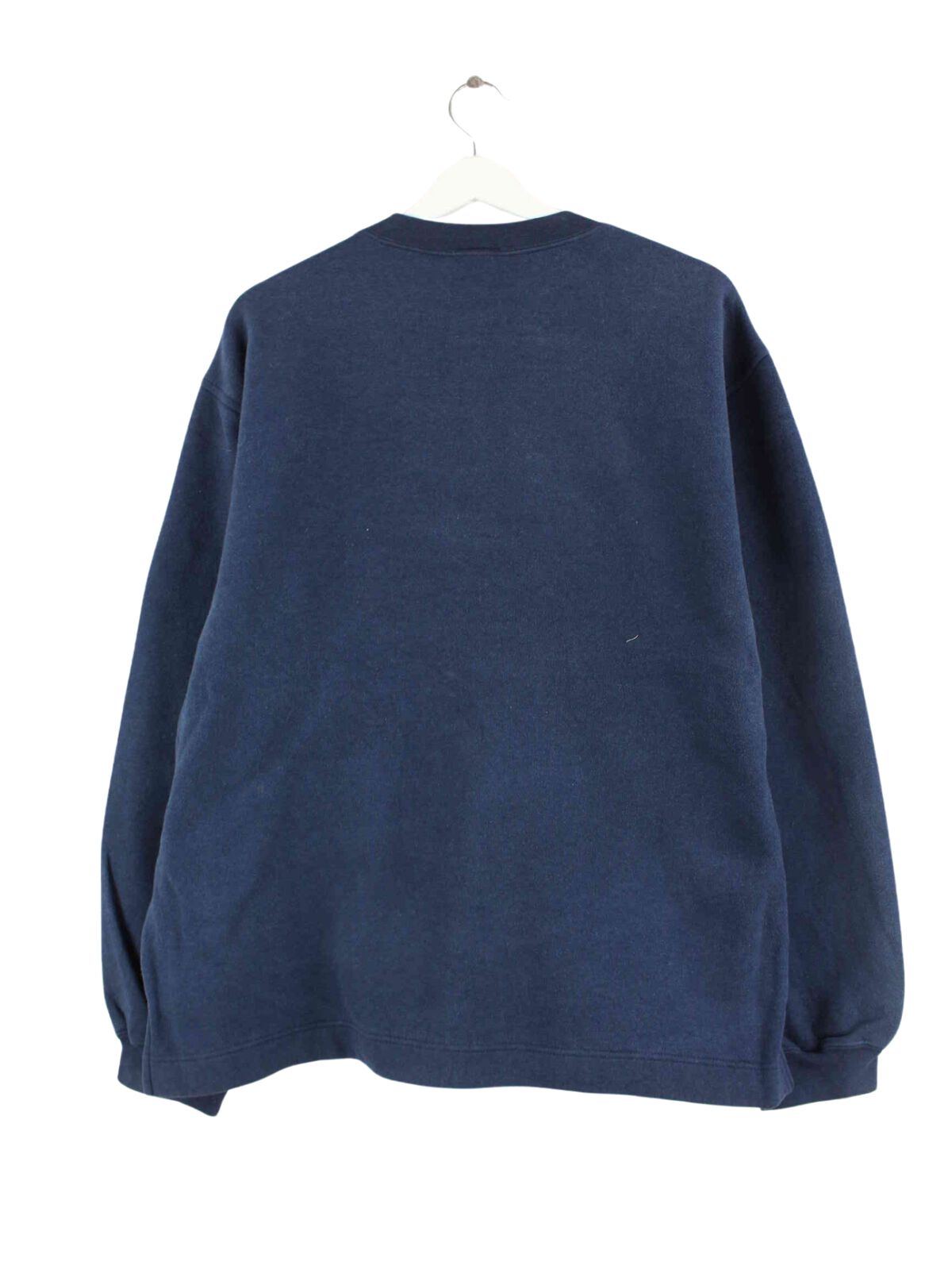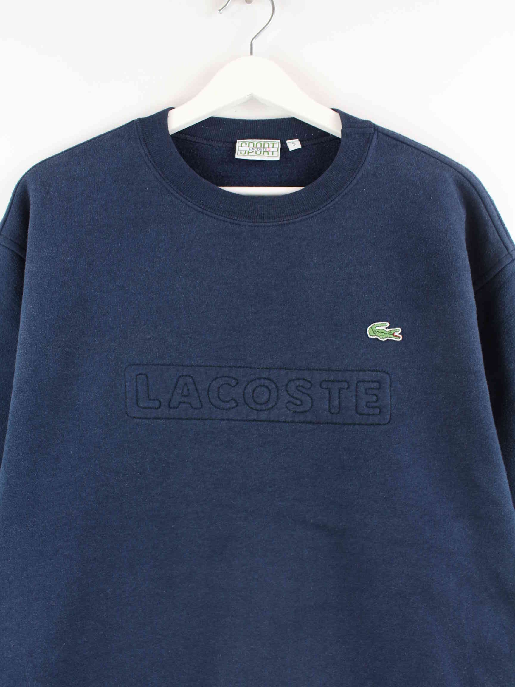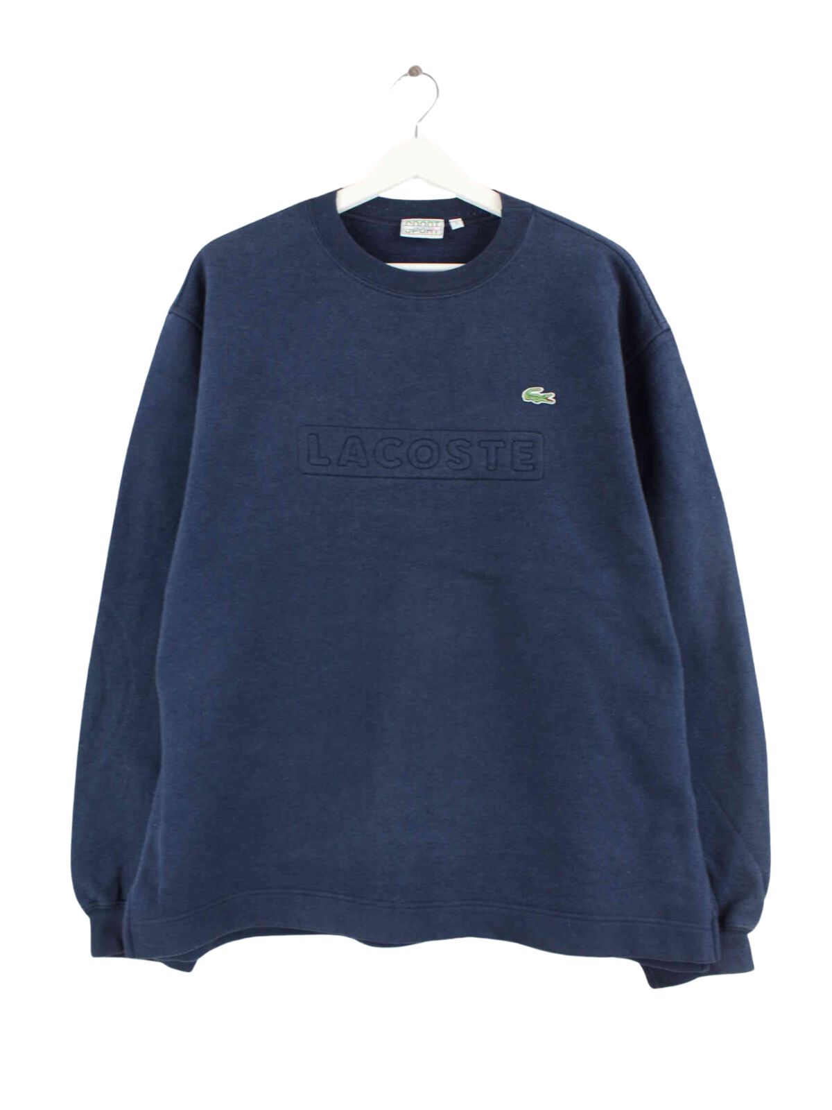 Blue sweater with embroidery from the Lacoste brand in size L. It is made from a cotton blend and is in stock in very good condition.