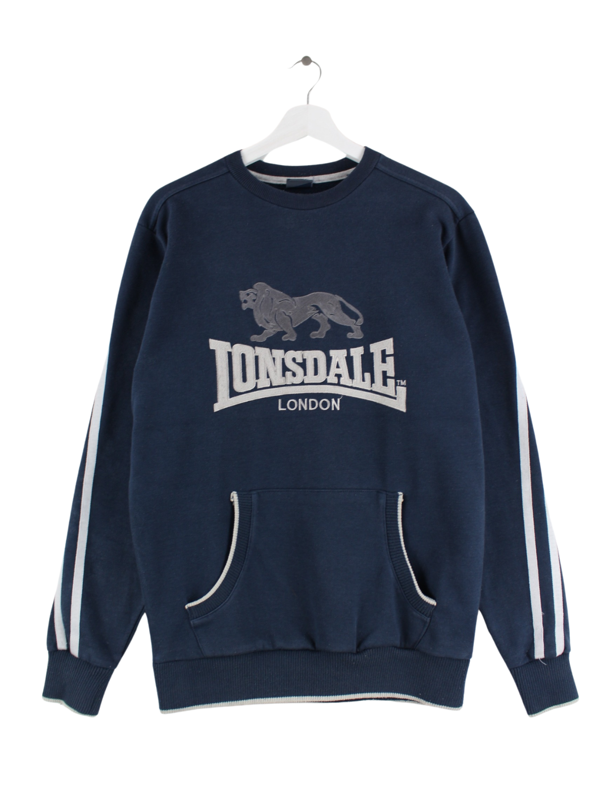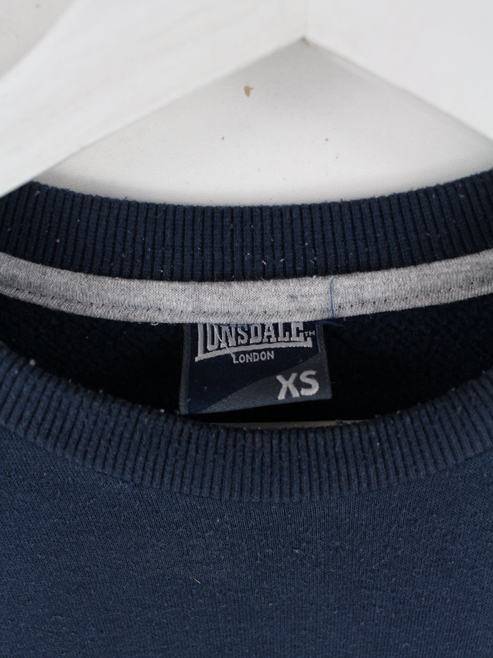 Sweater des Labels Lonsdale mit Stick in Größe XS. Er ist aus einer Baumwollmischung produziert und in Blau lieferbar.
