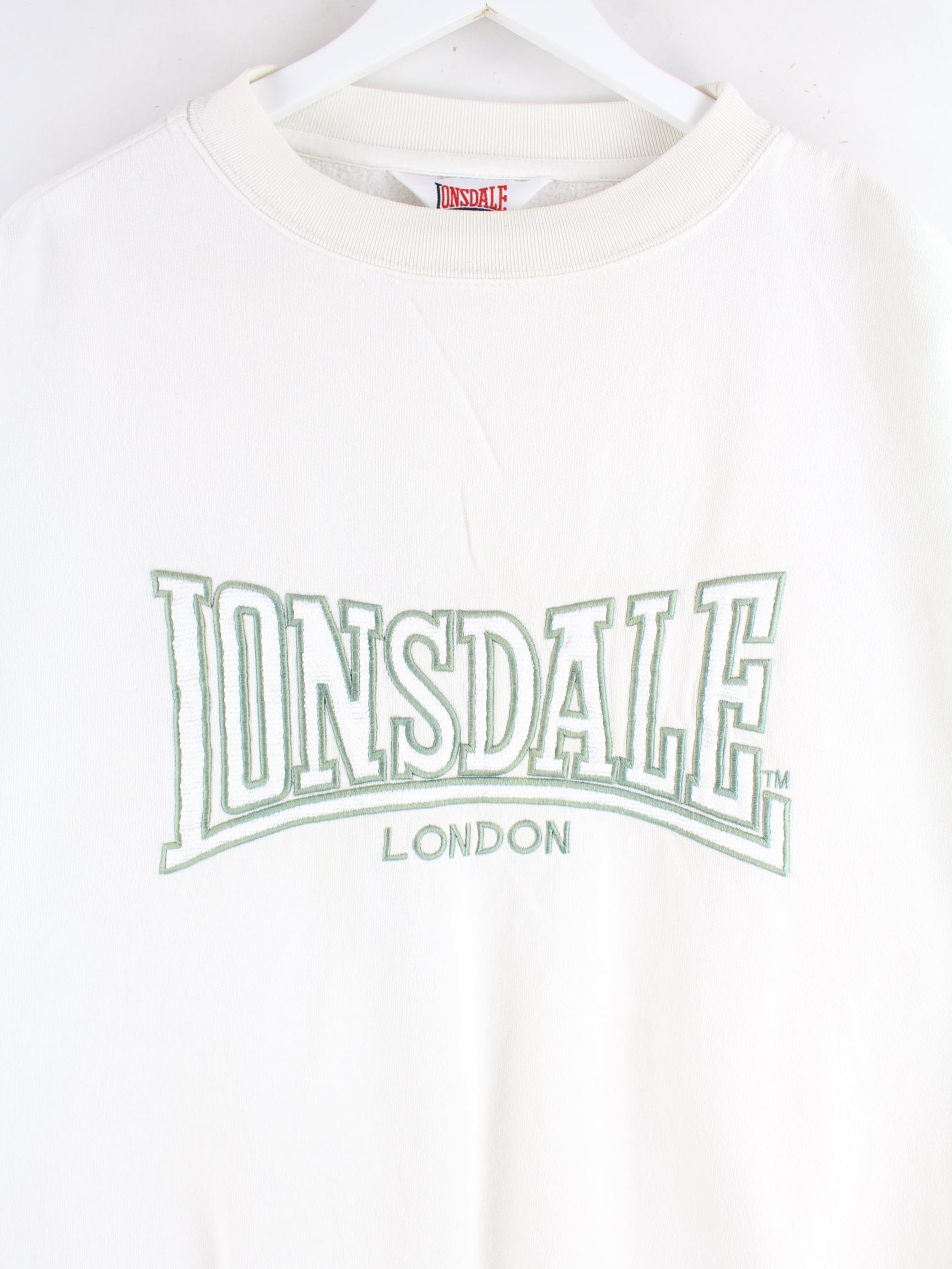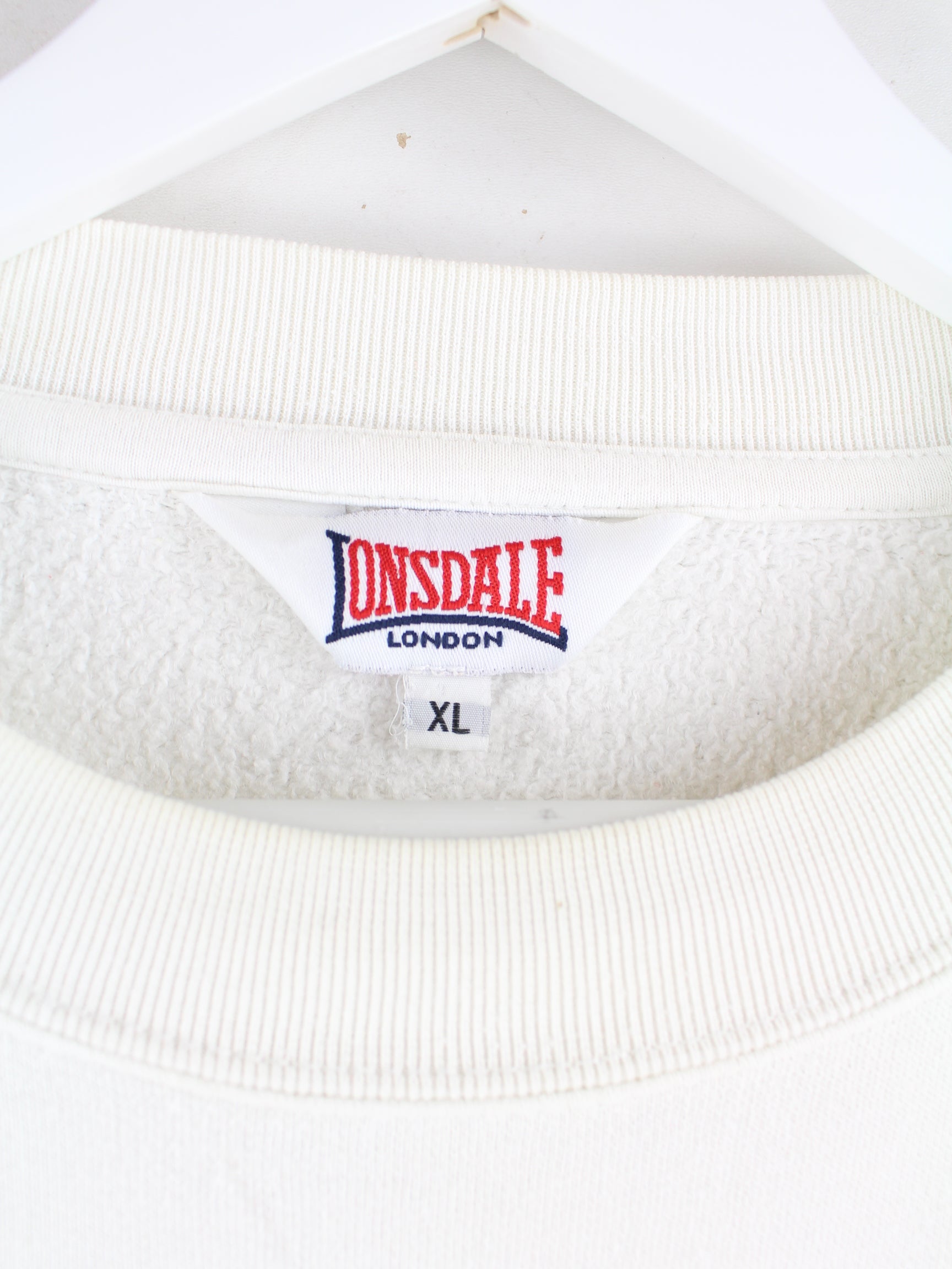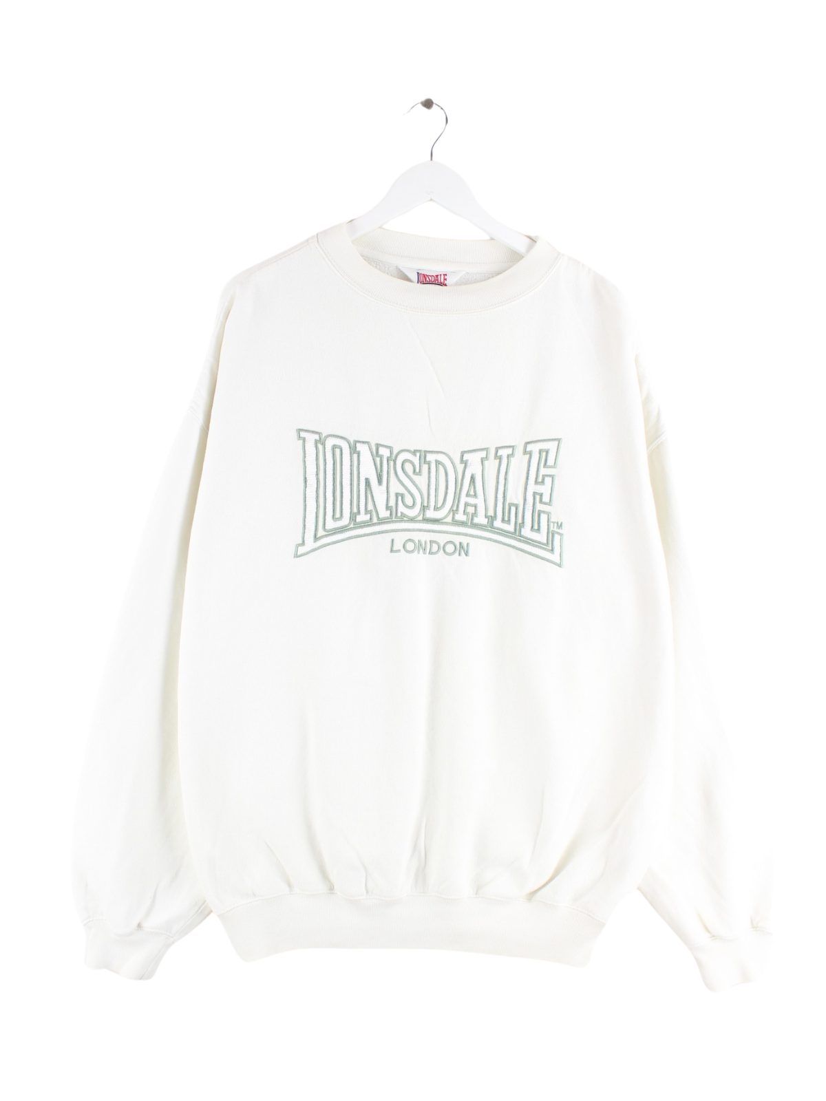 Weißer Sweater mit Stickereien des Labels Lonsdale aus den 90'ern in Größe XL. Er ist aus einer Baumwollmischung gefertigt und in gutem Zustand vorrätig.