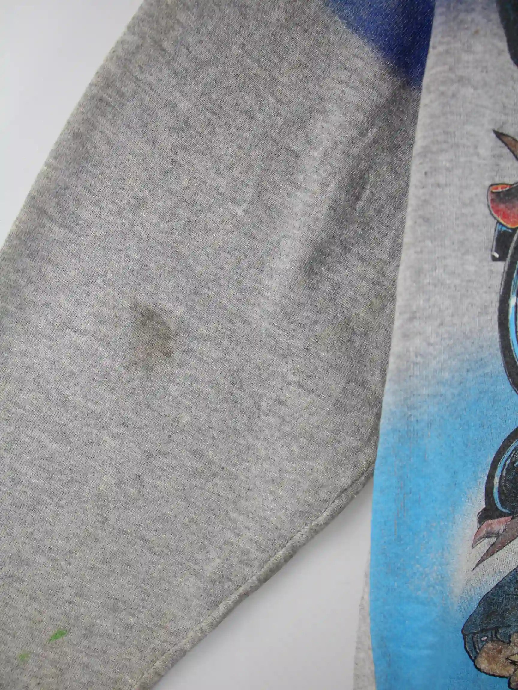 Sweater vom Label Looney Tunes in Größe L aus den 90'ern. Er ist aus einer Baumwollmischung angefertigt und in Grau in Stock. Mit tollem Biker Print.