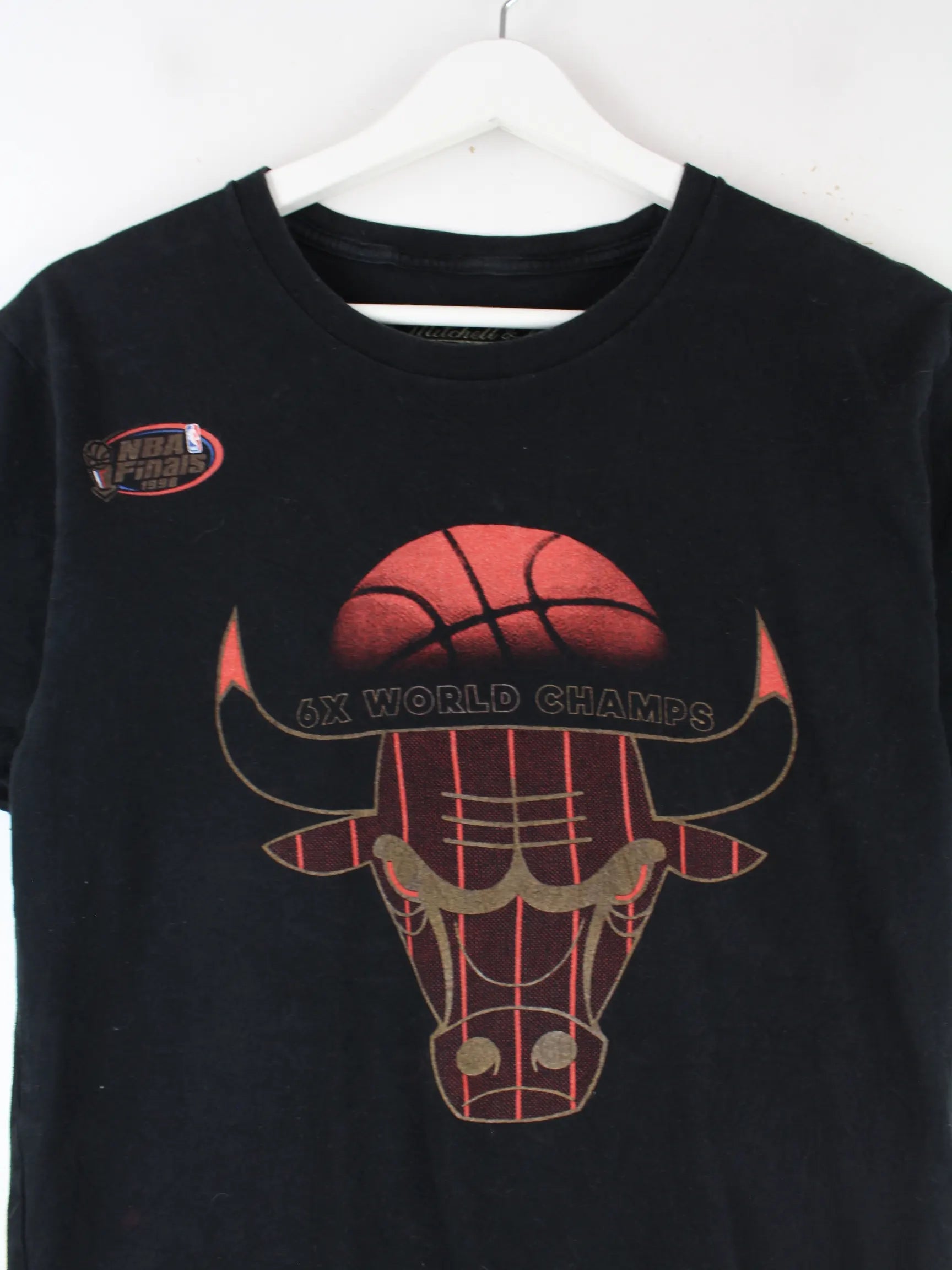 T-Shirt des Labels Mitchell & Ness in Größe S. Es ist aus Baumwolle angefertigt und in Schwarz im Angebot. Mit tollem Bulls Print.