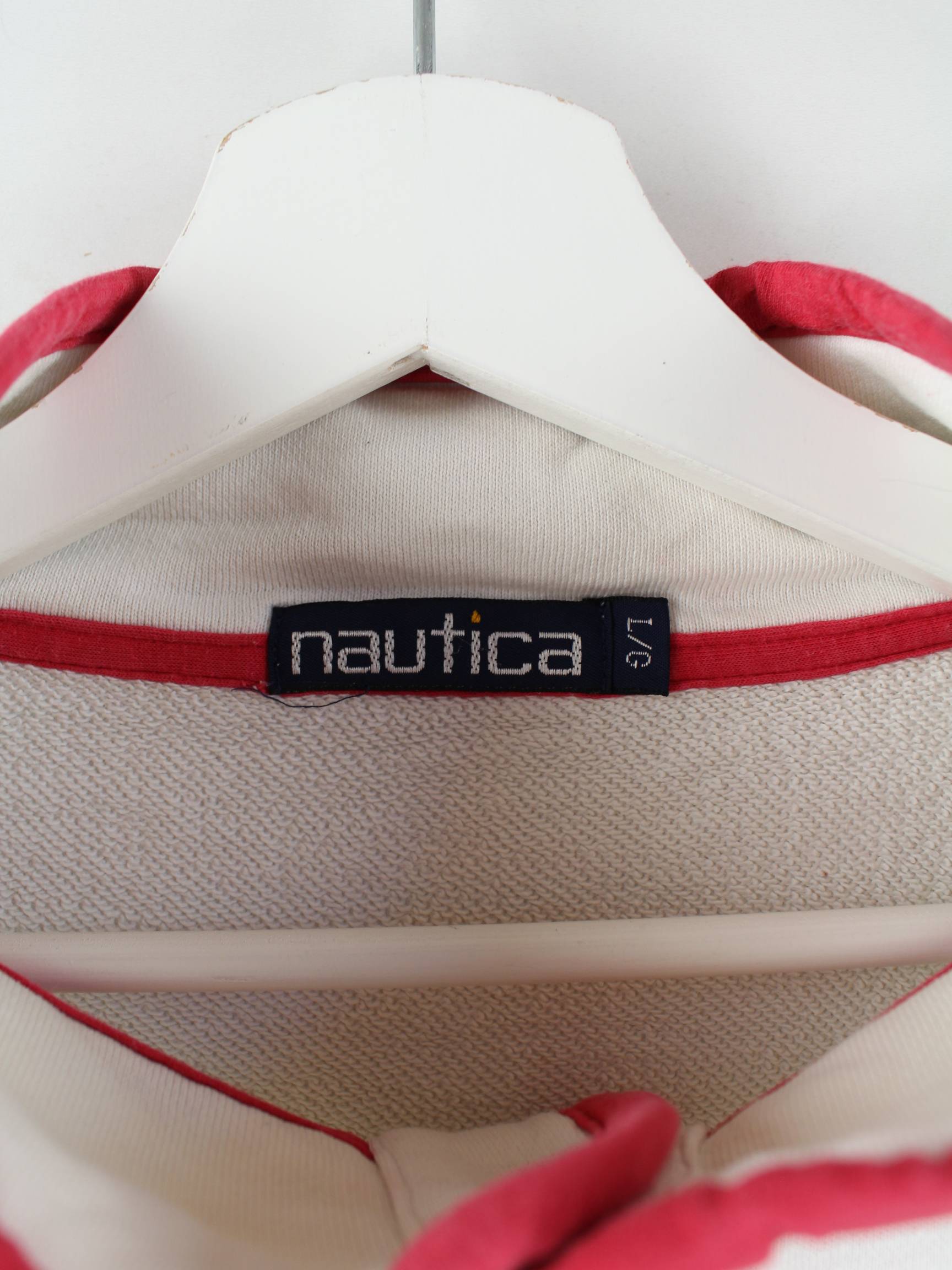 Weißer Sweater mit Stick von Nautica aus den 90'ern in Größe XXL. Er ist aus einer Baumwollmischung angefertigt und in gutem Zustand in Stock.